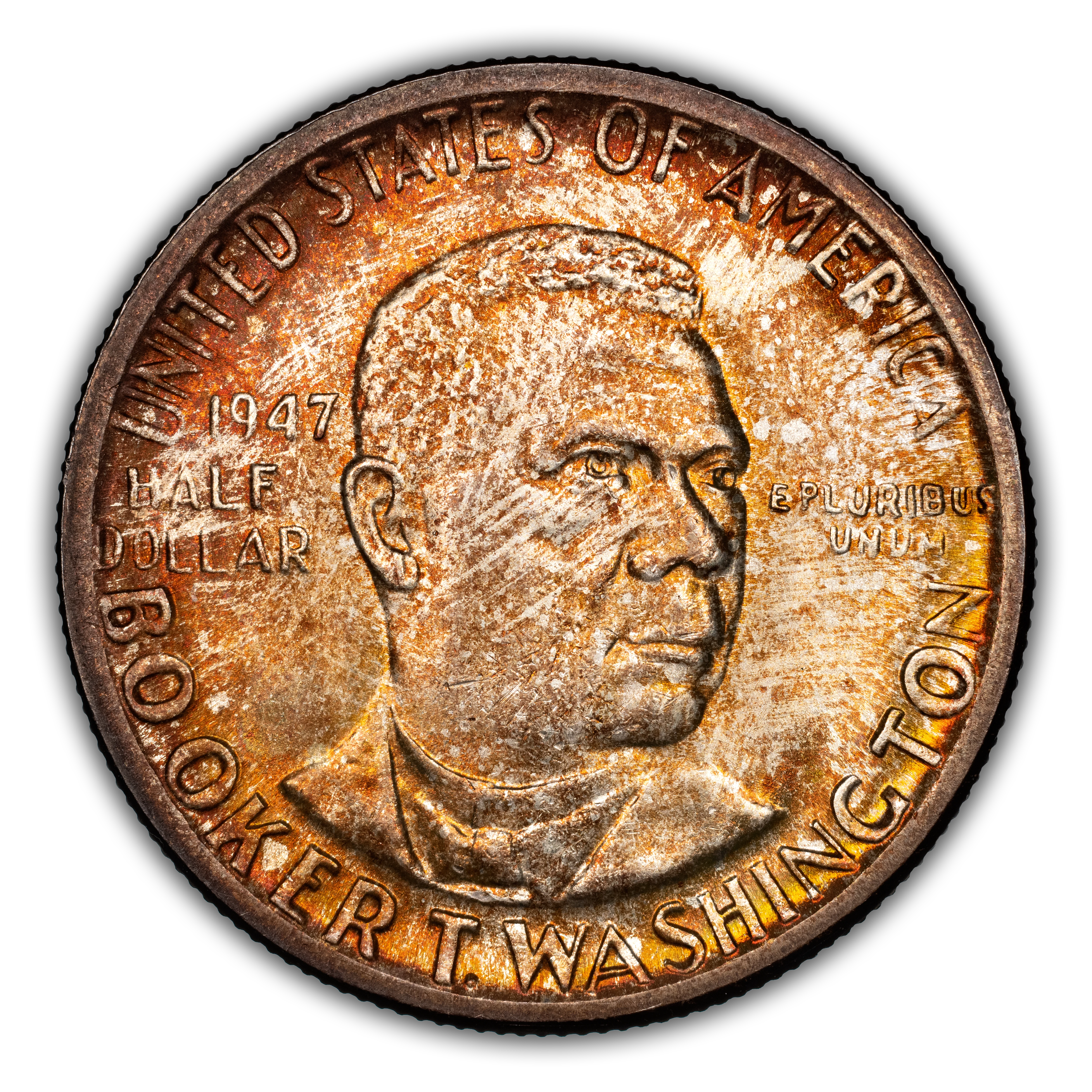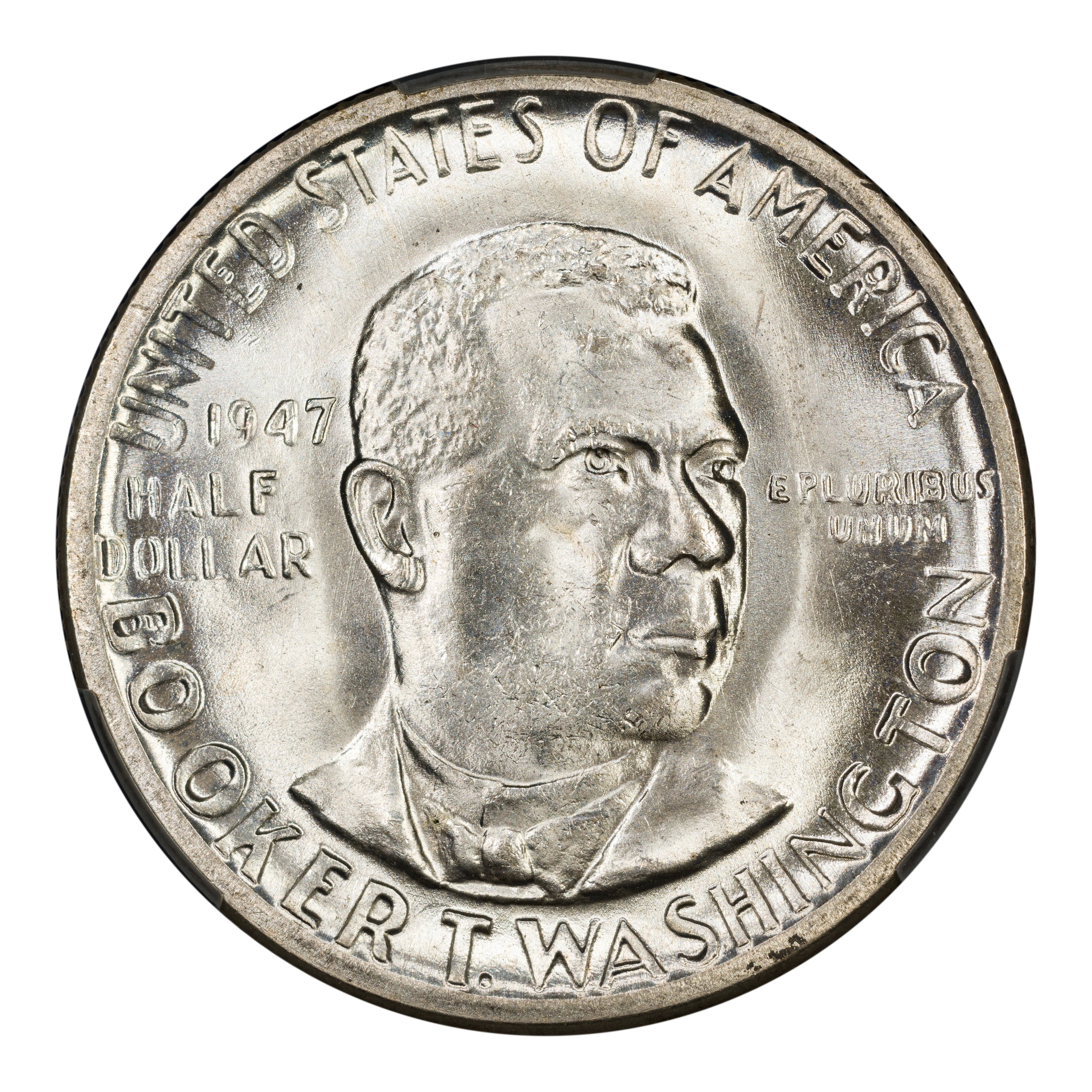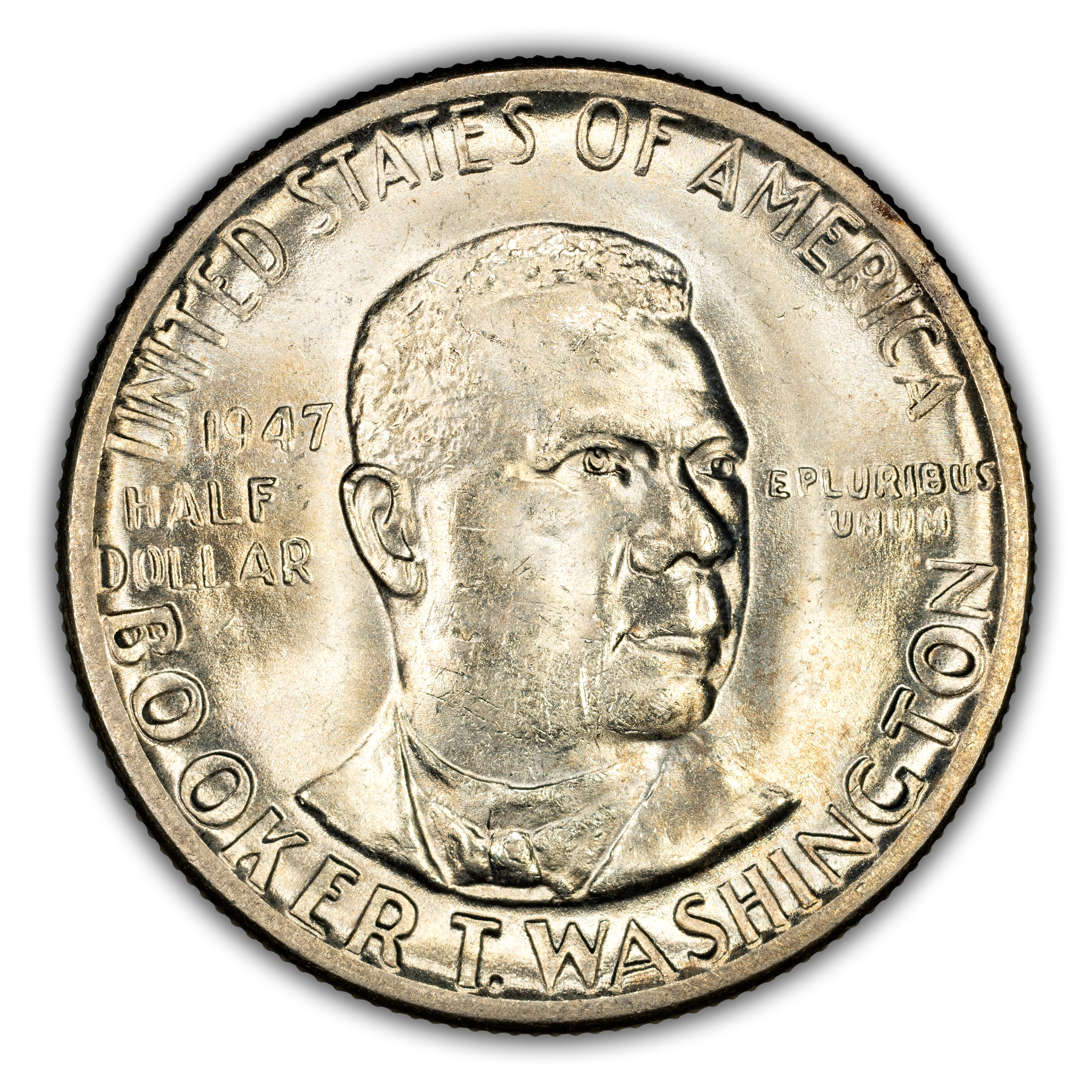 The 1947 Booker T. Washington halves mark the second year of issue for this long-running commemorative type that continued until 1951. The issuance of the Booker T. Washington half dollar came at an important time for the civil rights scene, when the battle to end segregation was building steam just after the end of the World War II. The Booker T. Washington half dollar was designed by Isaac Scott Hathaway, -- noted African American artist and the first black person to design -- U.S. commemorative coin.