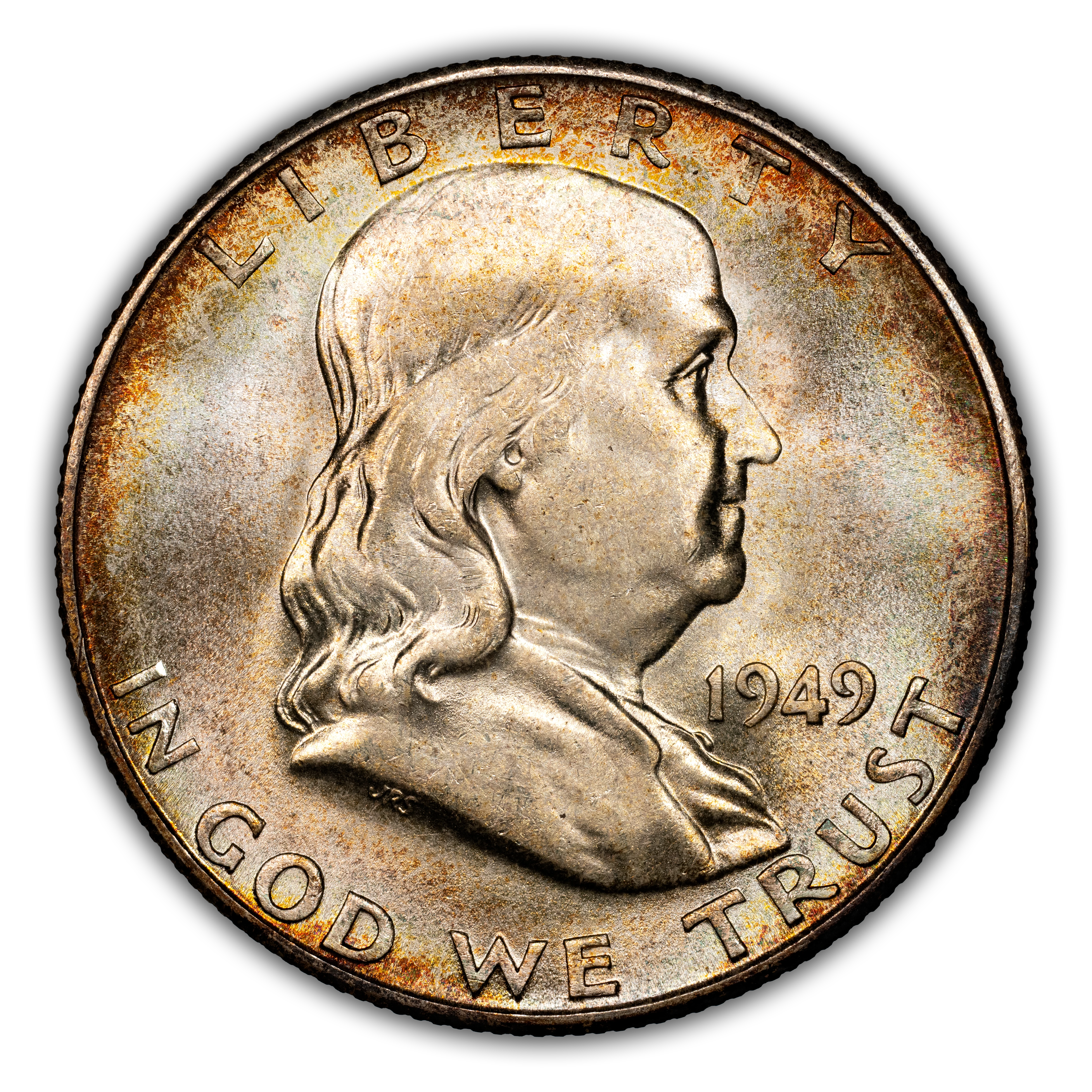 Reverse: The Liberty bell is prominently featured with the words UNITED STATES OF AMERICA and HALF DOLLAR around the periphery. The motto, E PLURIBUS UNUM is left of the bell, with a eagle -- wings fully spread -- to the right. The mint mark appears centered just above the bell.