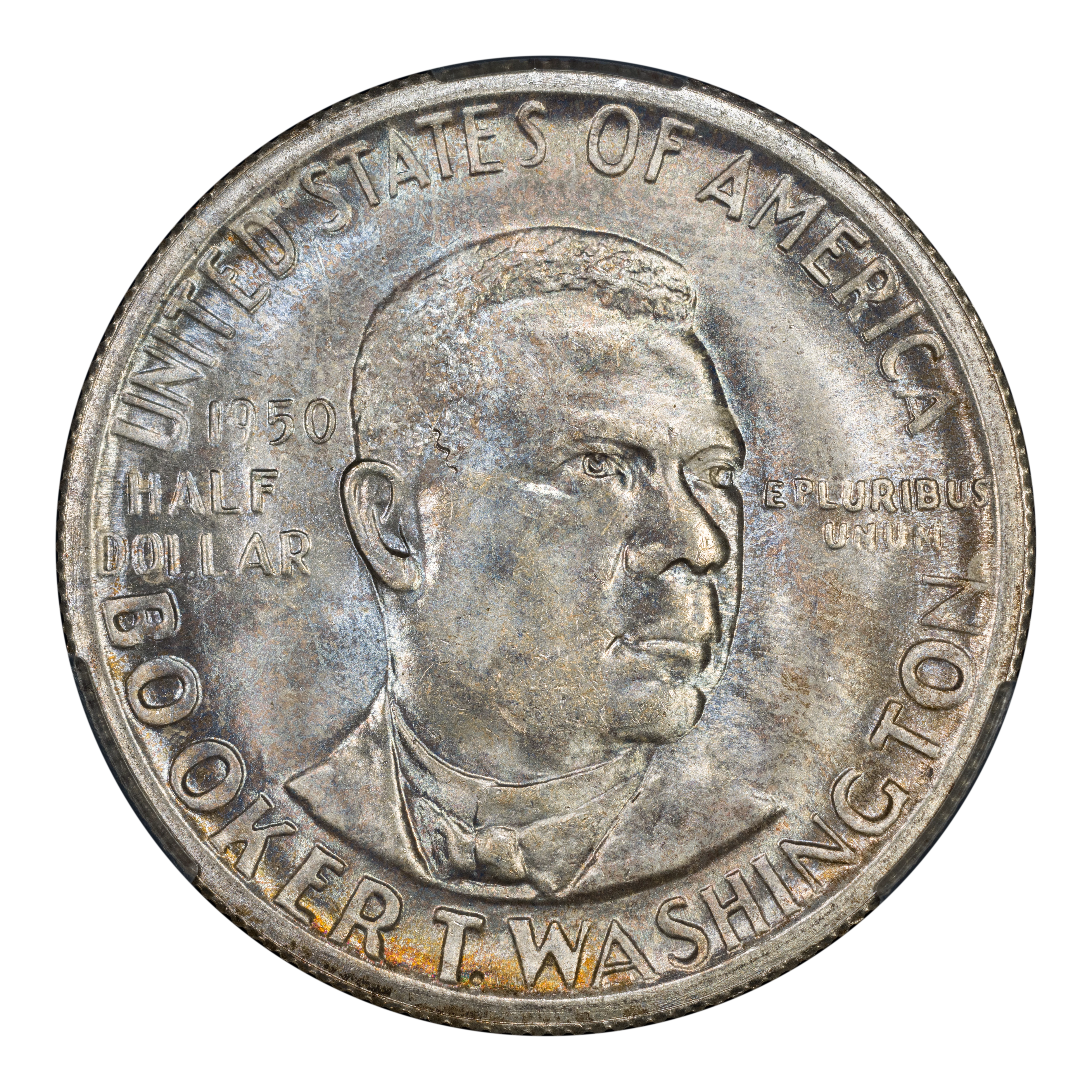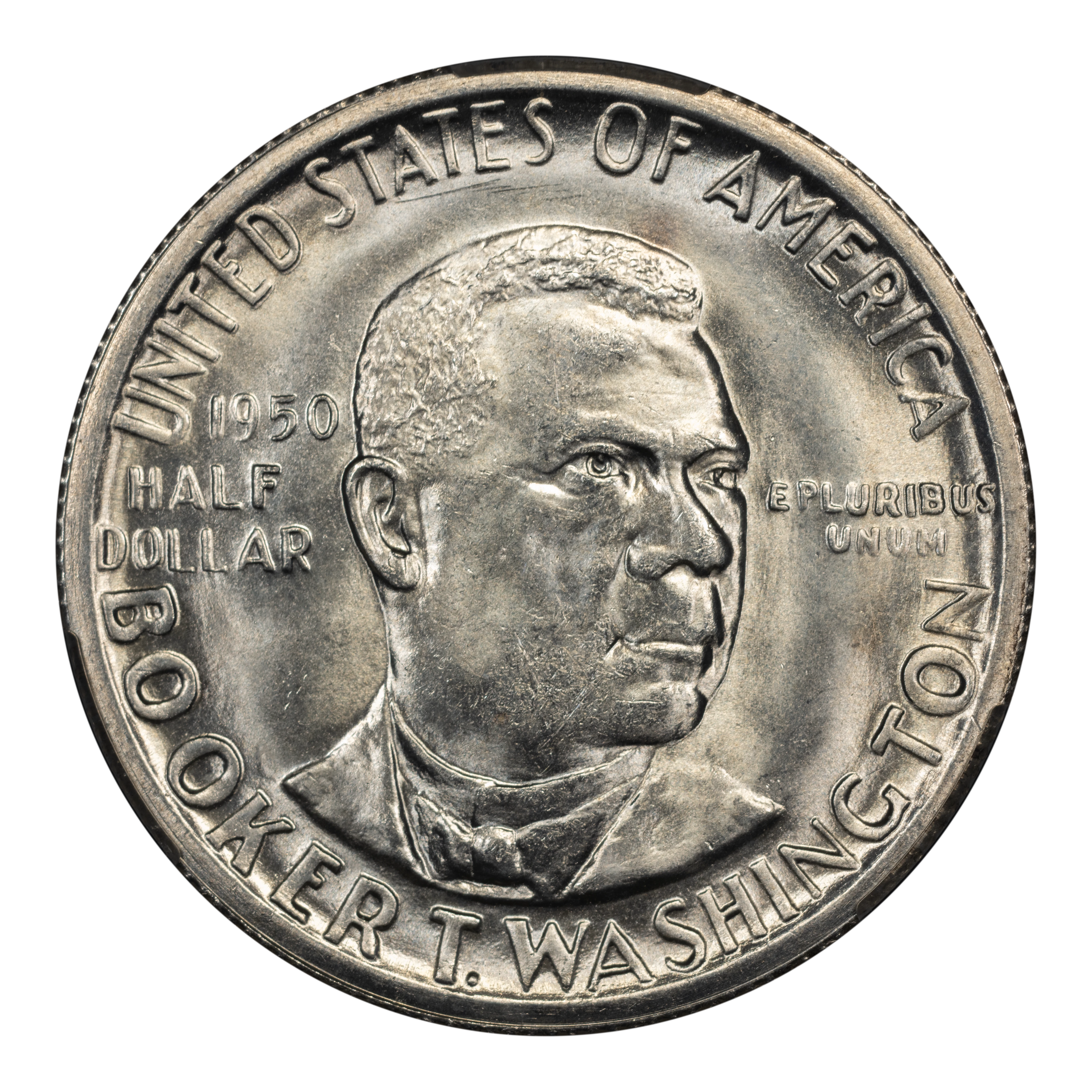 The 1950 Booker T. Washington half dollars represent the fifth year of this long-running commemorative type honoring the legendary social reformer and presidential advisor. The BTW half dollar declares Washington rose FROM SLAVE CABIN TO HALL OF FAME, which he effectively did, being born in -- slave cabin in 1856 before rising to greatness as one of the most prominent members of the African American community in the late 19th century and early 20th century. The coin, designed by Isaac Scott Hathaway, itself marks an important numismatic milestone as the first-ever U.S. coin design created by -- black artist.
