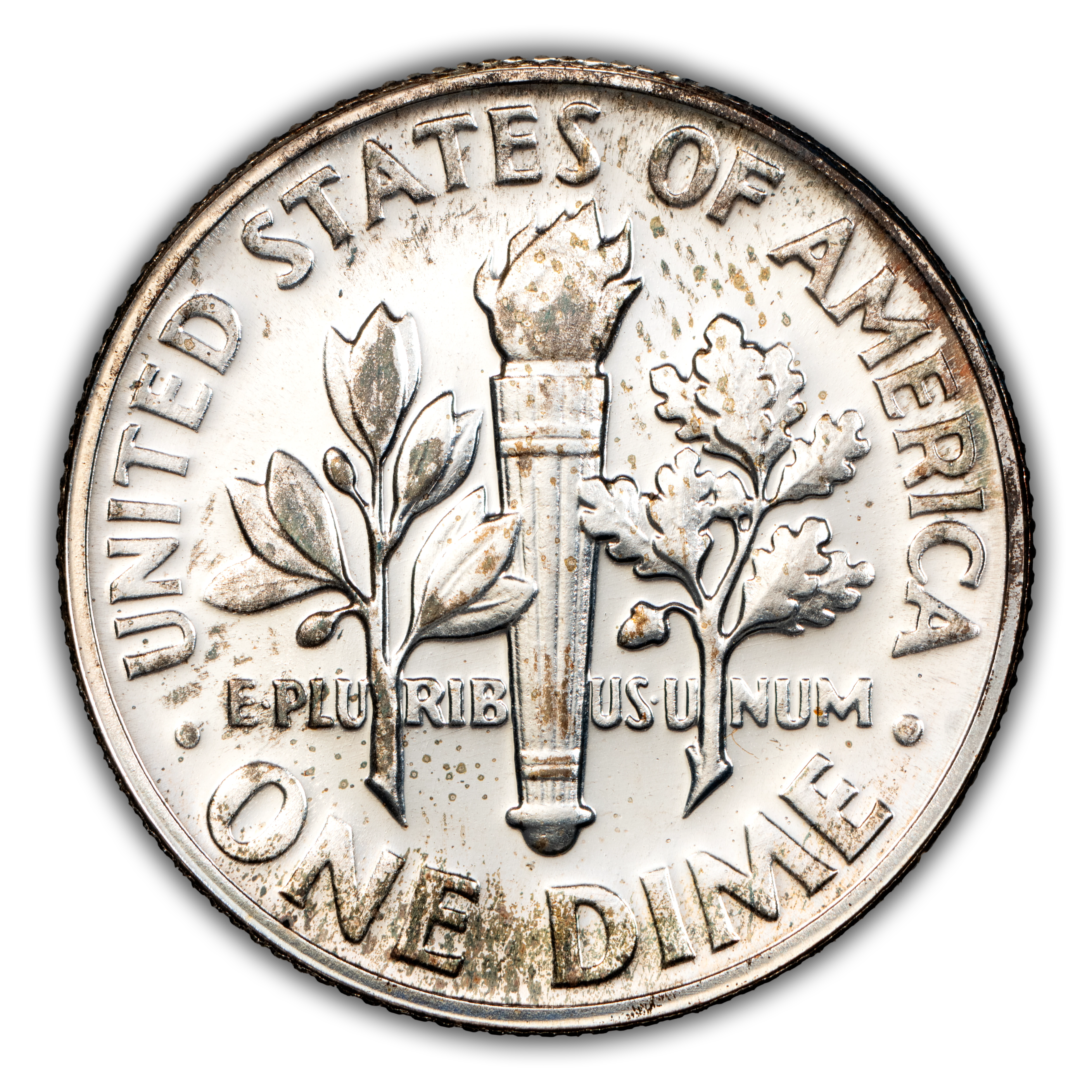 Doubled die obverse. The proof issues of the Roosevelt dim series have been minted from 1950 to present. The set, without varieties, is easy and affordable to assemble in high grade. A great entry-level project for those interested in 10-cent pieces.