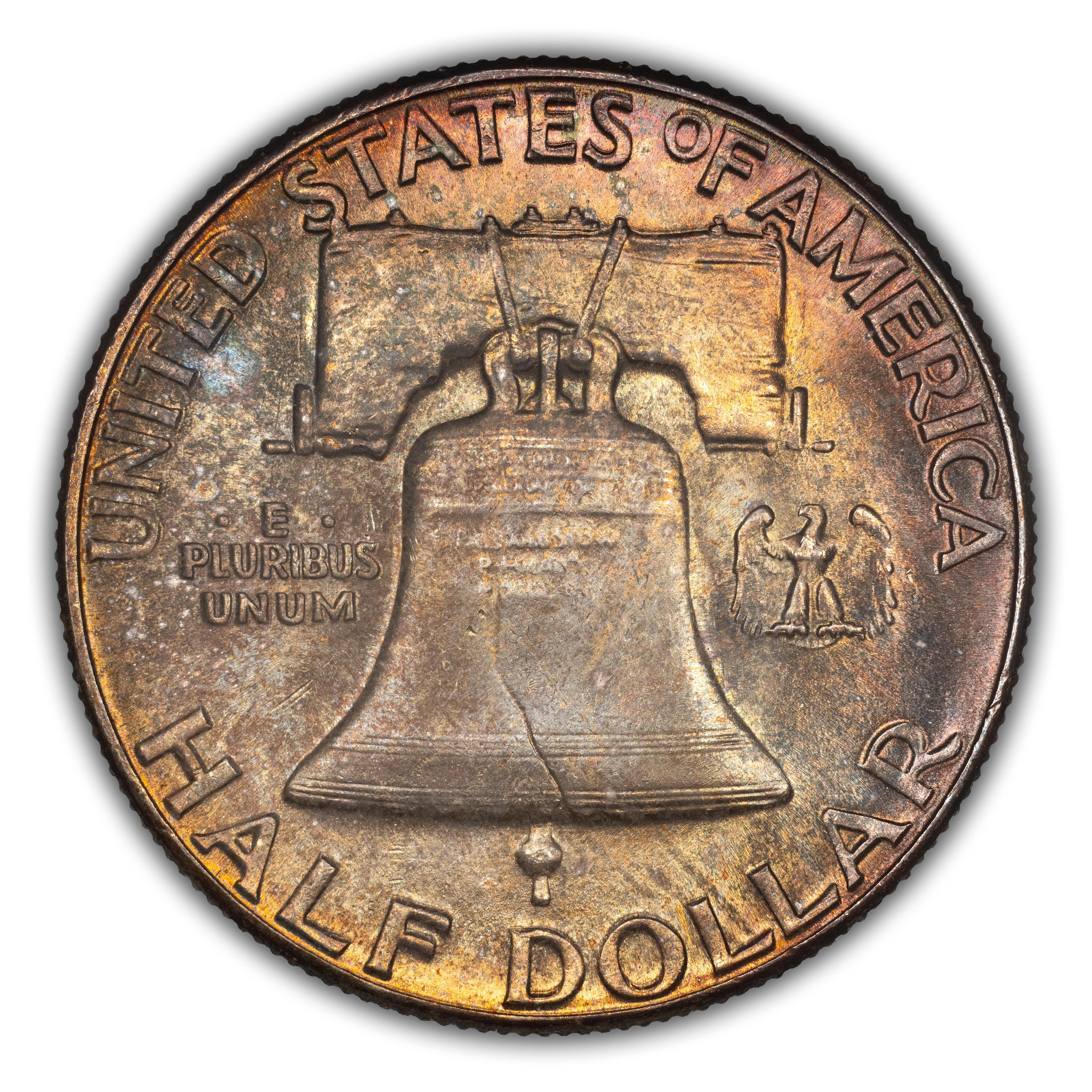 Reverse: The Liberty bell is prominently featured with the words UNITED STATES OF AMERICA and HALF DOLLAR around the periphery. The motto, E PLURIBUS UNUM is left of the bell, with a eagle -- wings fully spread -- to the right.