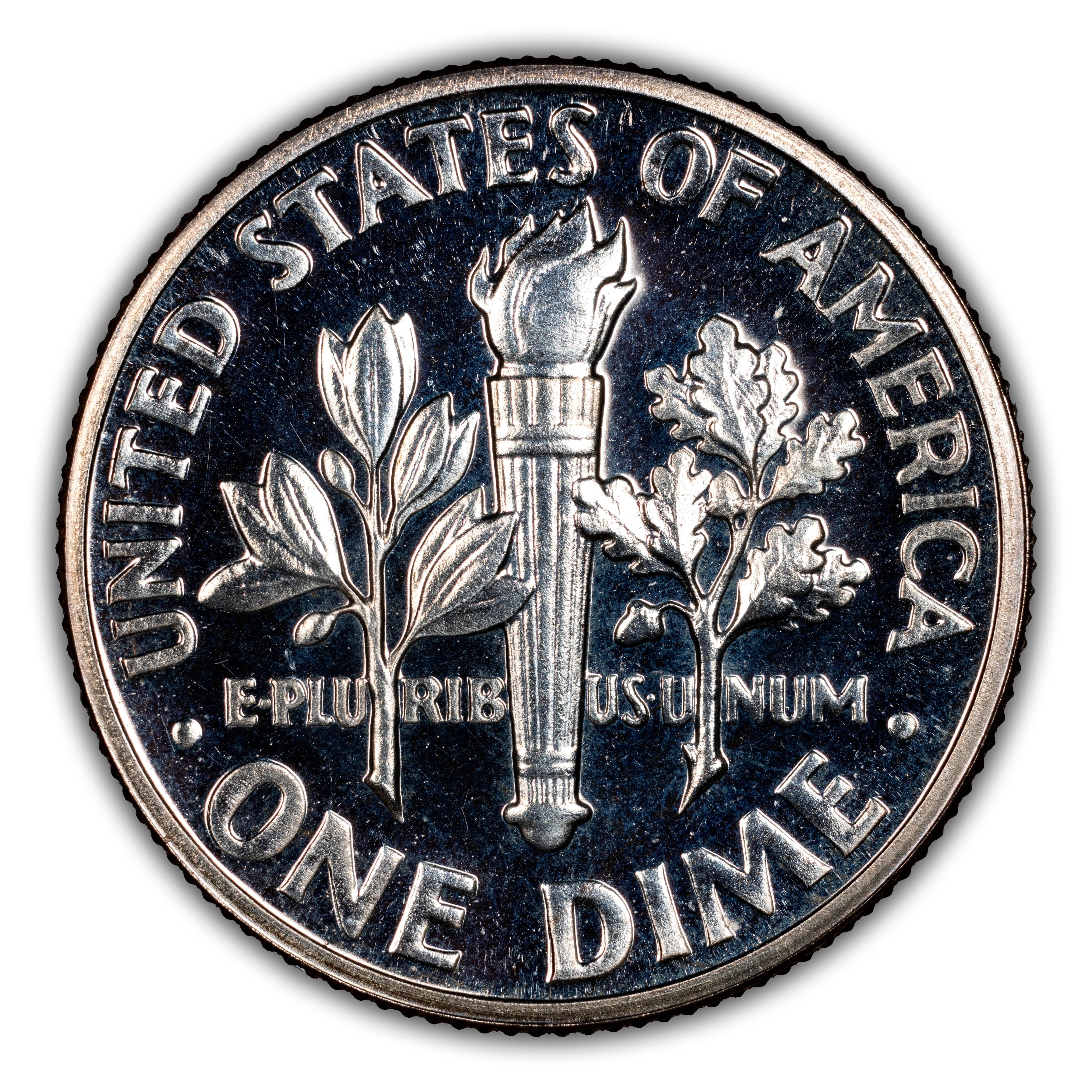 Reverse: Torch of Liberty is flanked by olive branches in the center with UNITED STATES OF AMERICA * ONE DIME around the circumference.