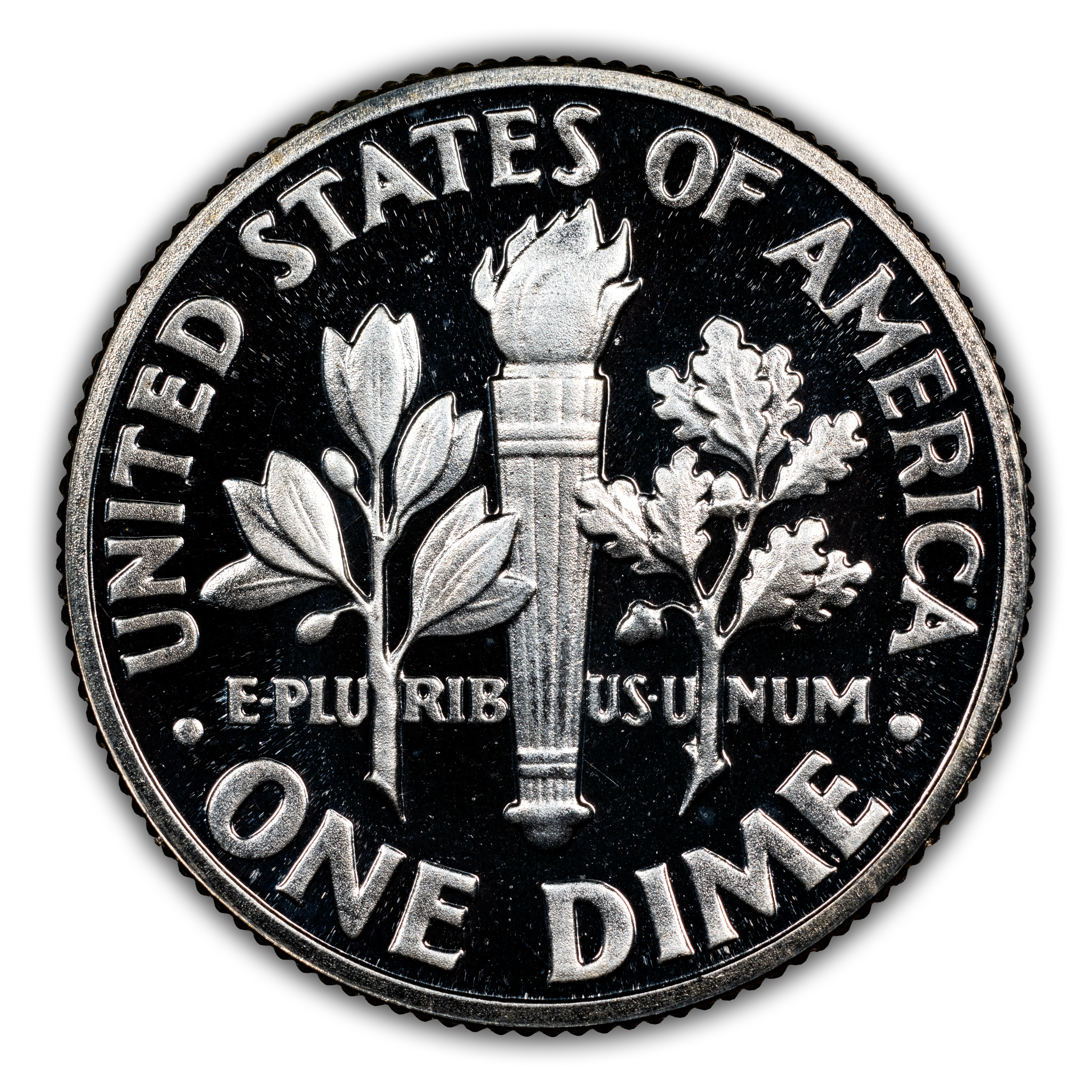 Reverse: Torch of Liberty is flanked by olive branches in the center with UNITED STATES OF AMERICA * ONE DIME around the circumference.