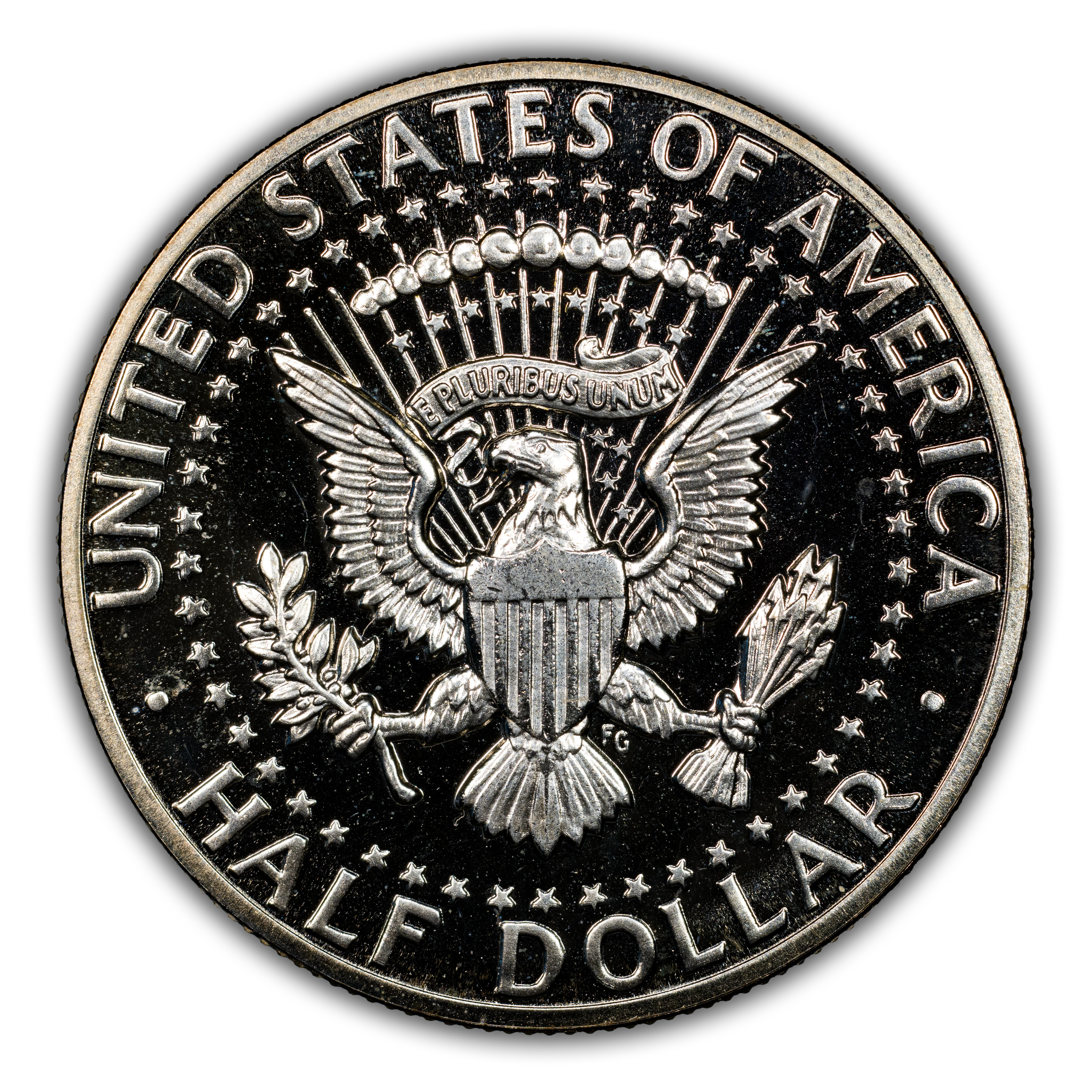 Reverse: The heraldic eagle holding arrows and branch of olive leaves with a full circle of stars around it. UNITED STATES OF AMERICA * HALF DOLLAR surround the periphery.