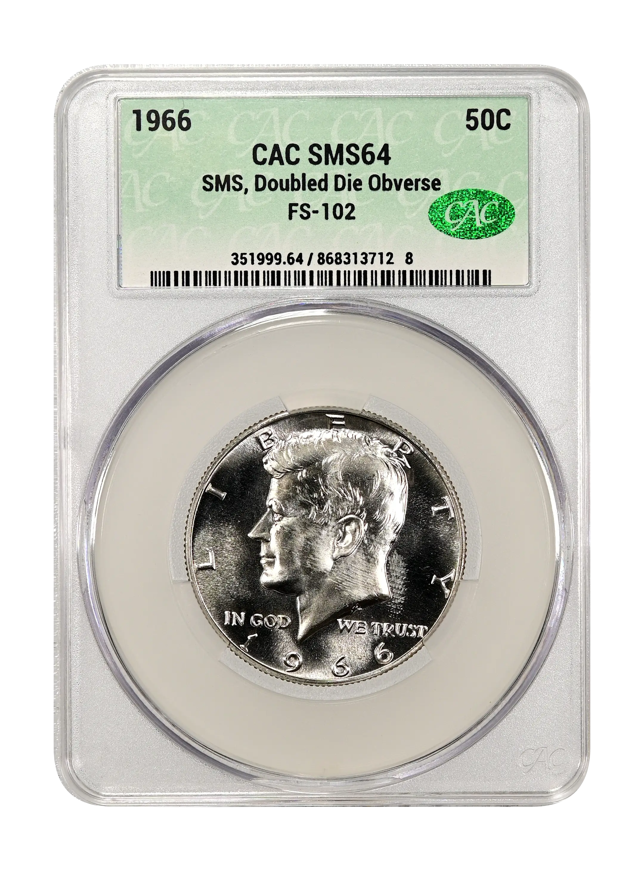 - 1966 50c SMS, Doubled Die Obverse, FS-102 SMS
