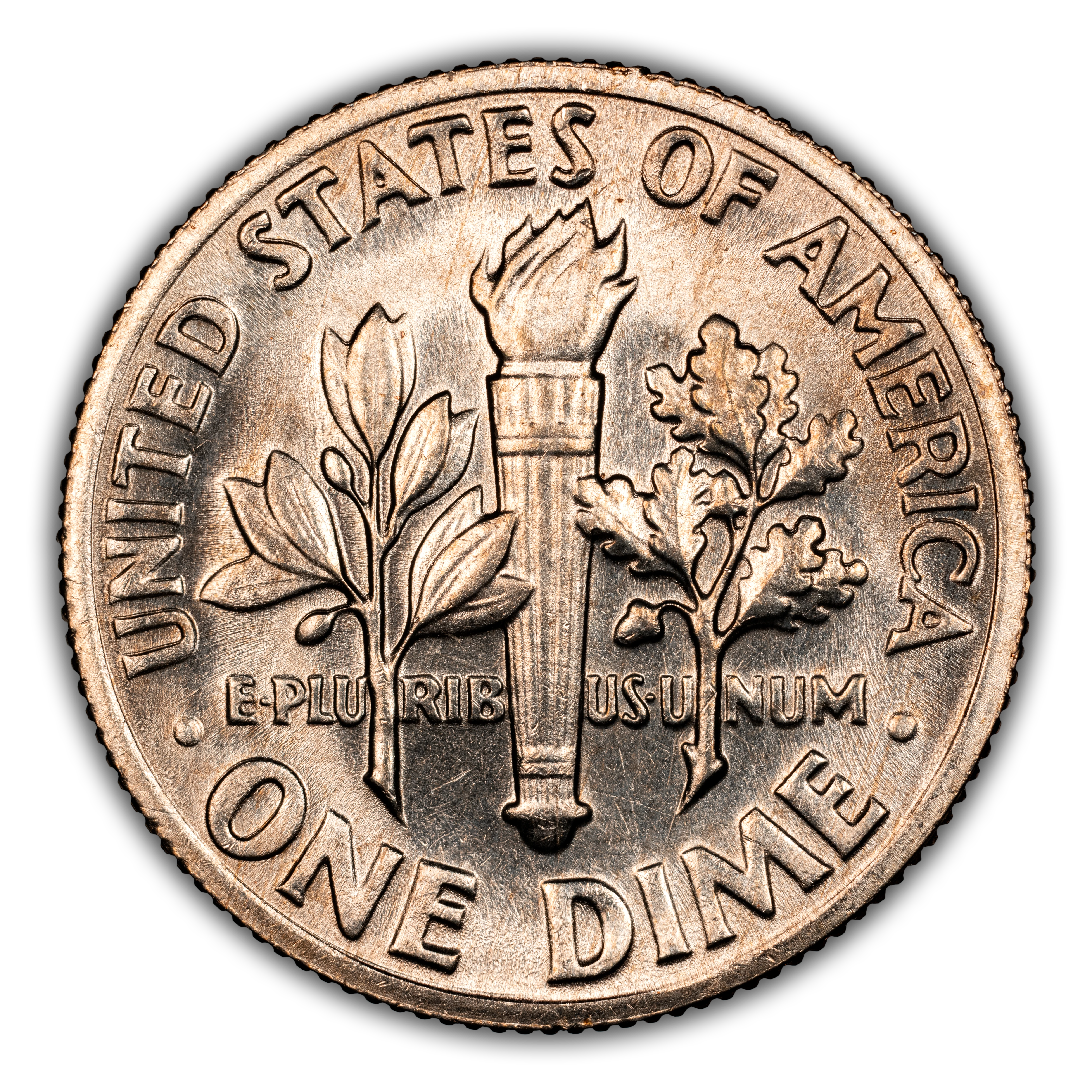 Reverse: Torch of Liberty is flanked by olive branches in the center with UNITED STATES OF AMERICA * ONE DIME around the circumference.