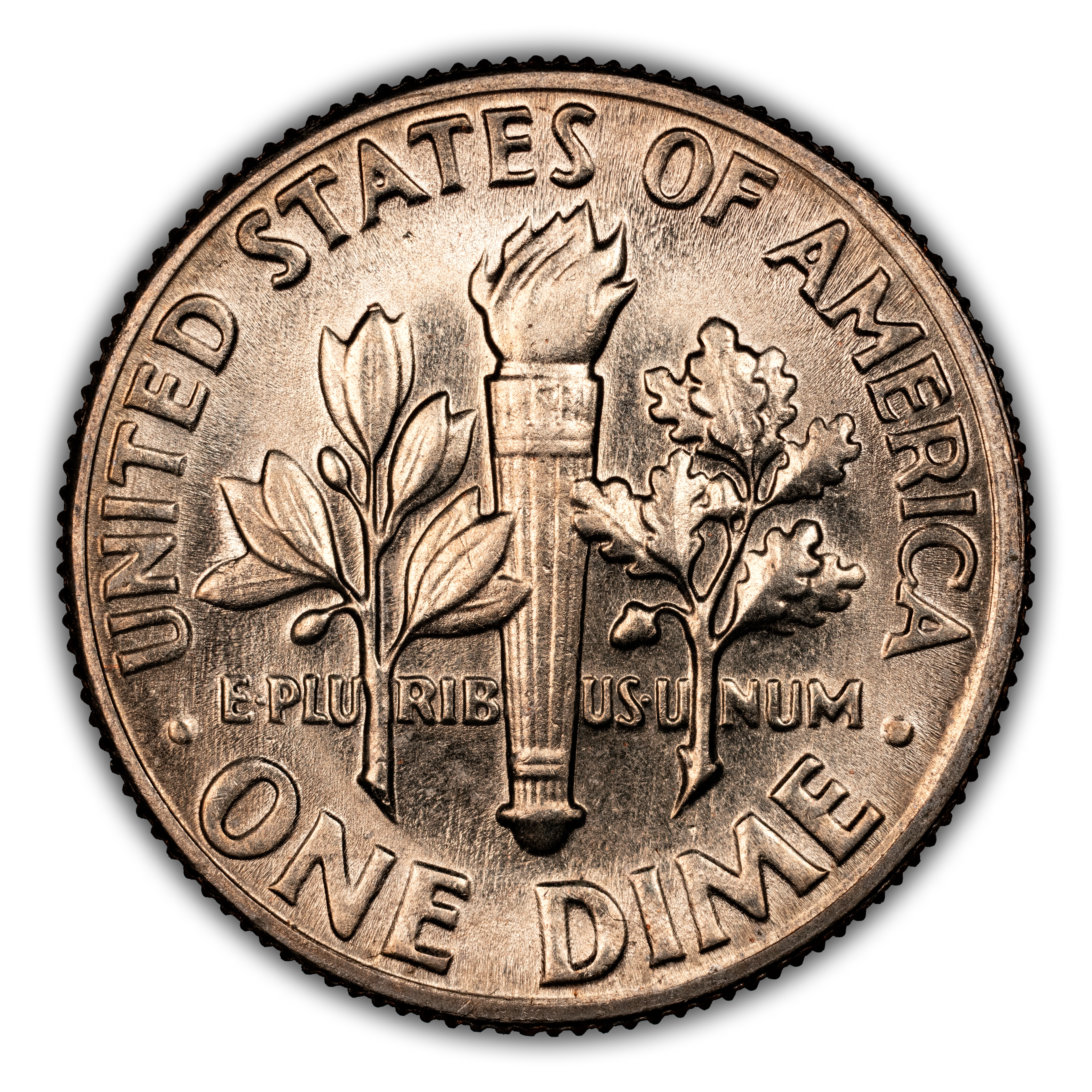 Reverse: Torch of Liberty is flanked by olive branches in the center with UNITED STATES OF AMERICA * ONE DIME around the circumference.