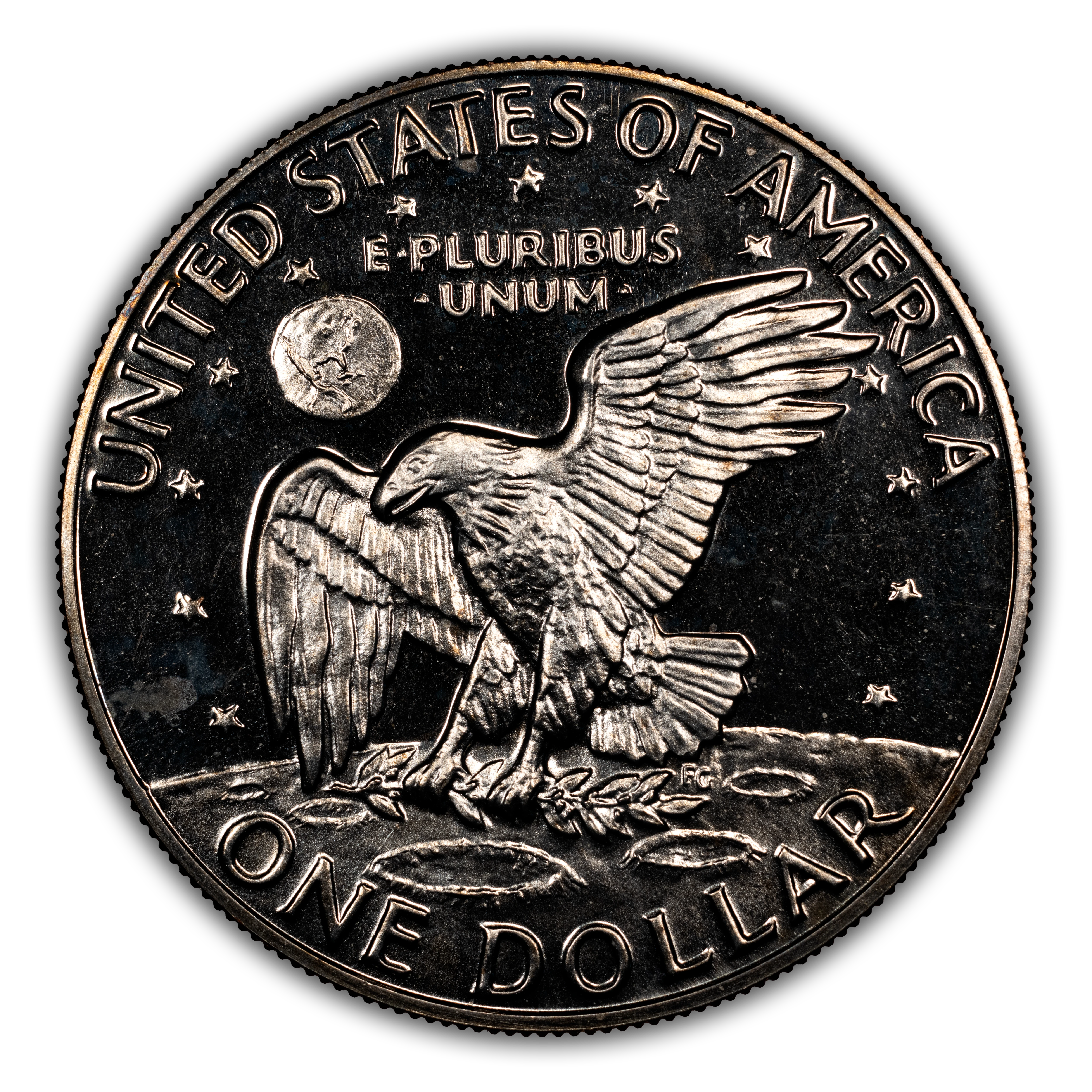 Reverse: A flying eagle, clutching olive branches, appears to be landing on the cratered moon, with the earth seen in the background. 13 stars surround the design with the words UNITED STATES OF AMERICA and ONE DOLLAR framing the periphery.