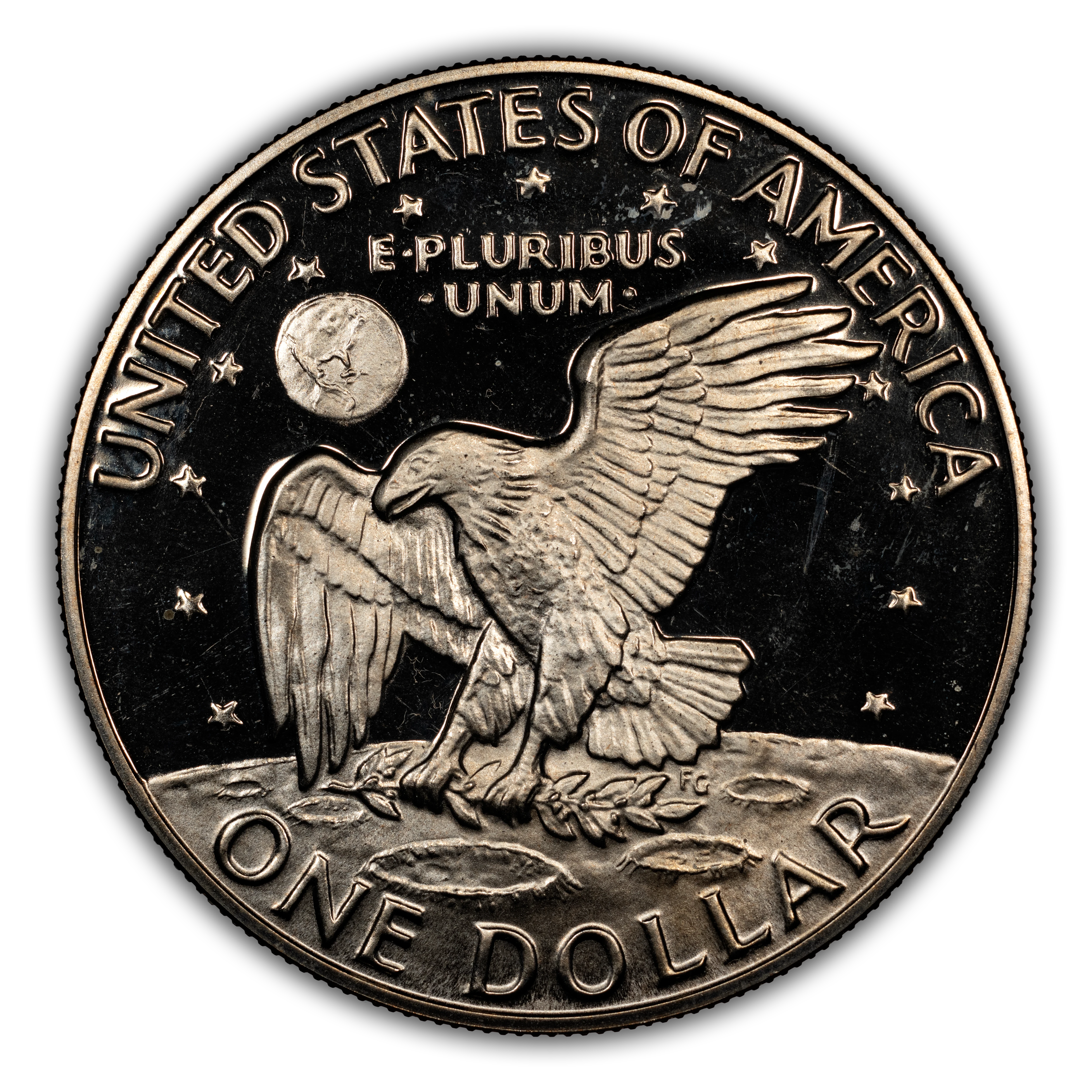 Reverse: A flying eagle, clutching olive branches, appears to be landing on the cratered moon, with the earth seen in the background. 13 stars surround the design with the words UNITED STATES OF AMERICA and ONE DOLLAR framing the periphery.