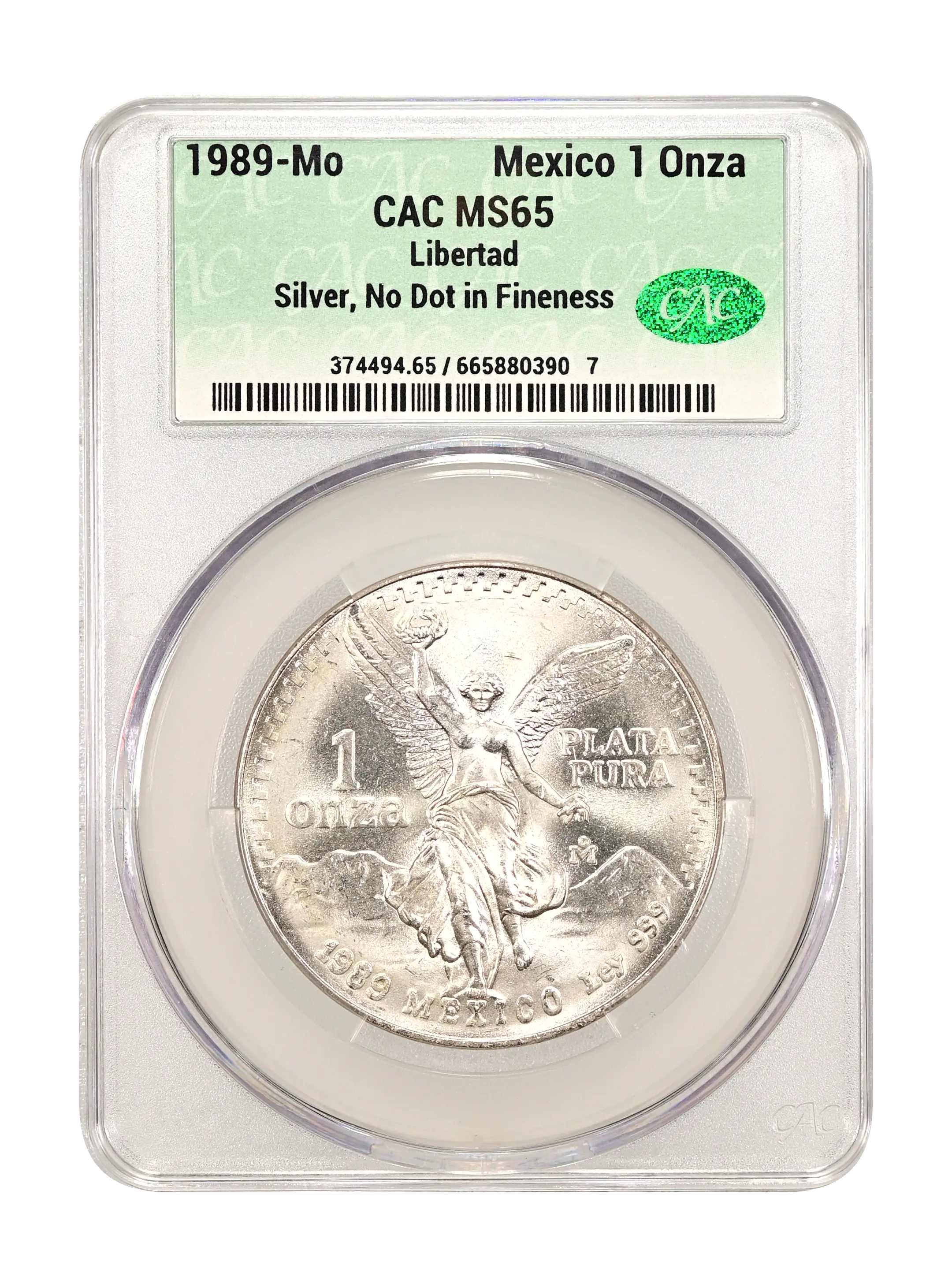 1989-Mo Libertad Mexico 1 Onza Silver, Without Dot CAC MS65