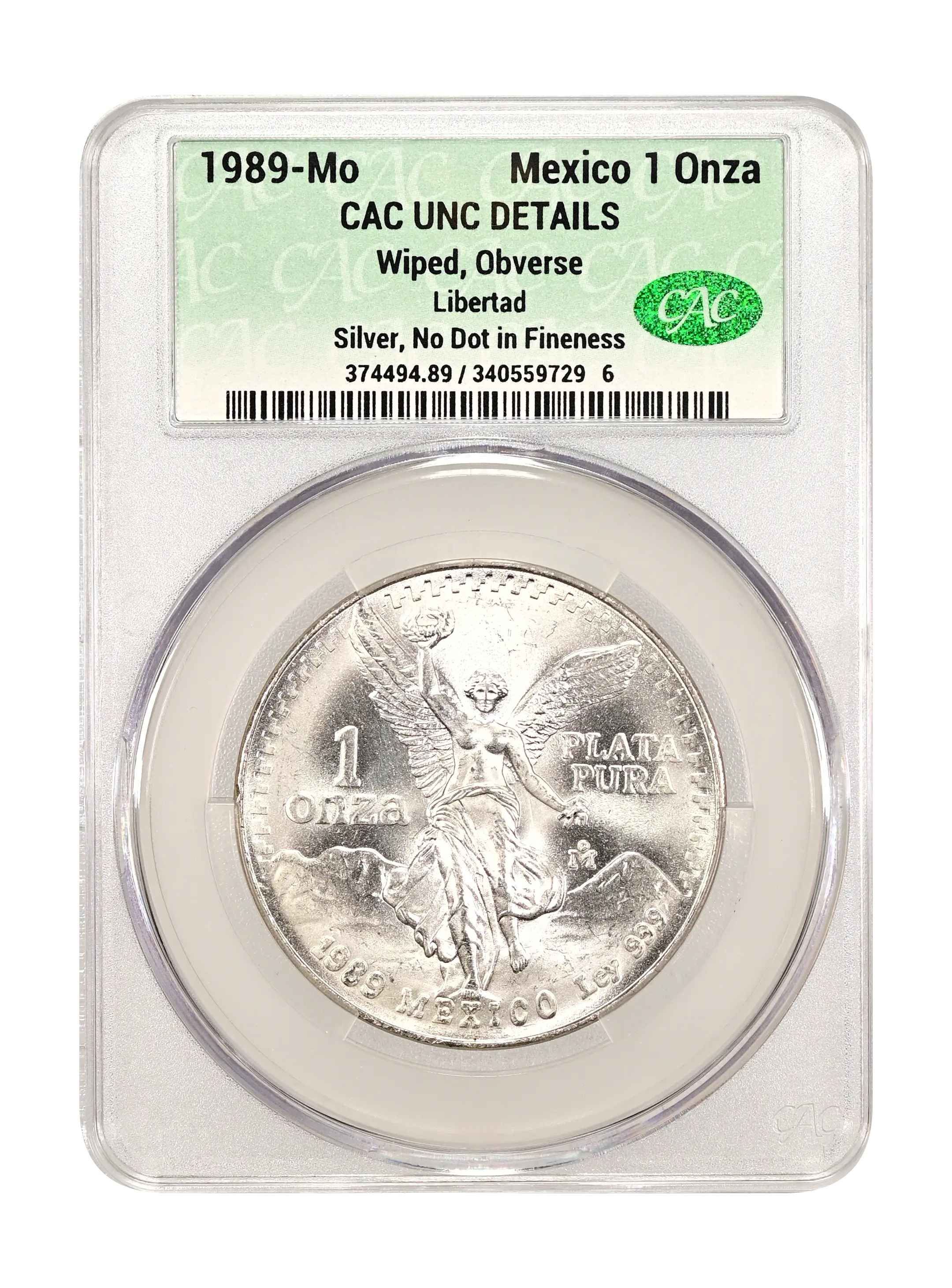 1989-Mo Libertad Mexico 1 Onza Silver, Without Dot CAC UNC DETAILS