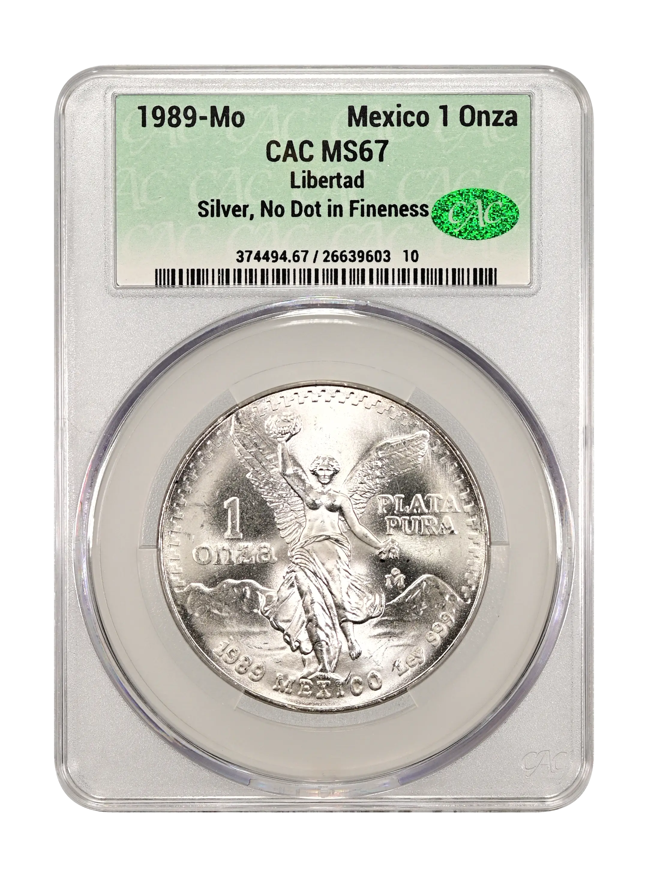 1989-Mo Libertad Mexico 1 Onza Silver, Without Dot CAC MS67