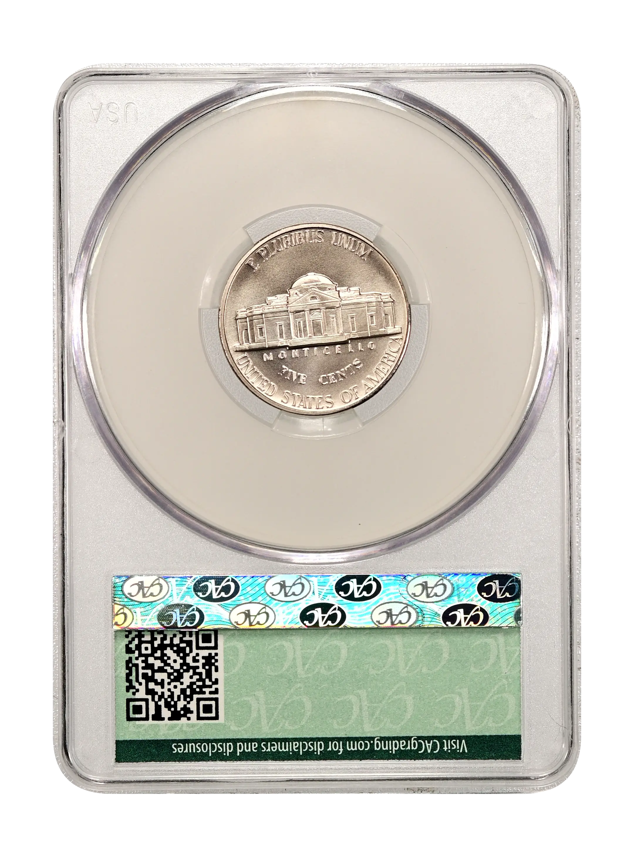Reverse: The Jefferson home is prominently centered with the name MONTICELLO captioned below. The denomination FIVE CENTS is spelled out in half circle underneath and the words E PLURIBUS UNUM and UNITED STATES OF AMERICA appear at the top and bottom periphery.
