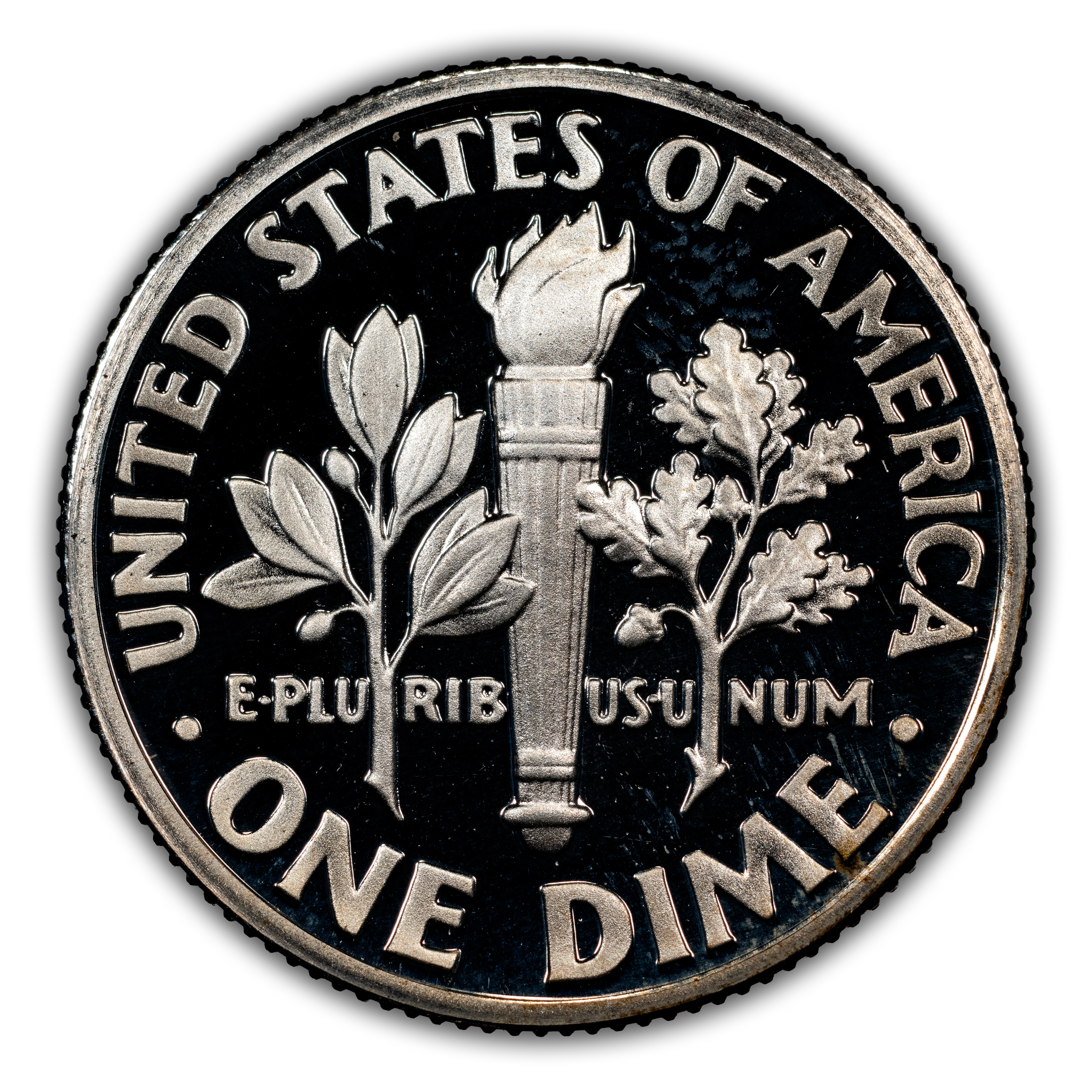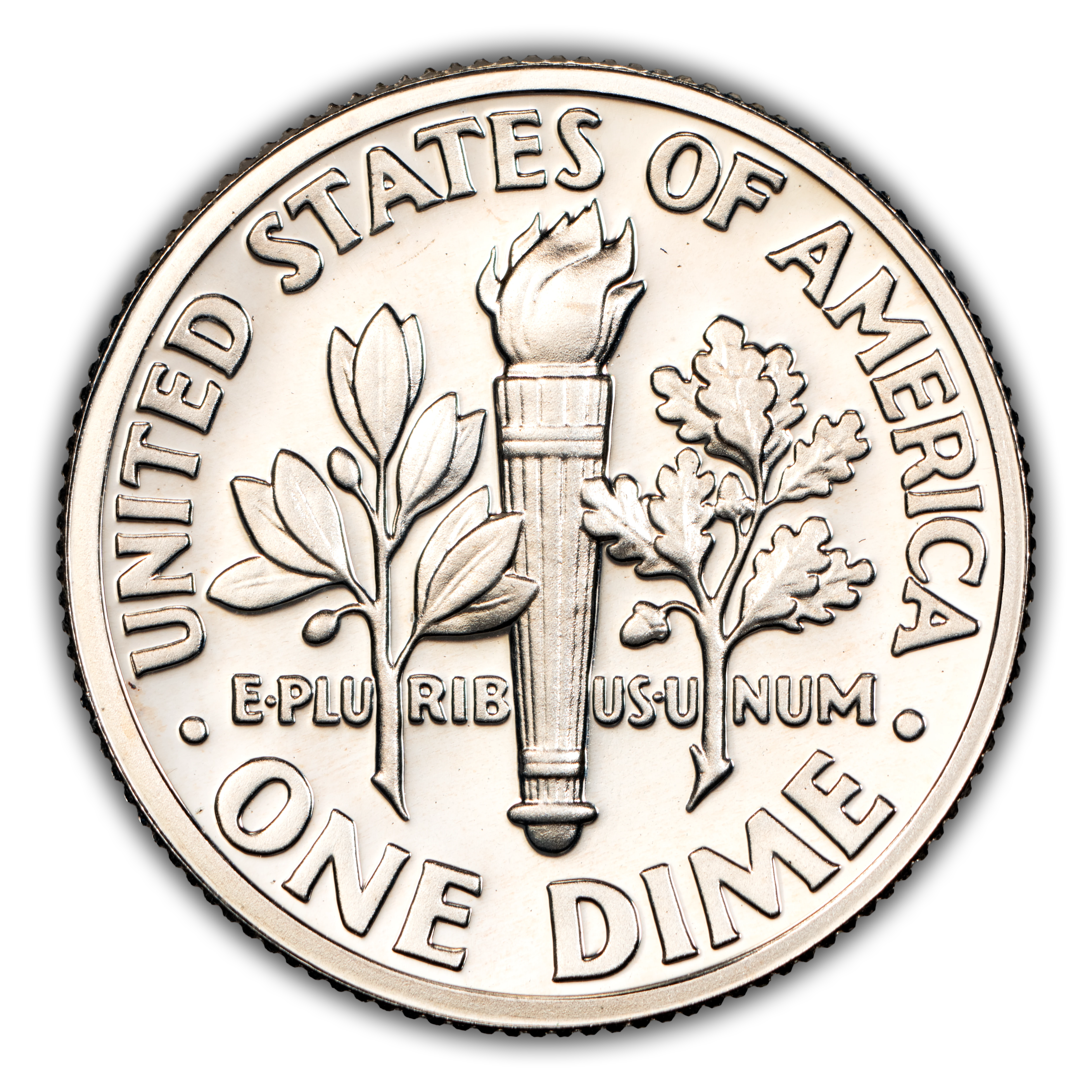 Reverse: Torch of Liberty is flanked by olive branches in the center with UNITED STATES OF AMERICA * ONE DIME around the circumference.