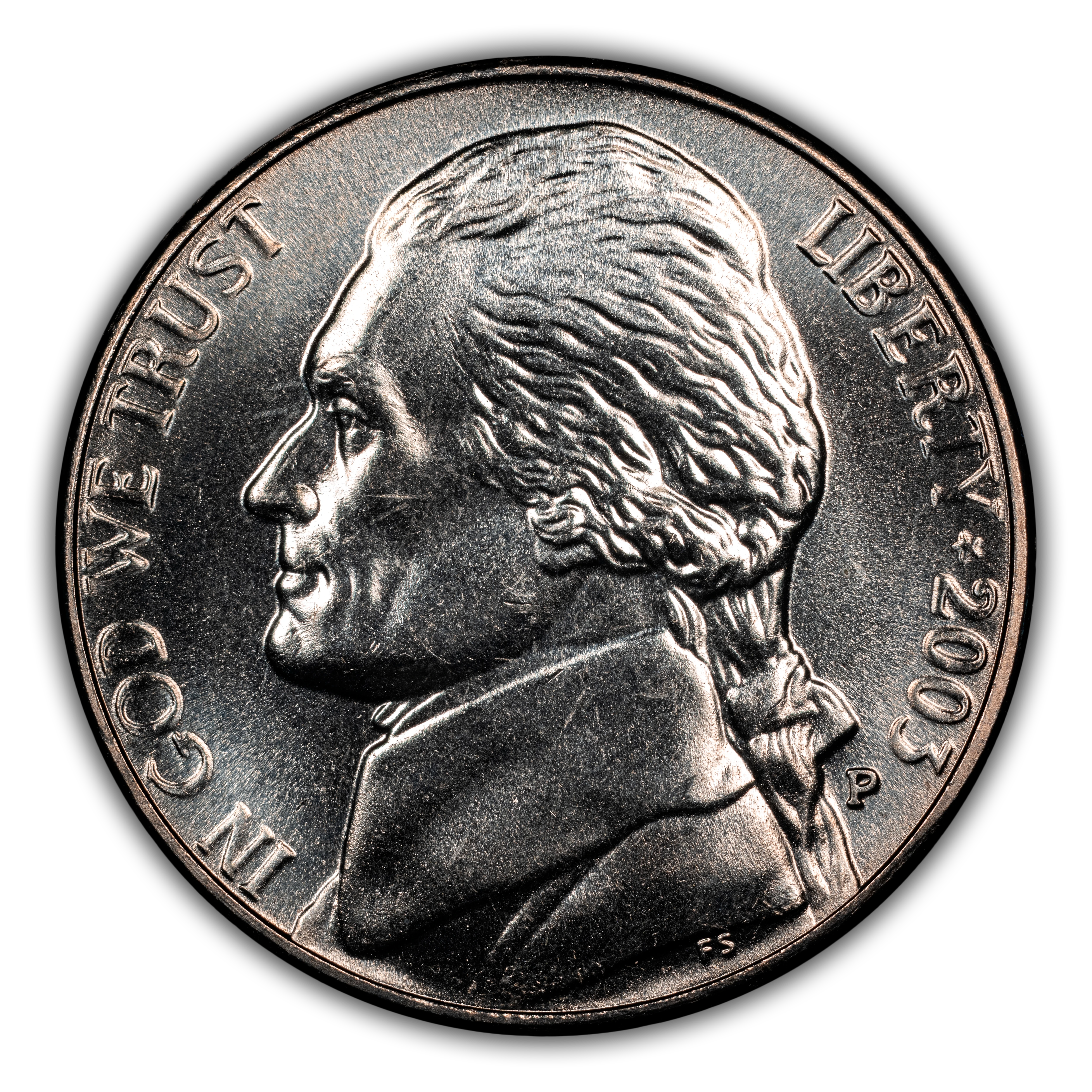 Obverse: Felix Schlag's portrait of Jefferson, facing left, with the motto IN GOD WE TRUST on the left periphery, and LIBERTY * [year] on the right side. Mintmark, if any, is positioned just below the date. In 1966, the designer's initials of FS were added below the bust.