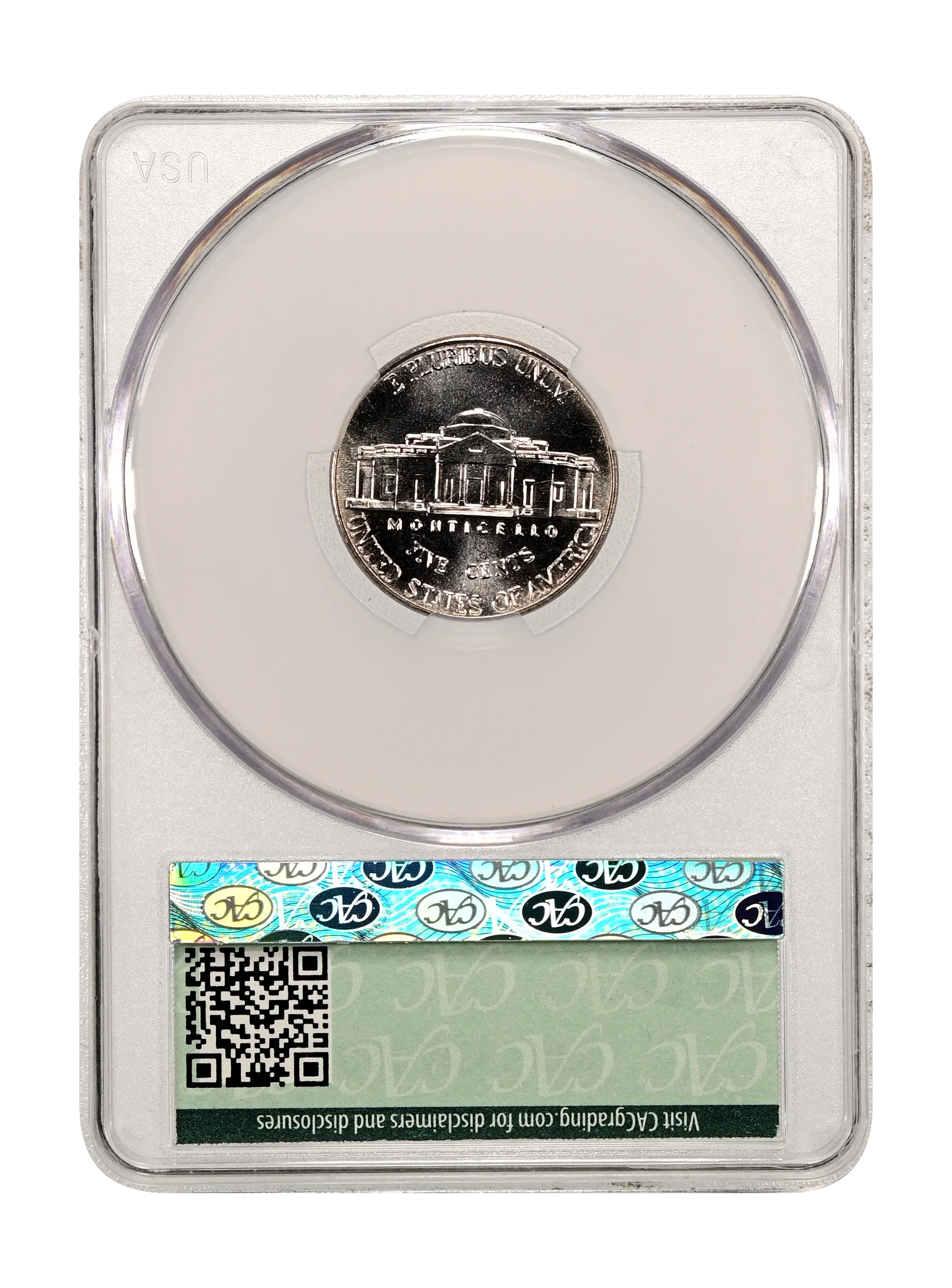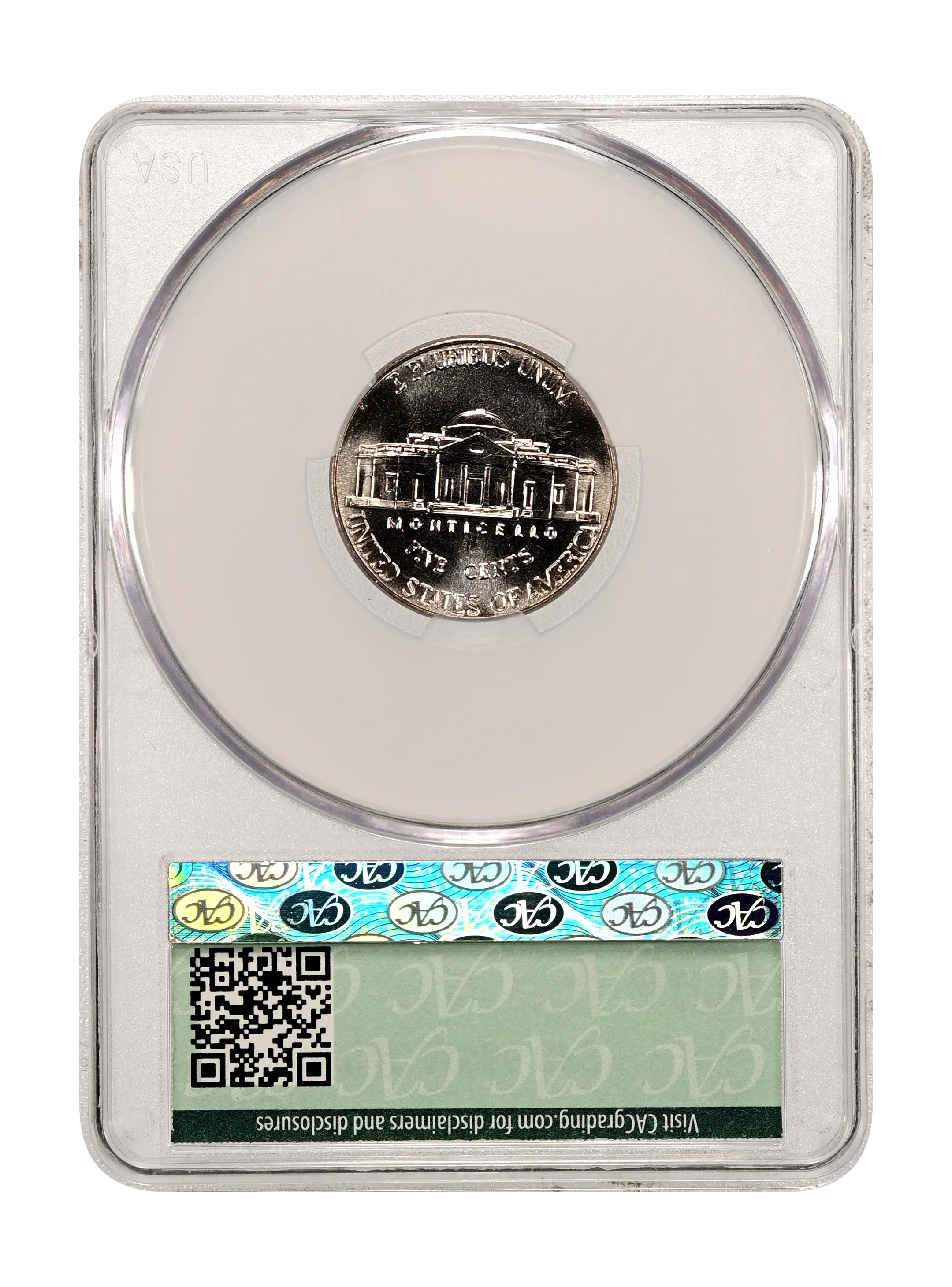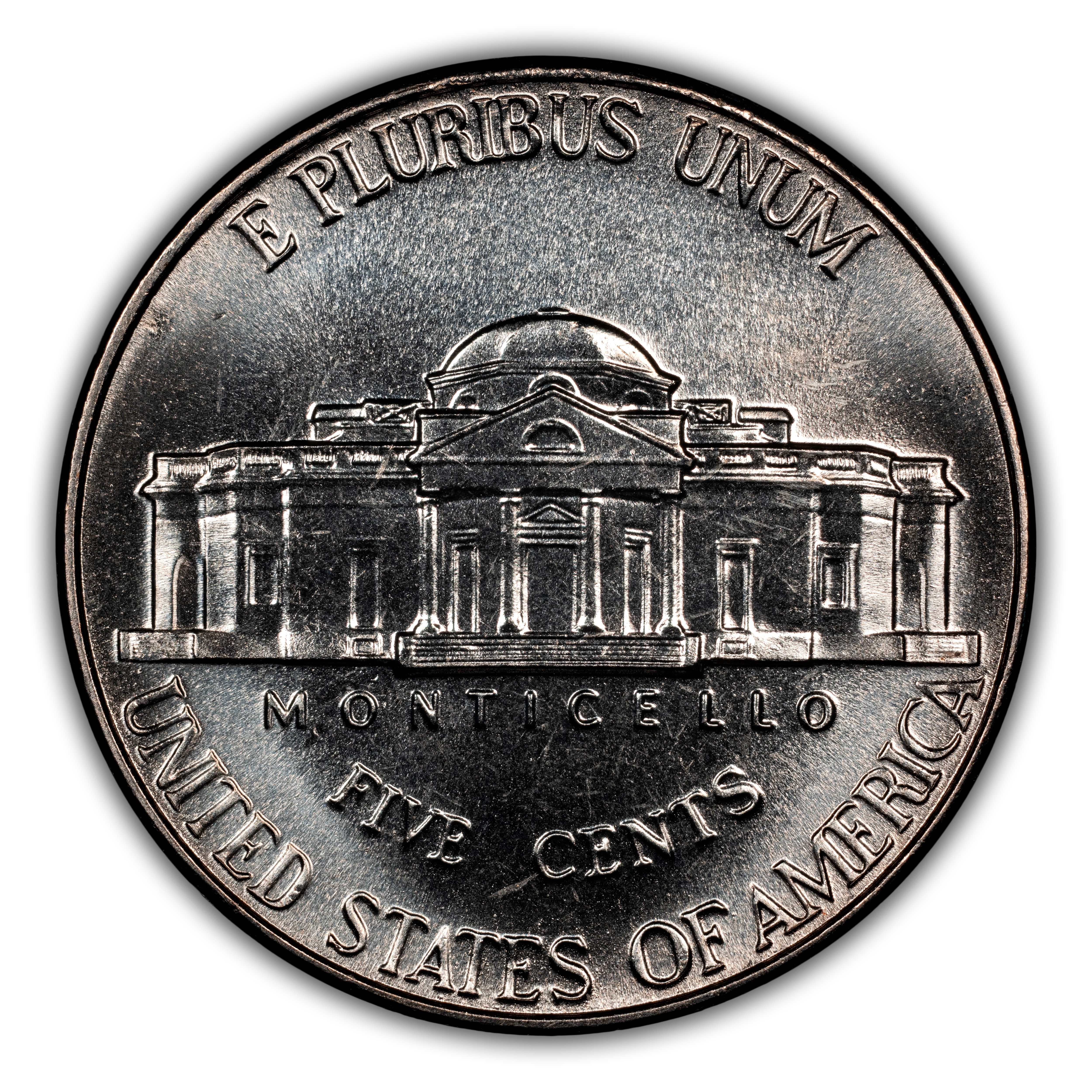 Reverse: The Jefferson home is prominently centered with the name MONTICELLO captioned below. The denomination FIVE CENTS is spelled out in half circle underneath and the words E PLURIBUS UNUM and UNITED STATES OF AMERICA appear at the top and bottom periphery.