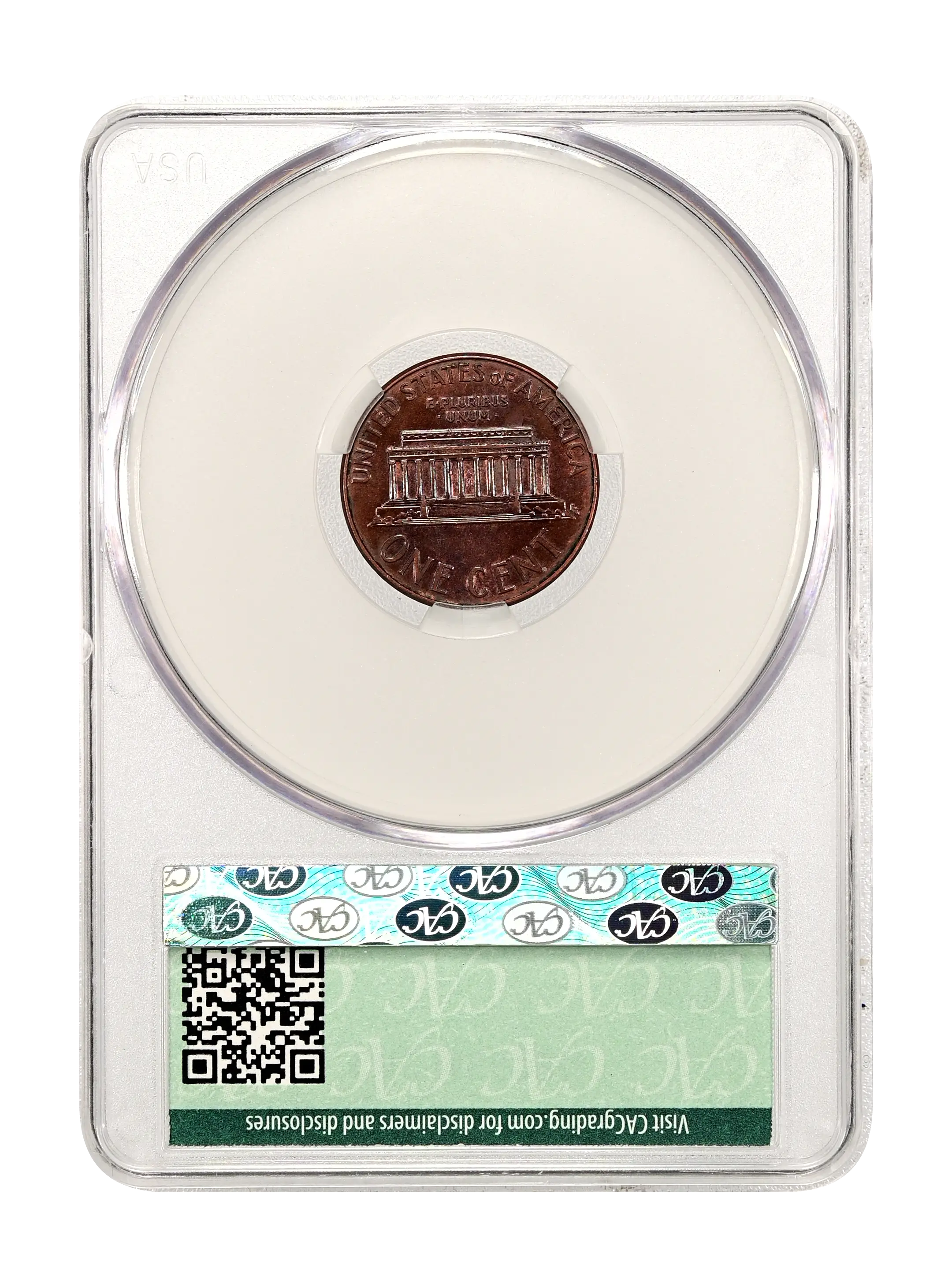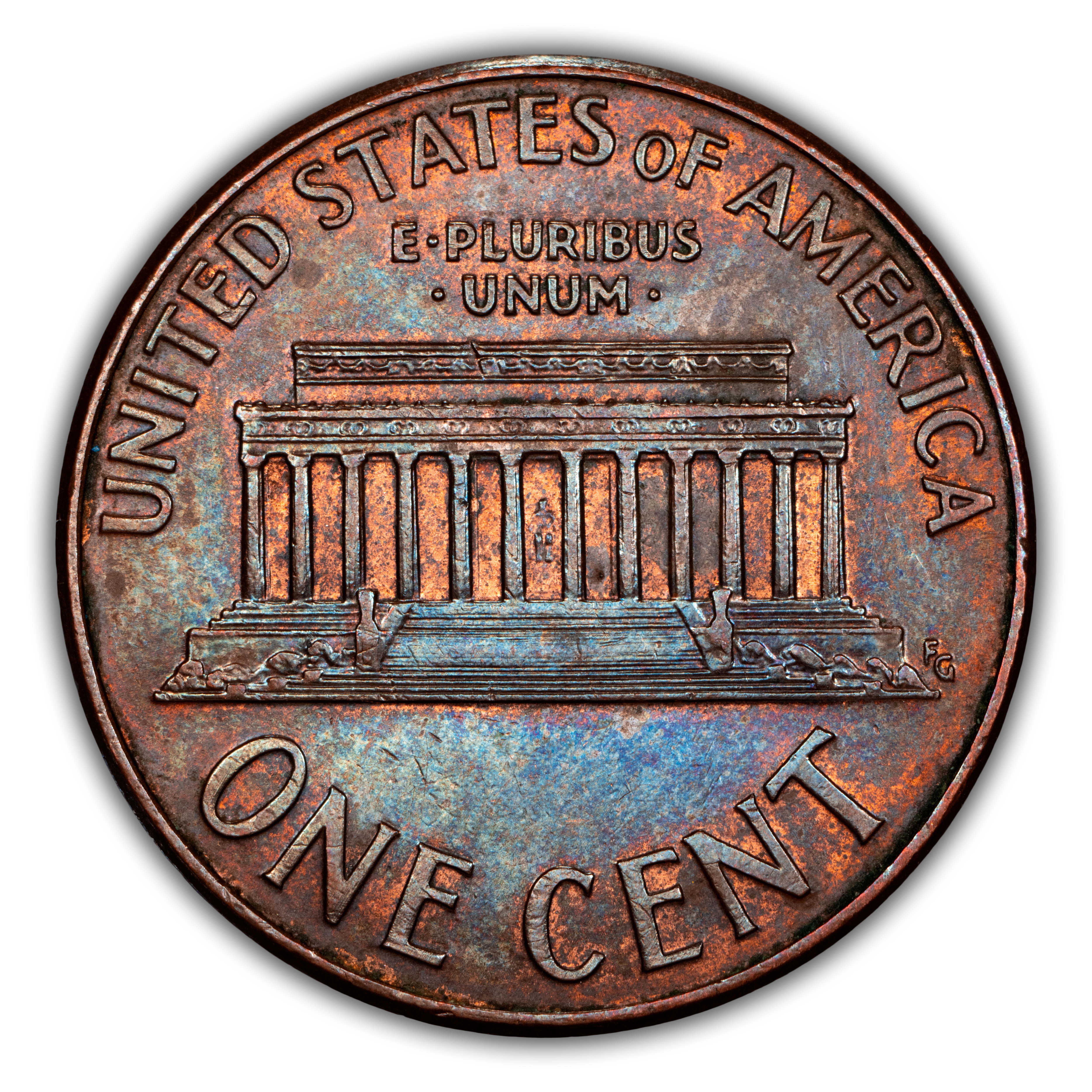 Reverse: Lincoln memorial building centered with words ONE CENT, UNITED STATES OF AMERICA on top and bottom periphery. E PLURIBUS UNUM centered above the top of the memorial.