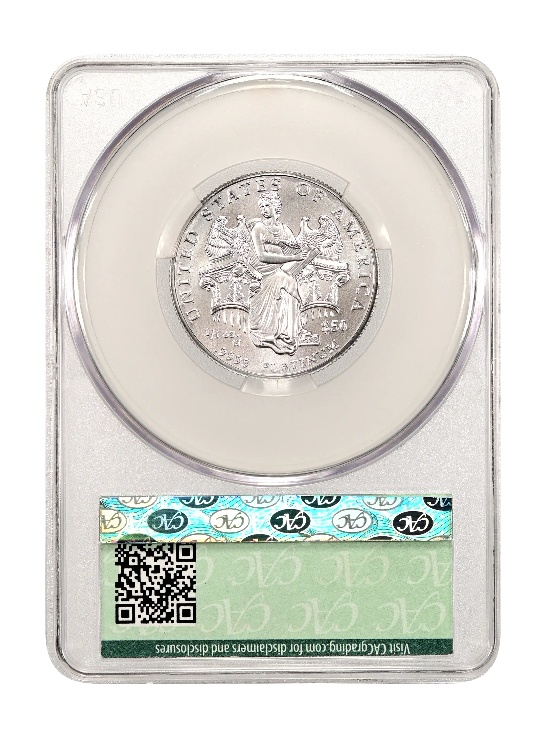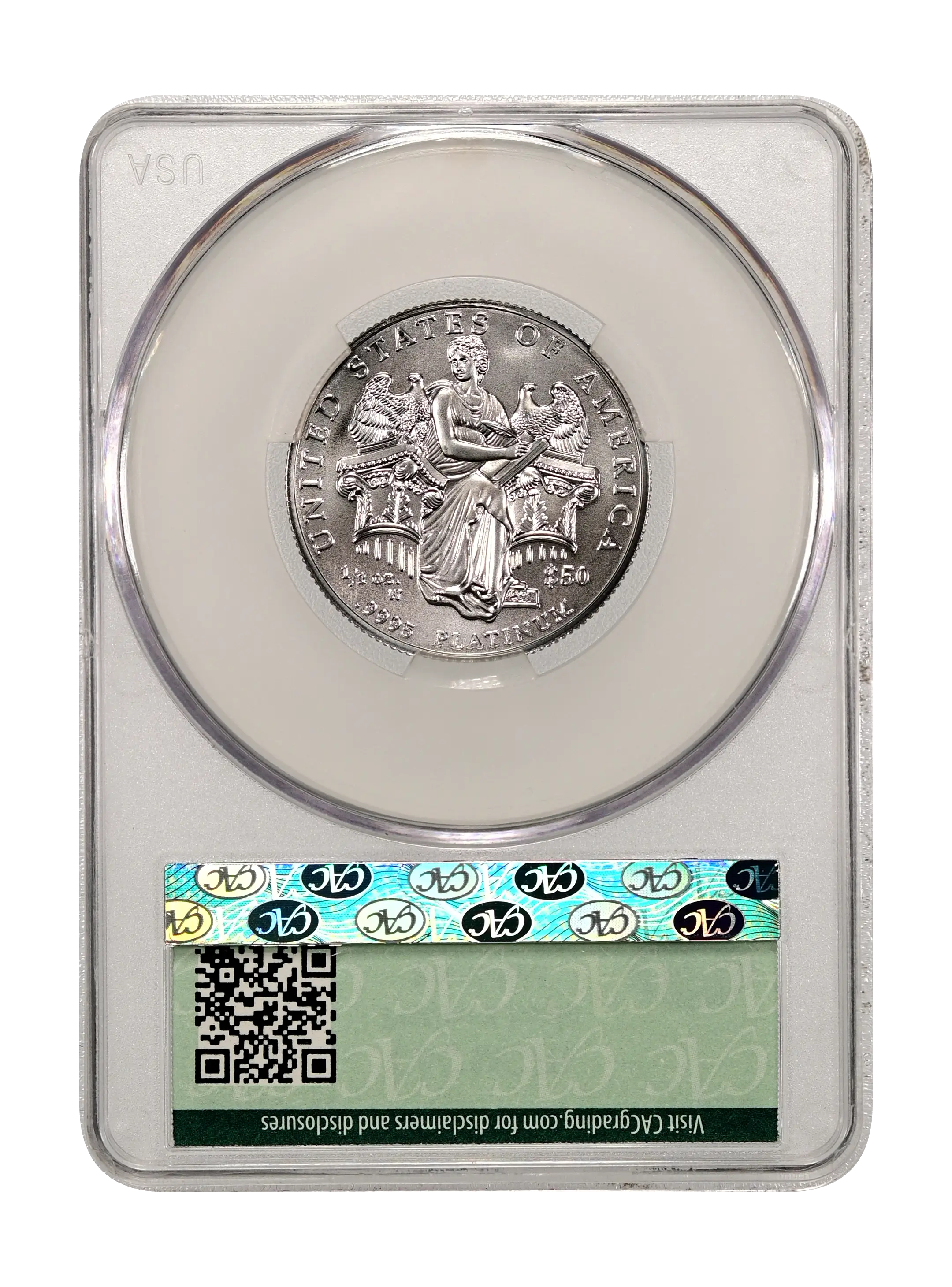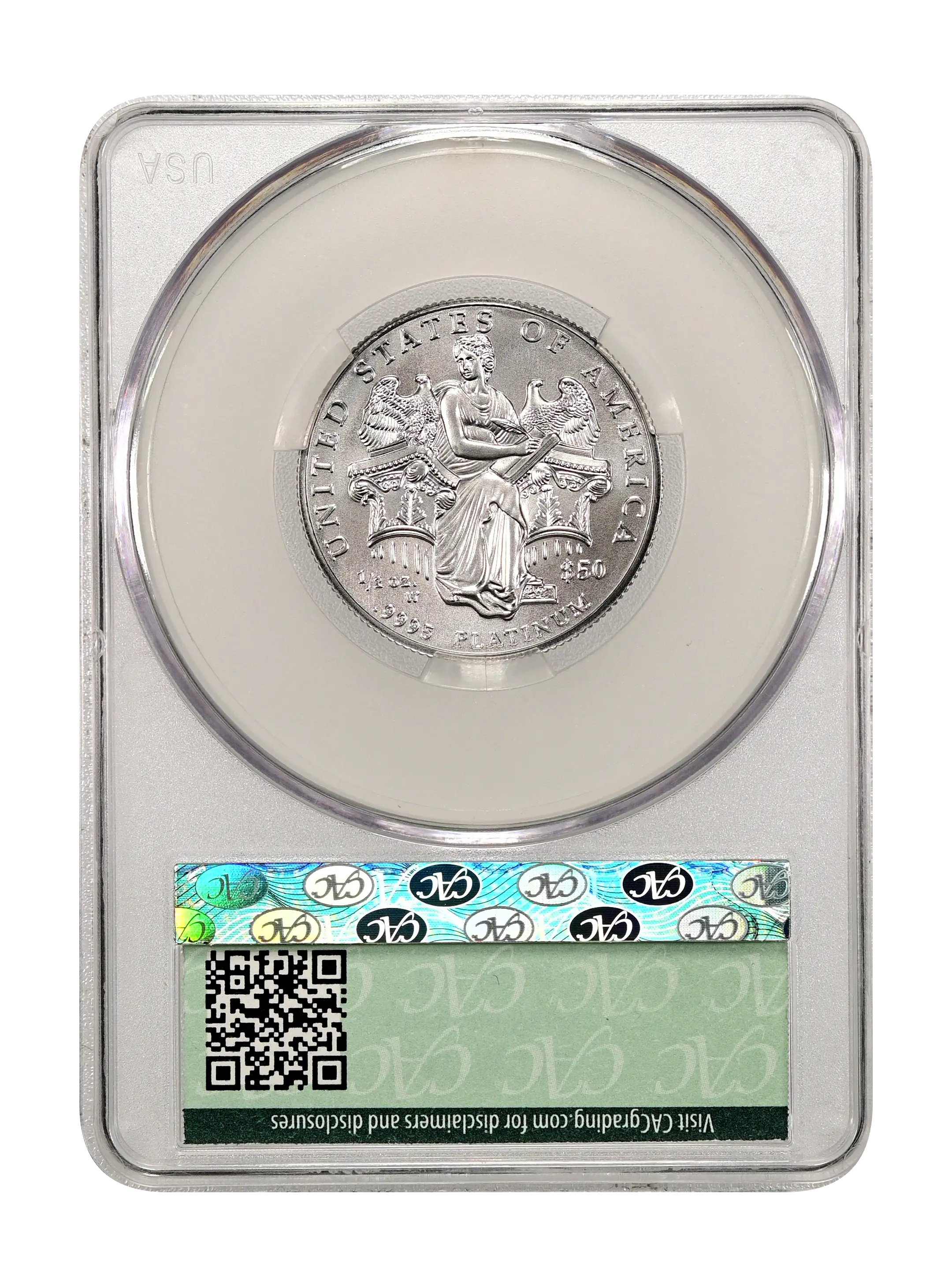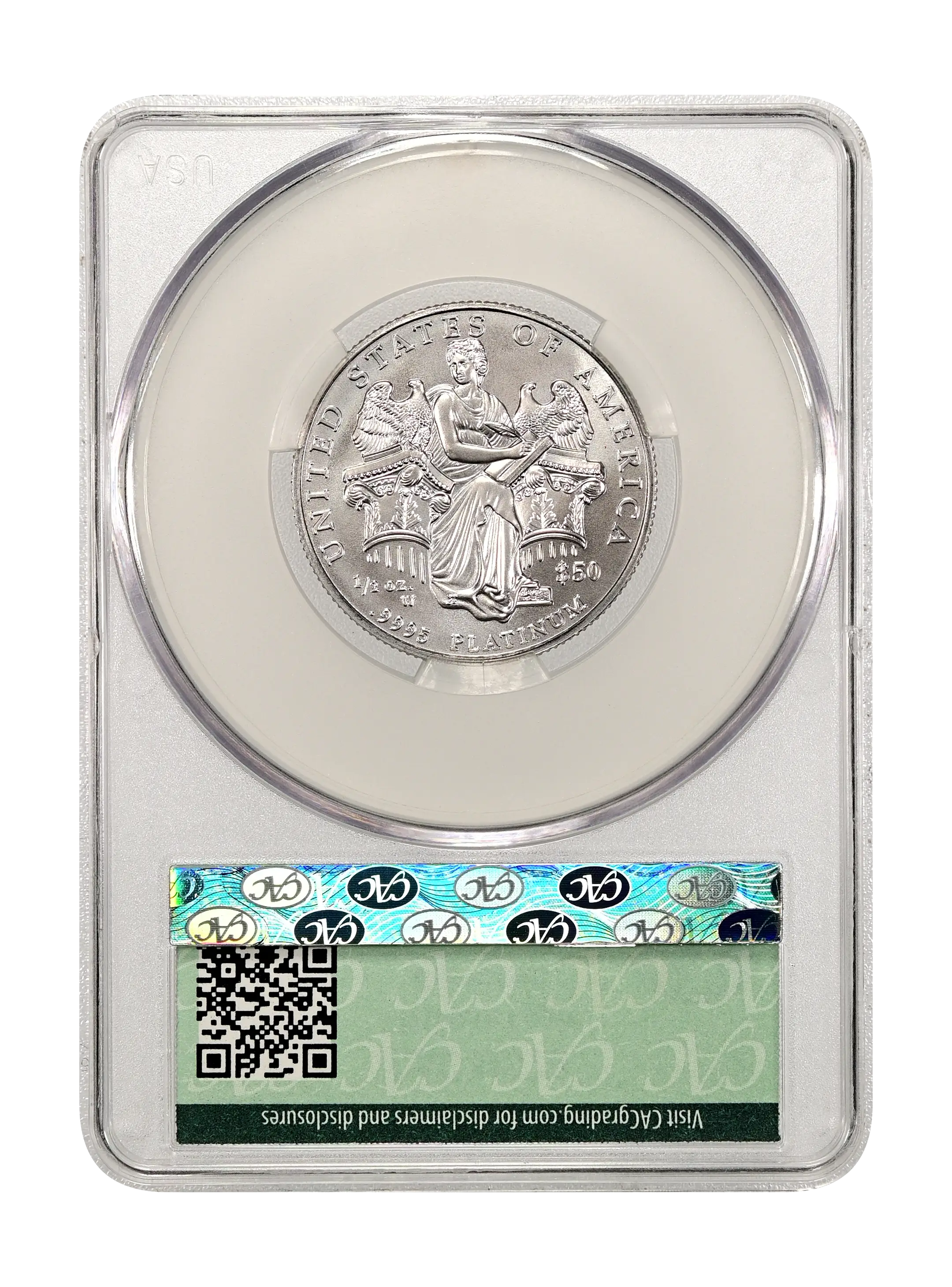 Reverse: Eagle in flight, an olive branch in its talons. Inscriptions are "UNITED STATES OF AMERICA," "$50", "1/2 OZ.", and ".9995 PLATINUM."