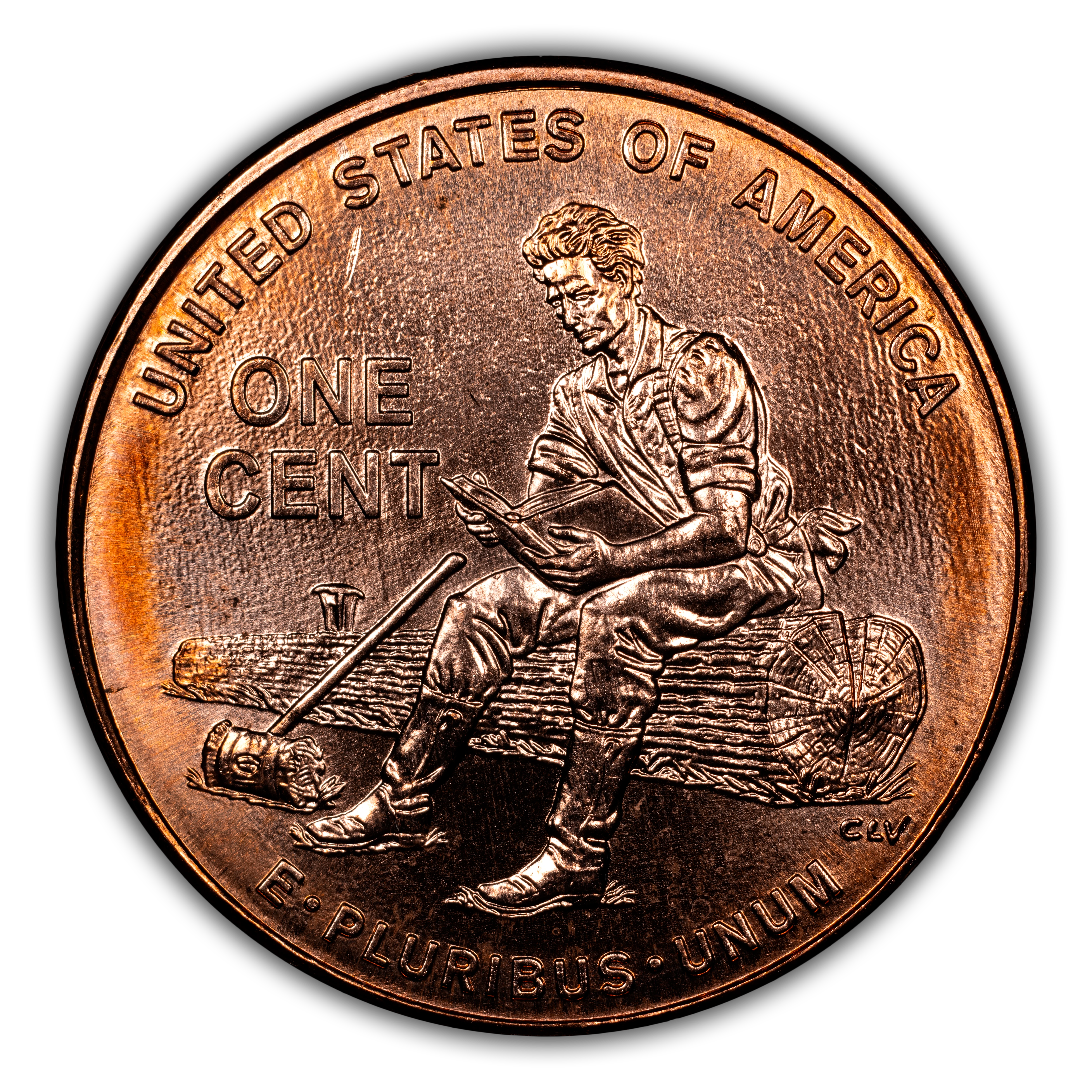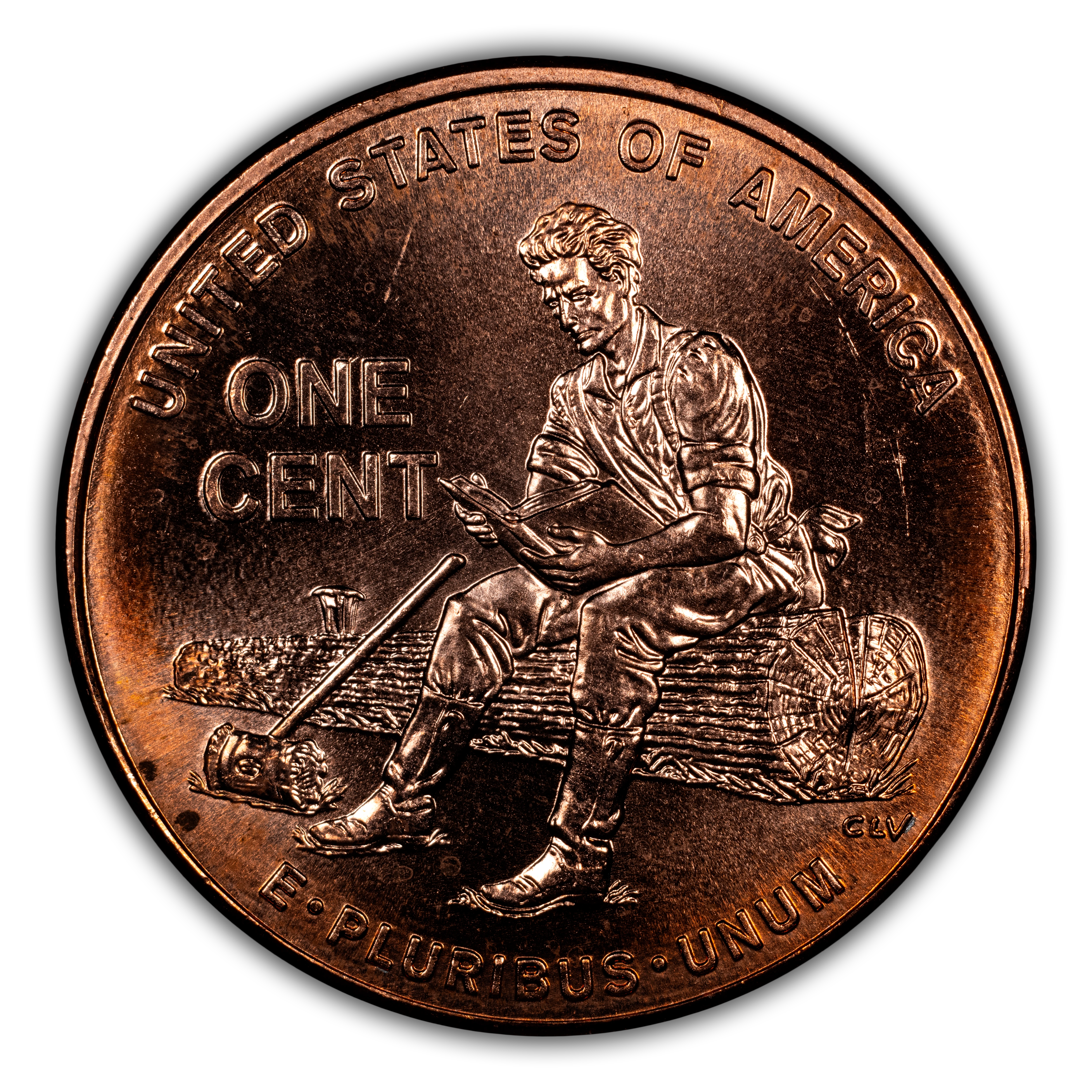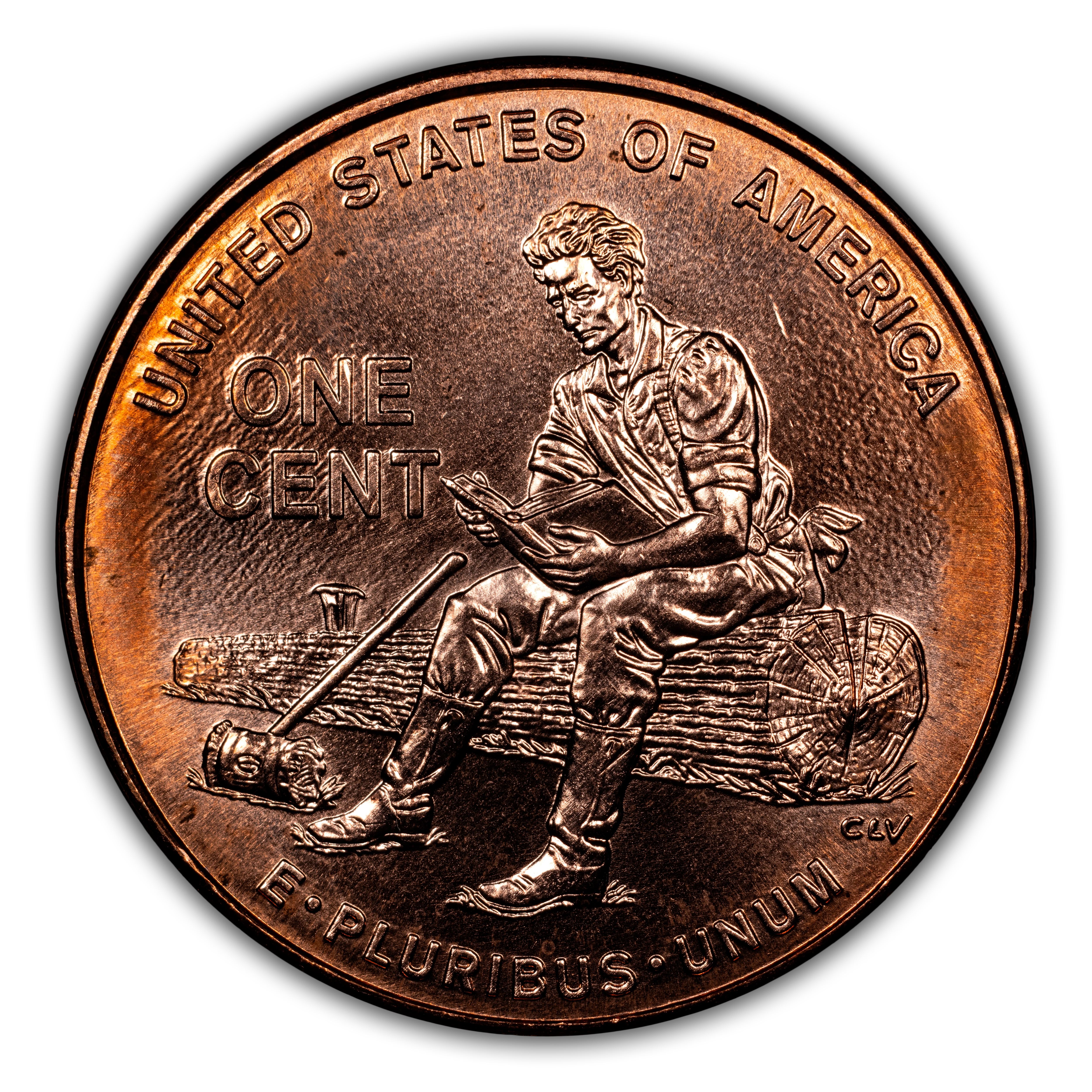 Reverse: Lincoln is portrayed sitting on a log reading a book, while taking a break from the laborious work of splitting work. Axe is resting nearby along with the words ONE CENT, UNITED STATES OF AMERICA, E PLURIBUS UNUM.
