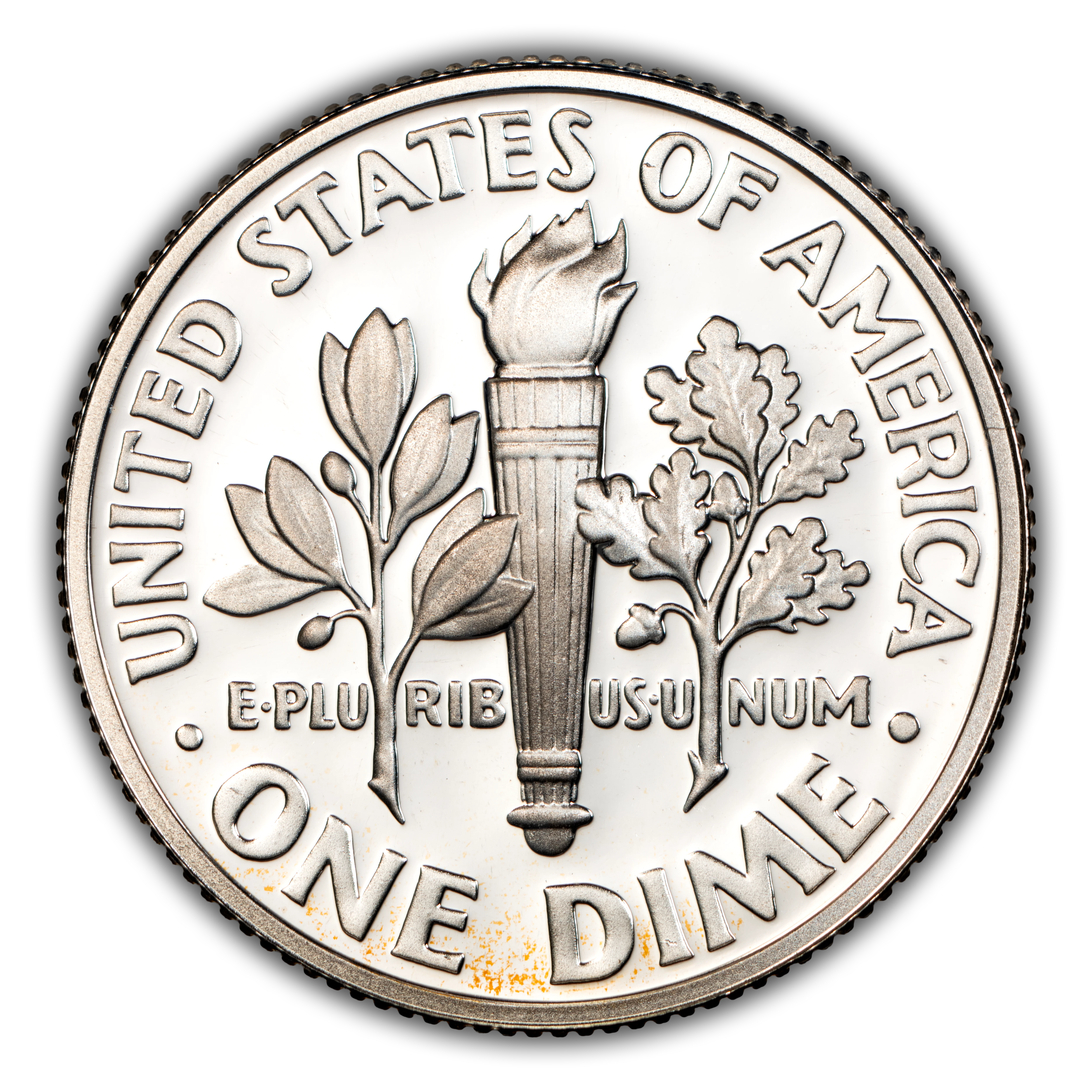 Reverse: Torch of Liberty is flanked by olive branches in the center with UNITED STATES OF AMERICA * ONE DIME around the circumference.