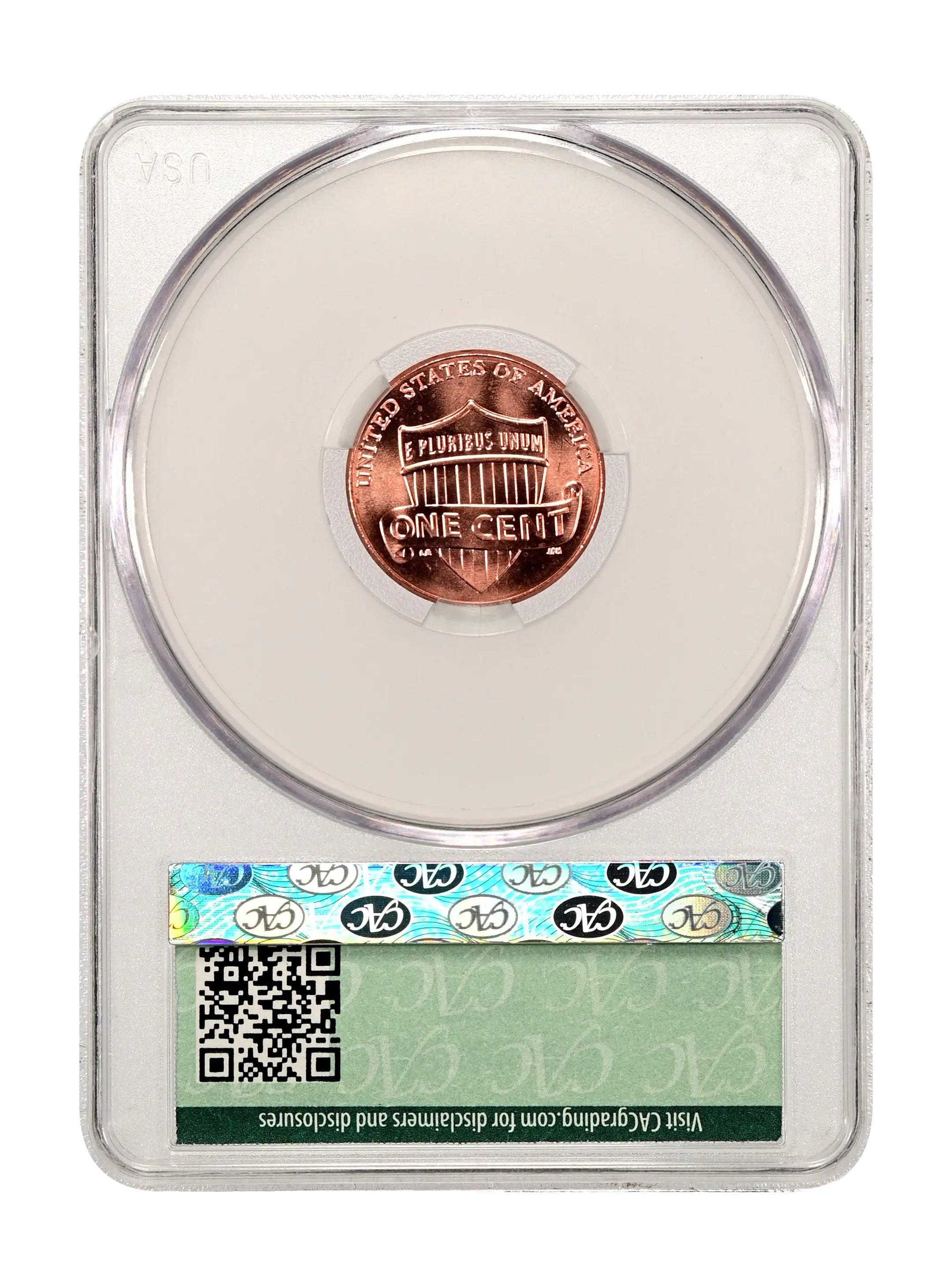 Reverse: A shield with the words E PLURIBUS UNUM is centered with the words UNITED STATES OF AMERICA on the top periphery and ONE cent in a ribbon across the shield.