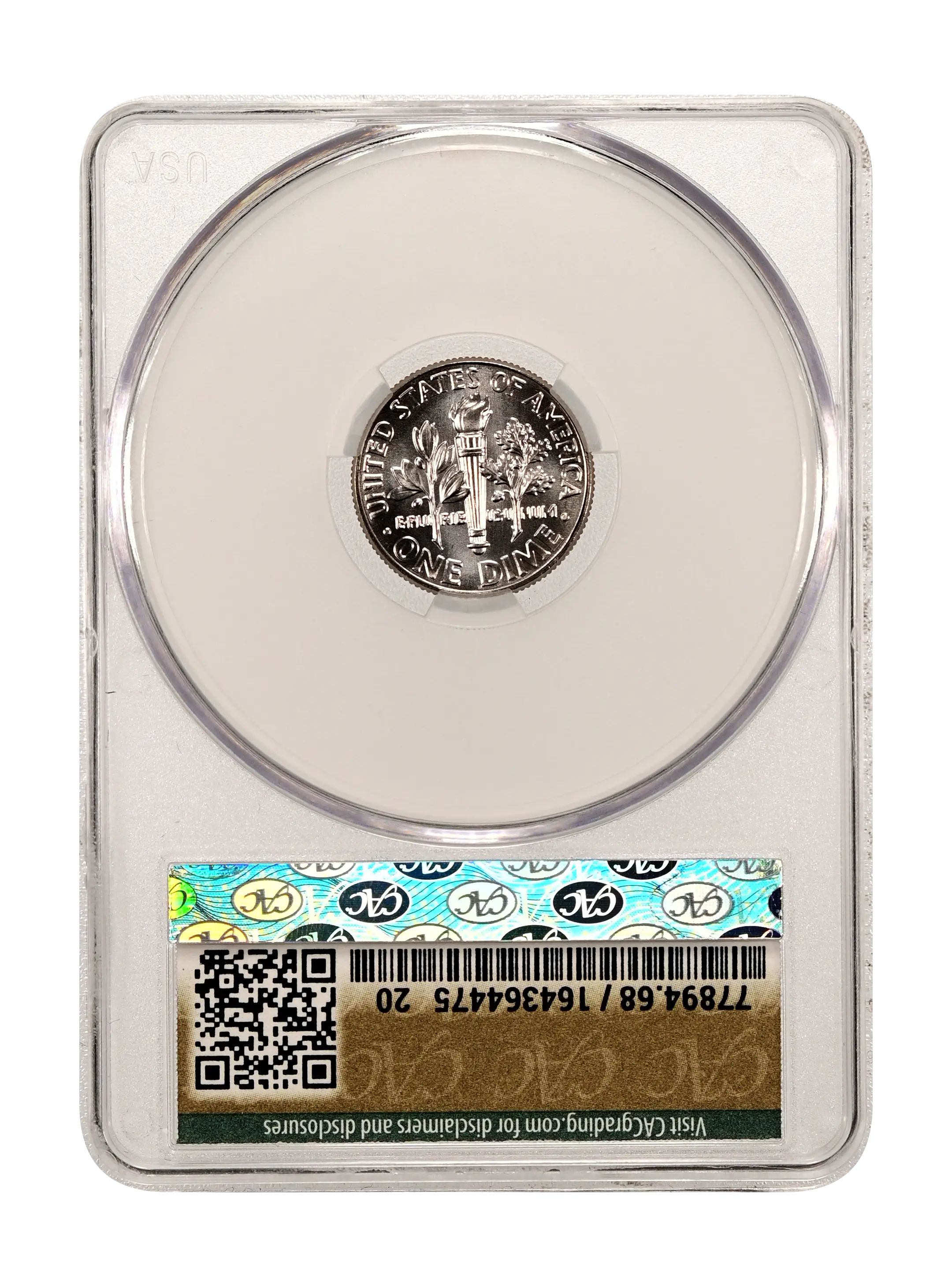 Reverse: Torch of Liberty is flanked by olive branches in the center with UNITED STATES OF AMERICA * ONE DIME around the circumference.