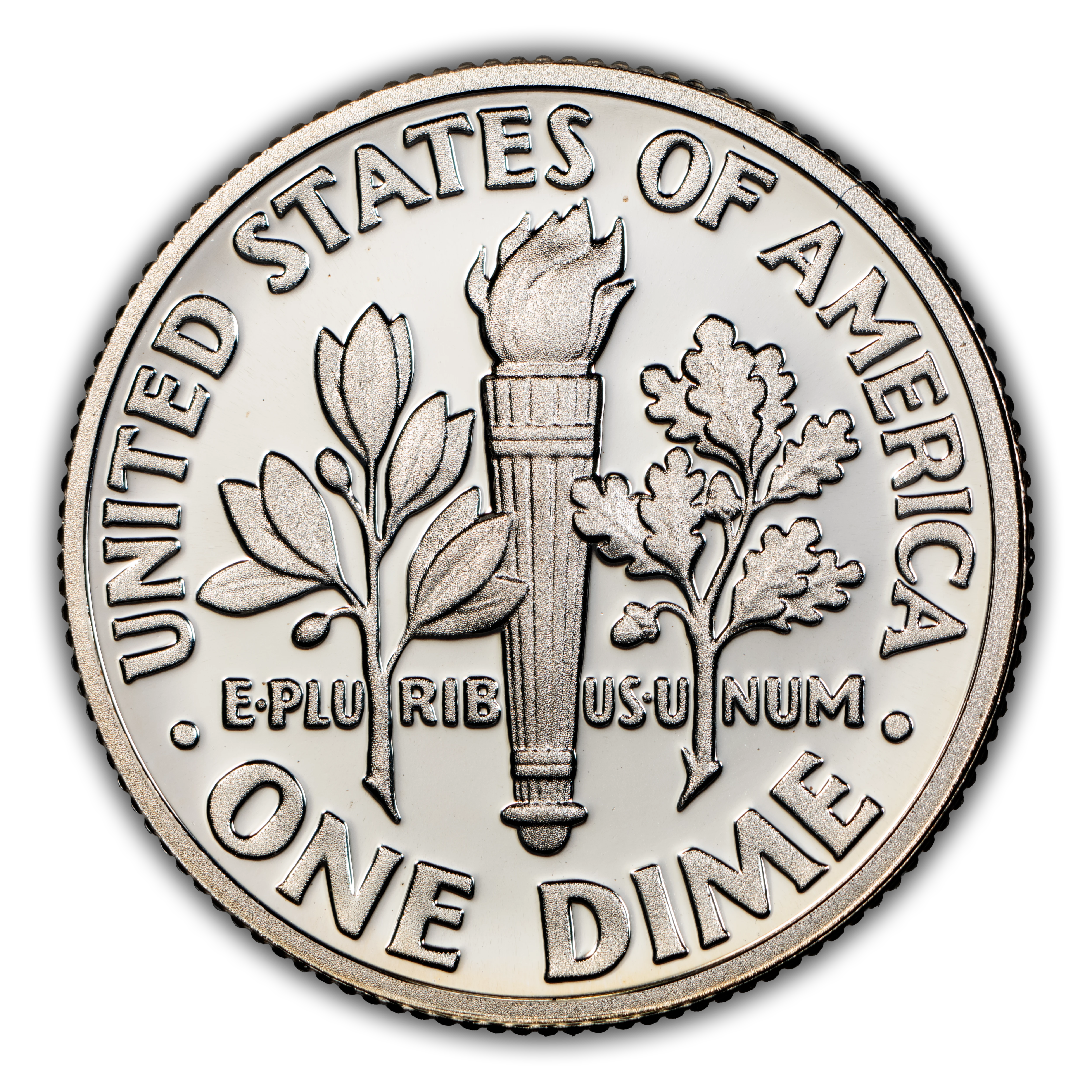 Reverse: Torch of Liberty is flanked by olive branches in the center with UNITED STATES OF AMERICA * ONE DIME around the circumference.
