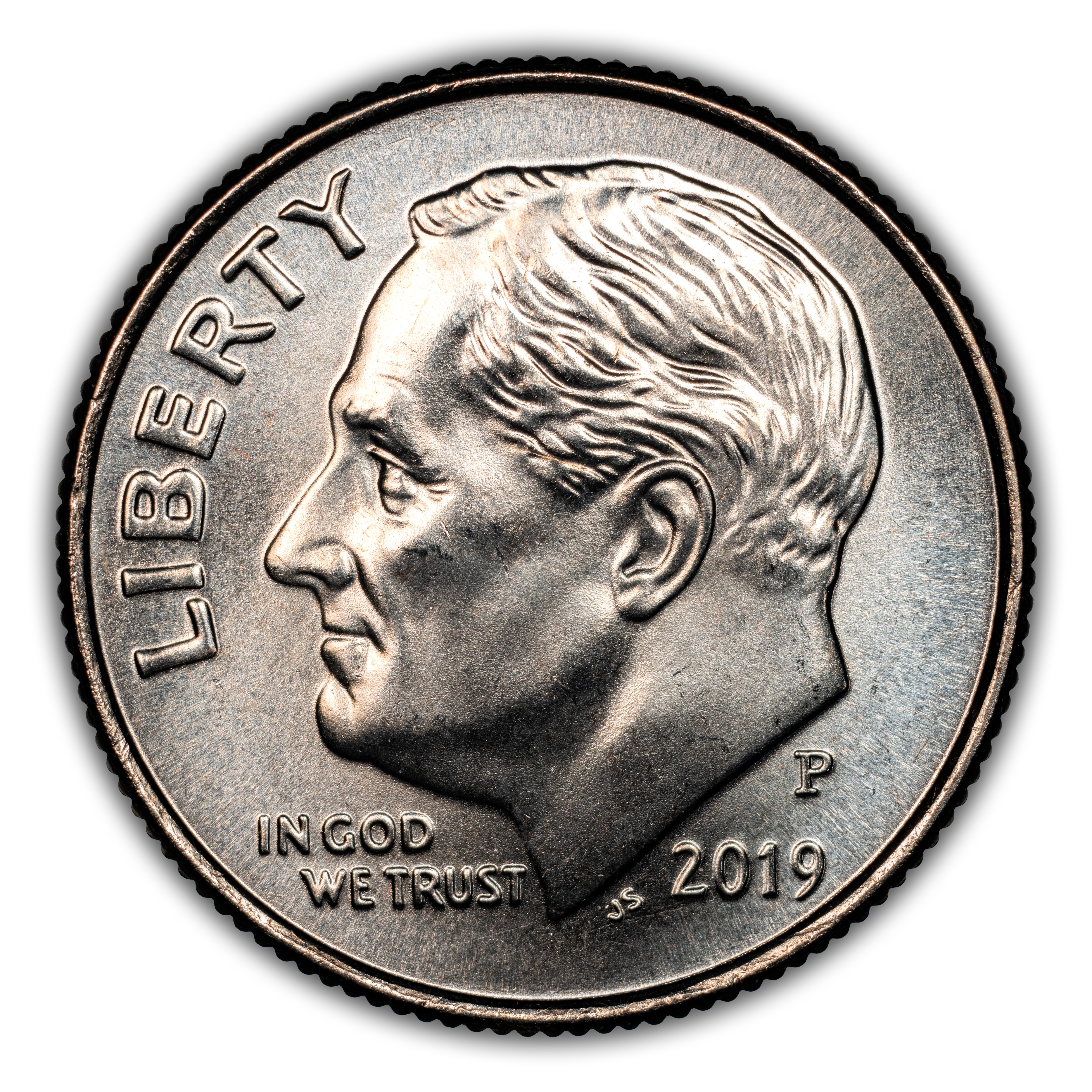 Obverse: Portrait of Franklin Roosevelt with the word LIBERTY at the left periphery. IN GOD WE TRUST written horizontally at 7 o'clock left of the portrait. The date is positioned to the right of Franklin's neck.