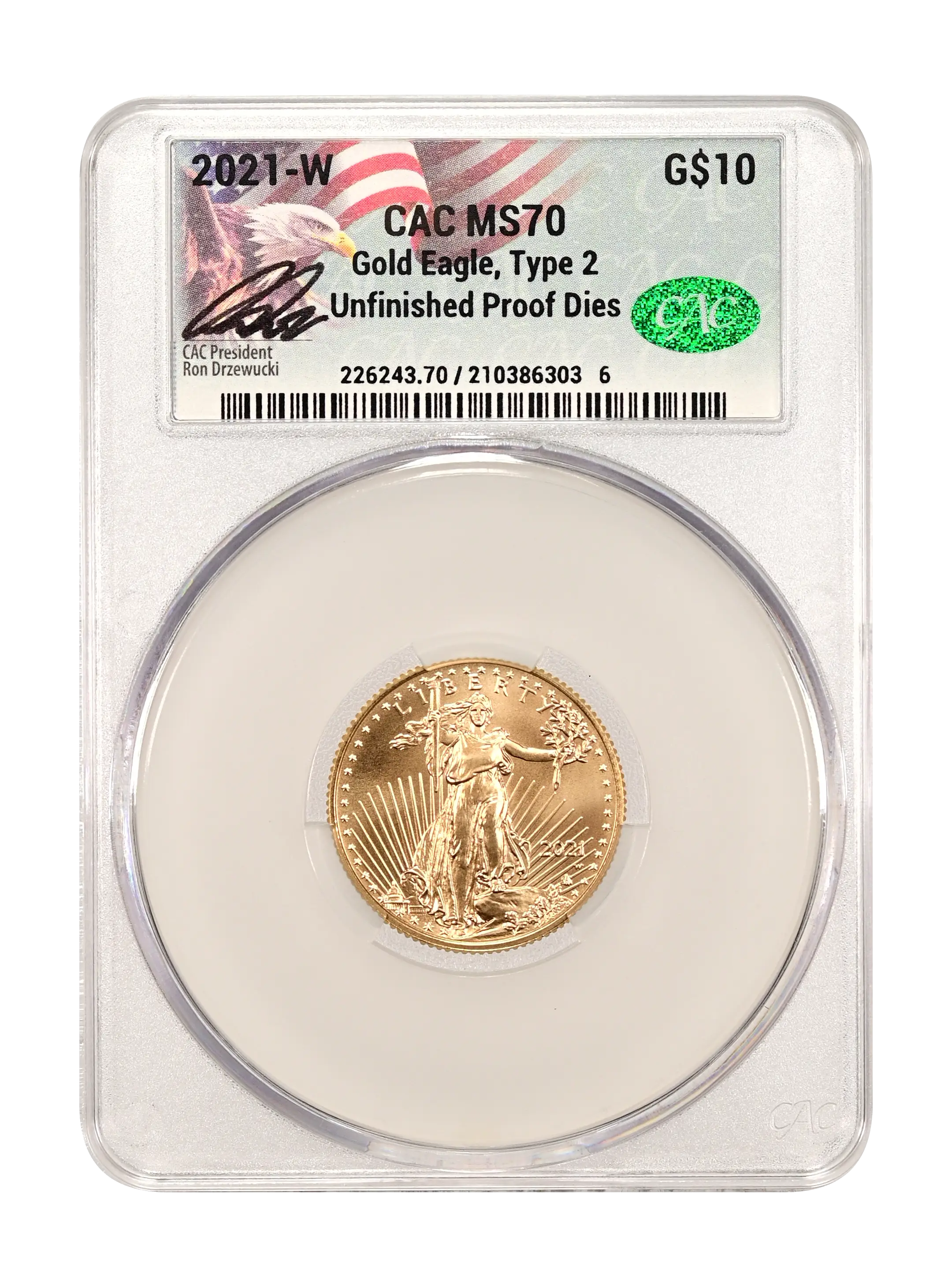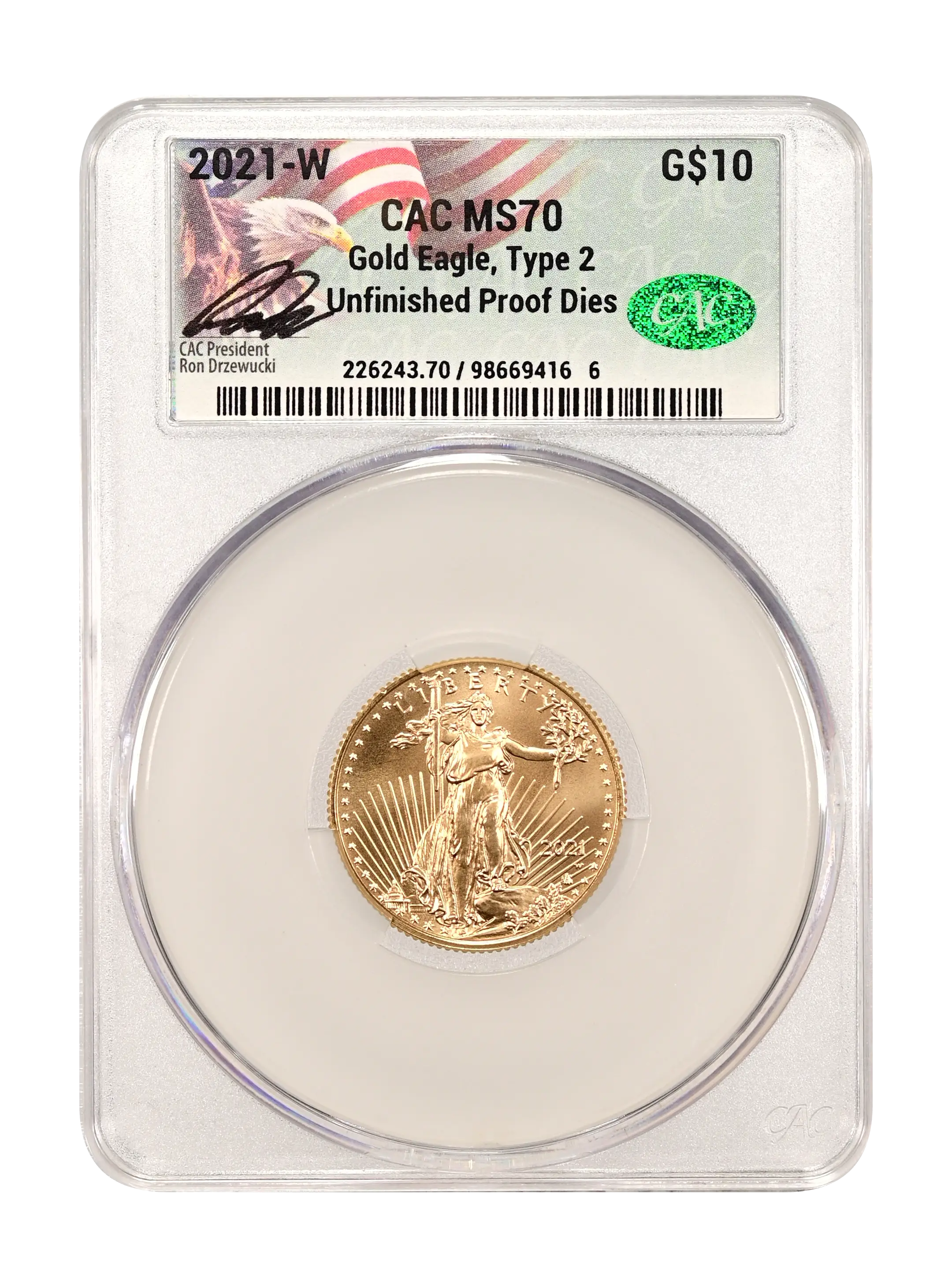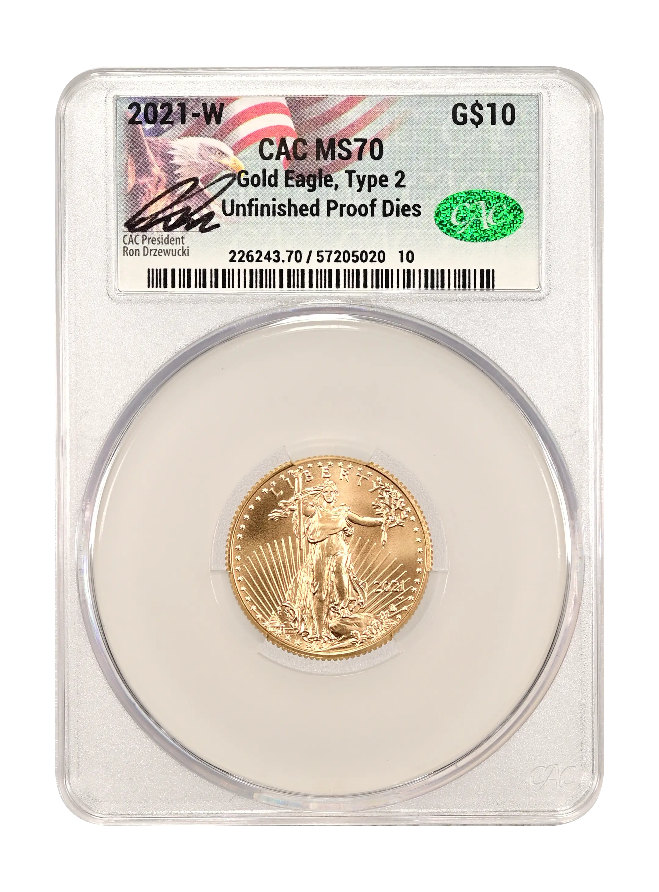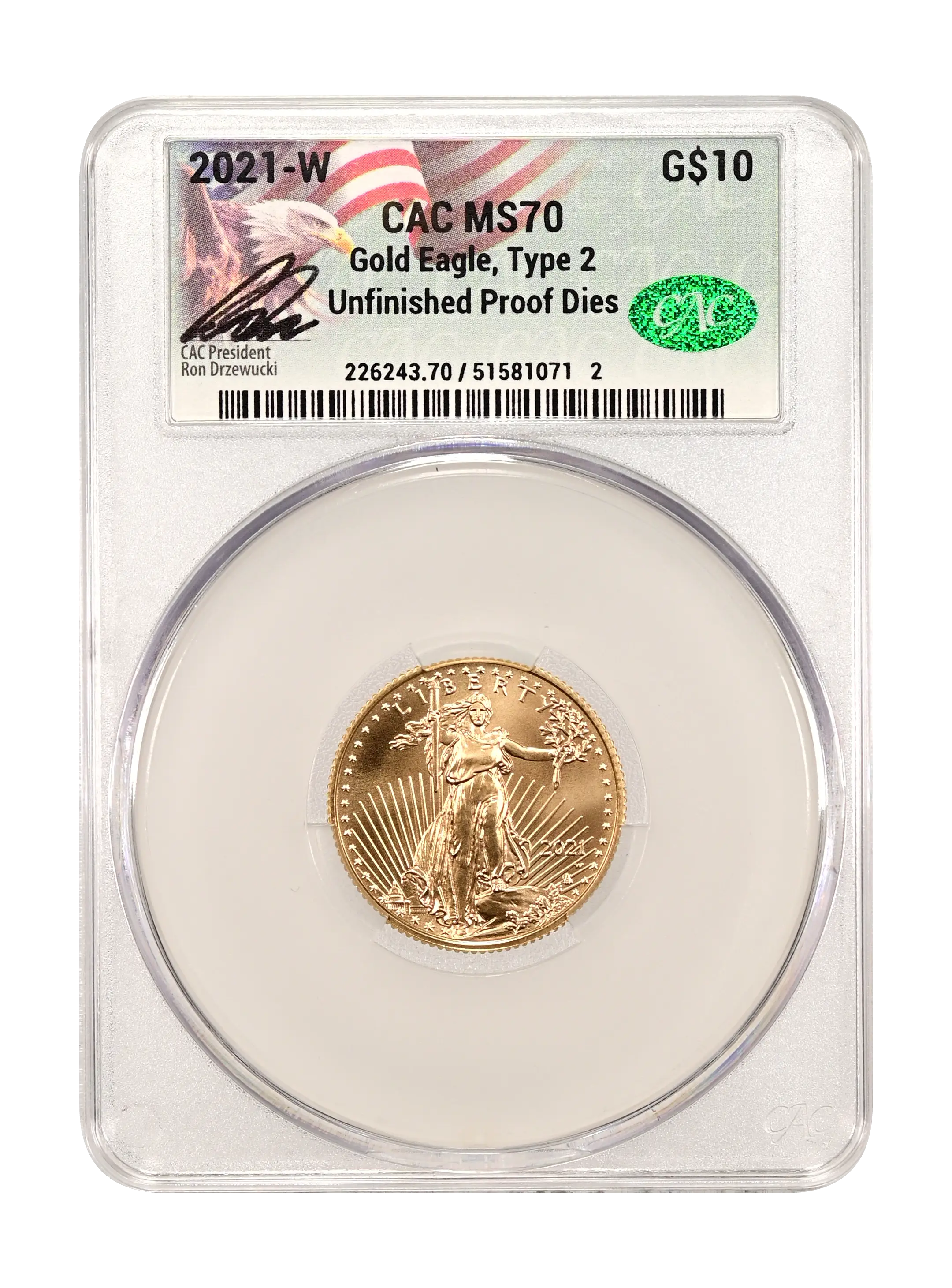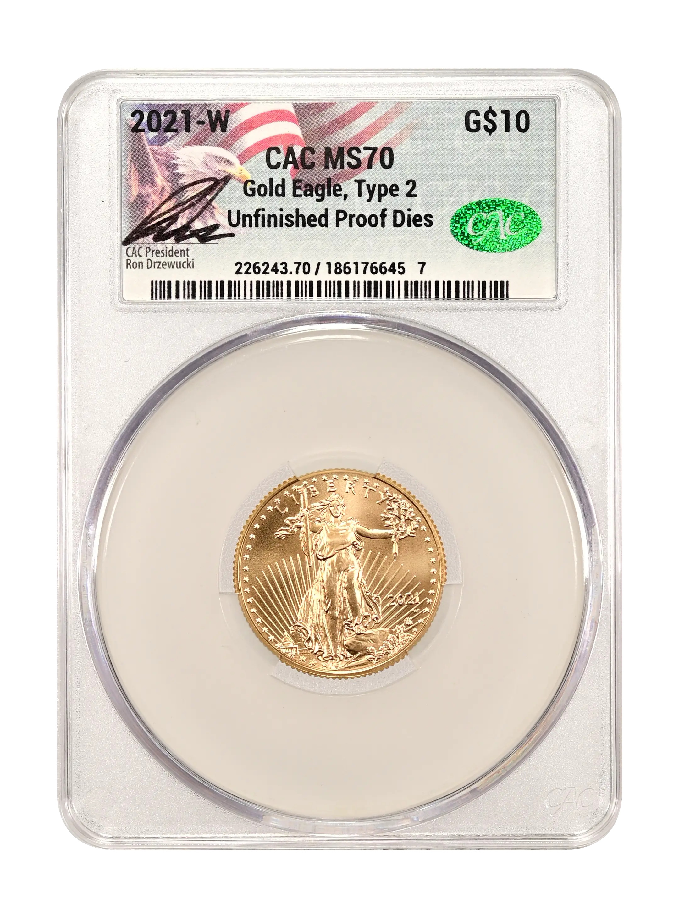 2021-W Gold Eagle, Type 2 G$10 Unfinished Proof Dies CAC MS70