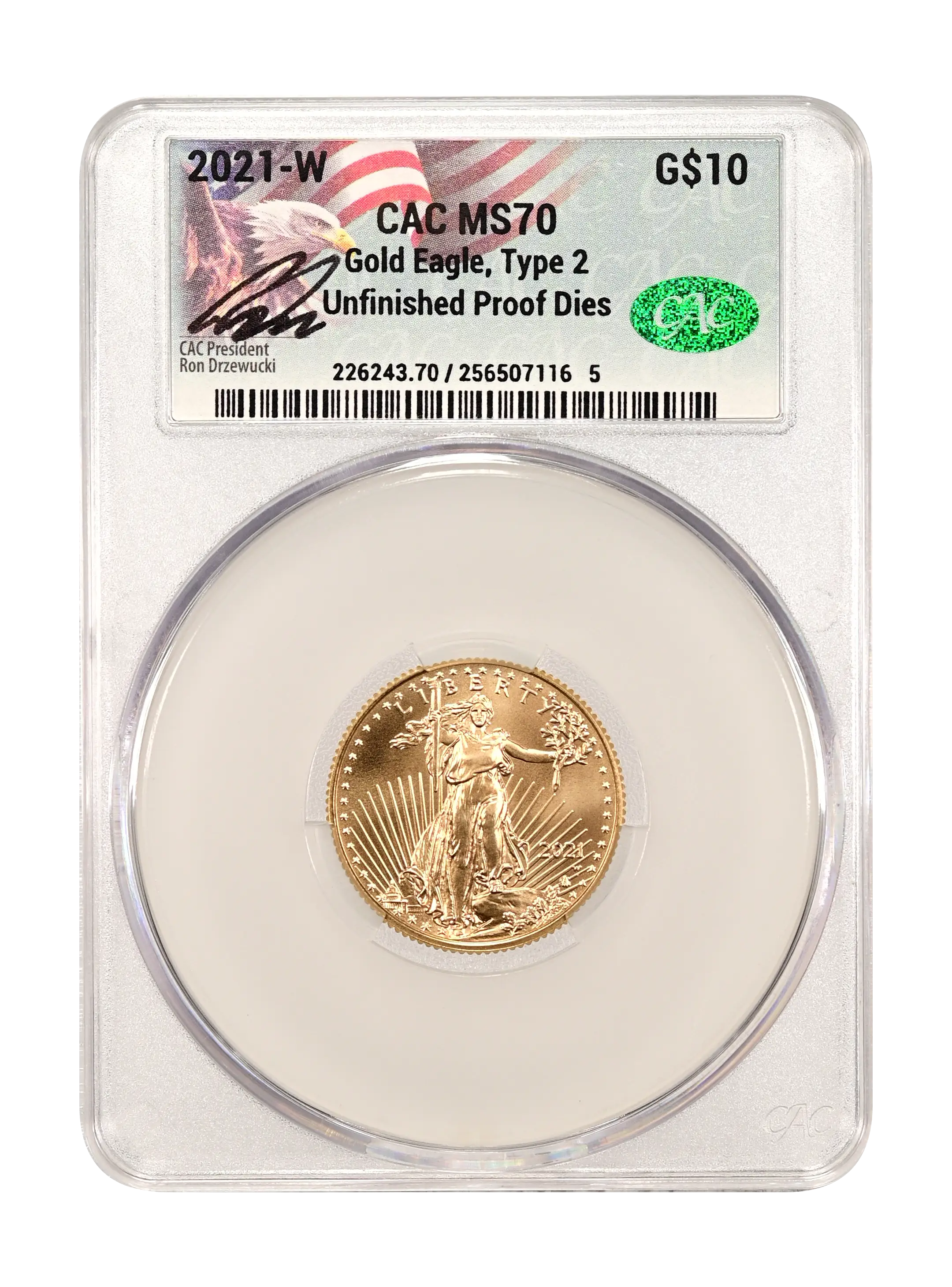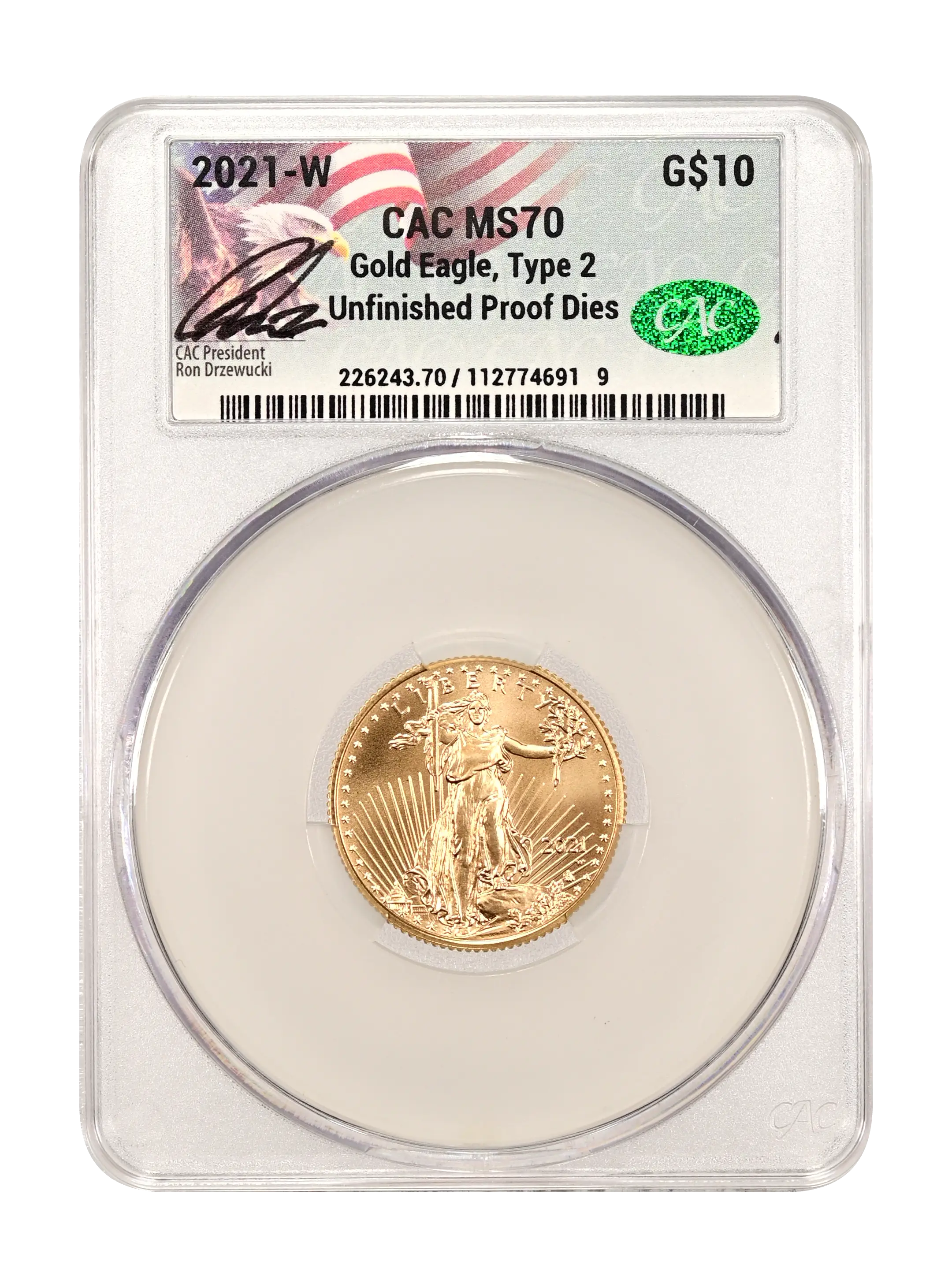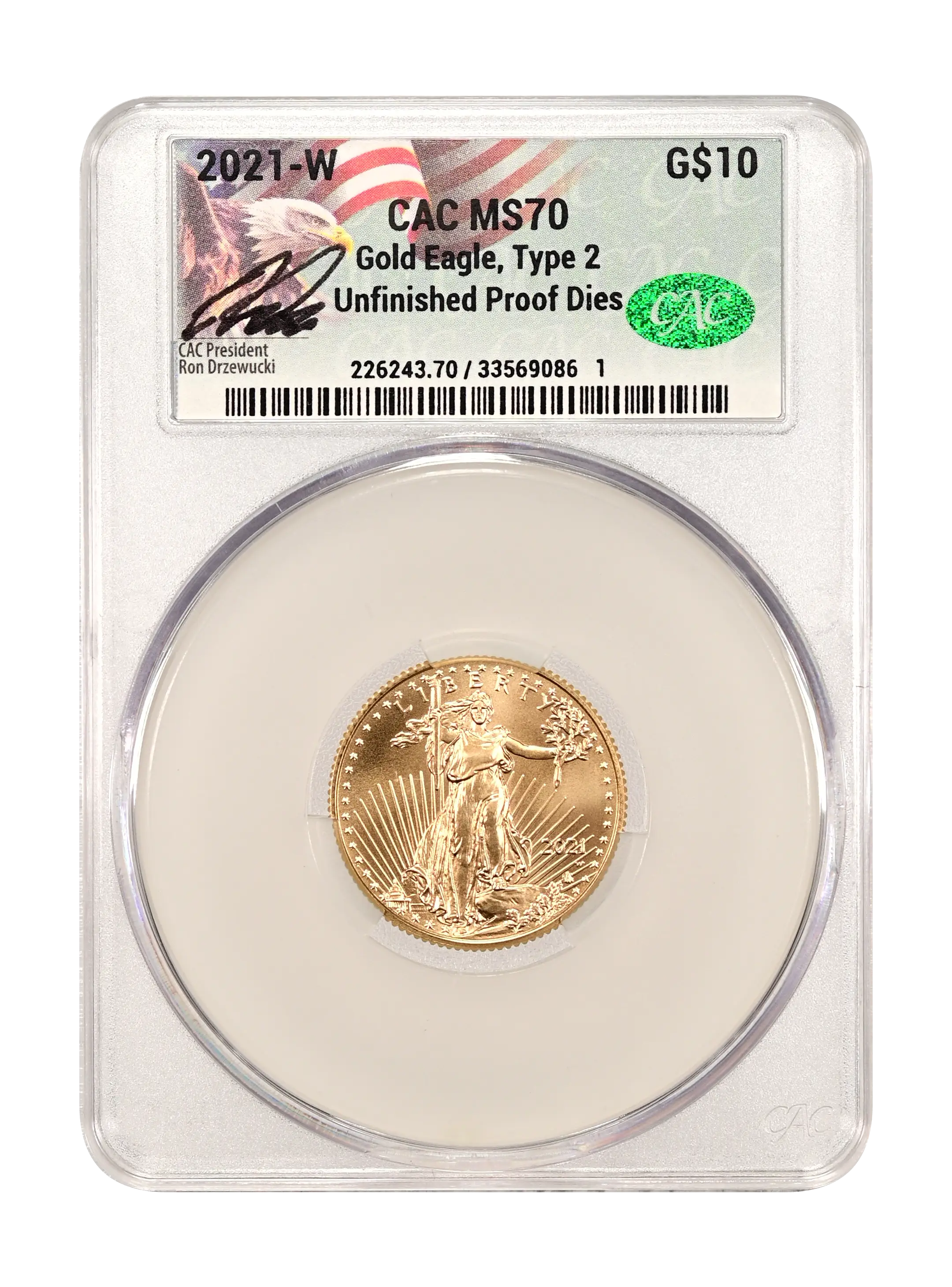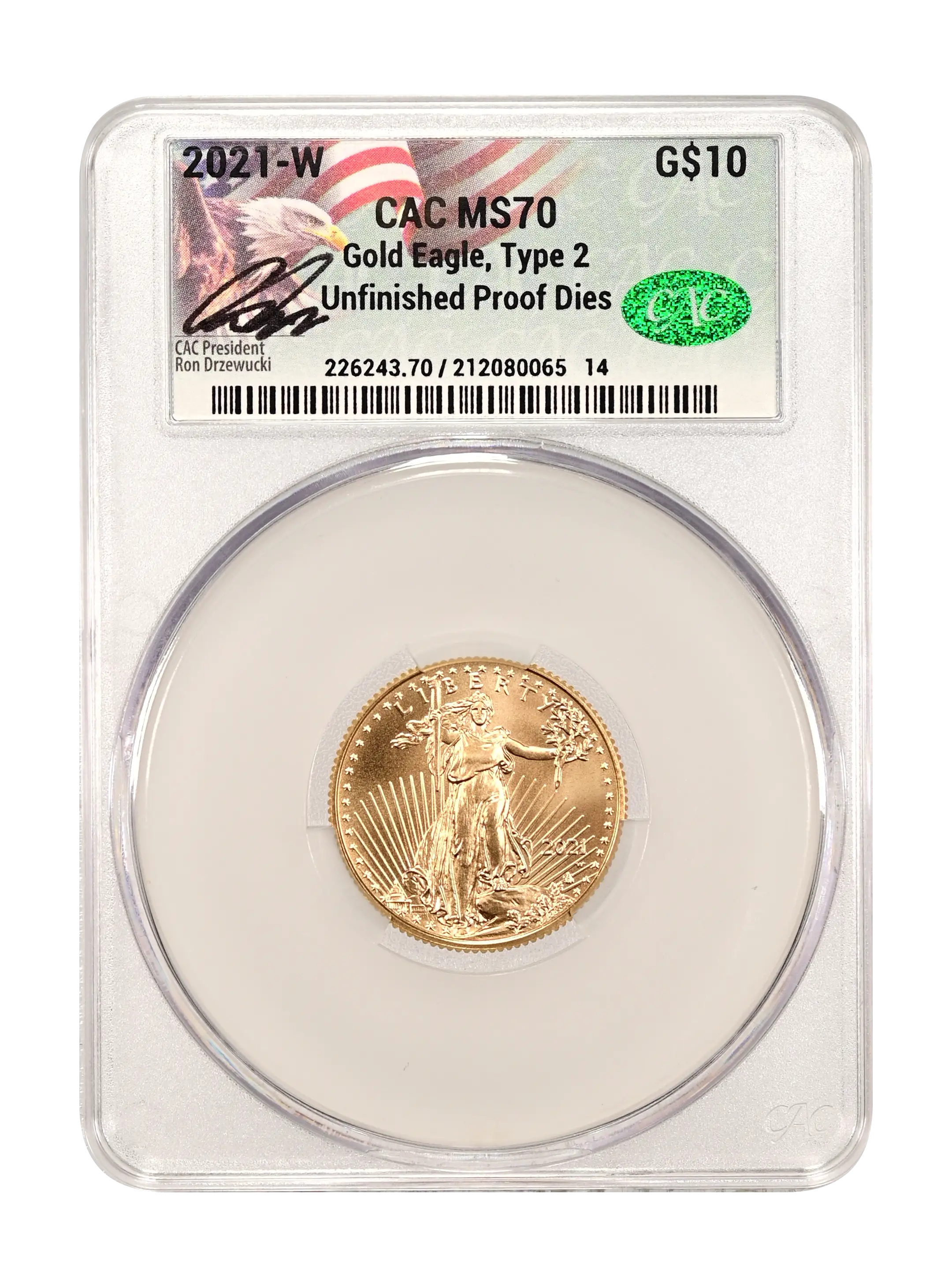2021-W Gold Eagle, Type 2 G$10 Unfinished Proof Dies CAC MS70
