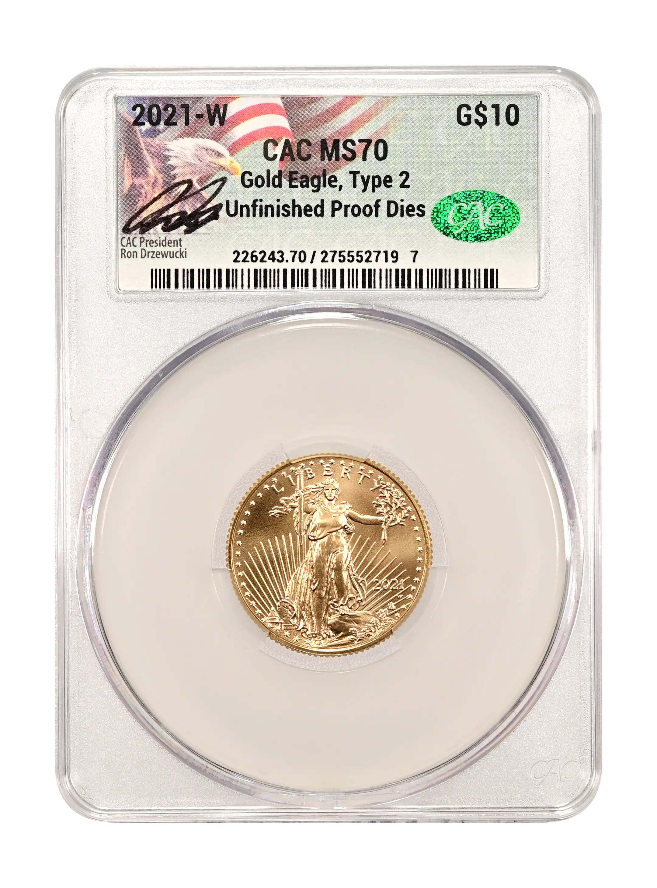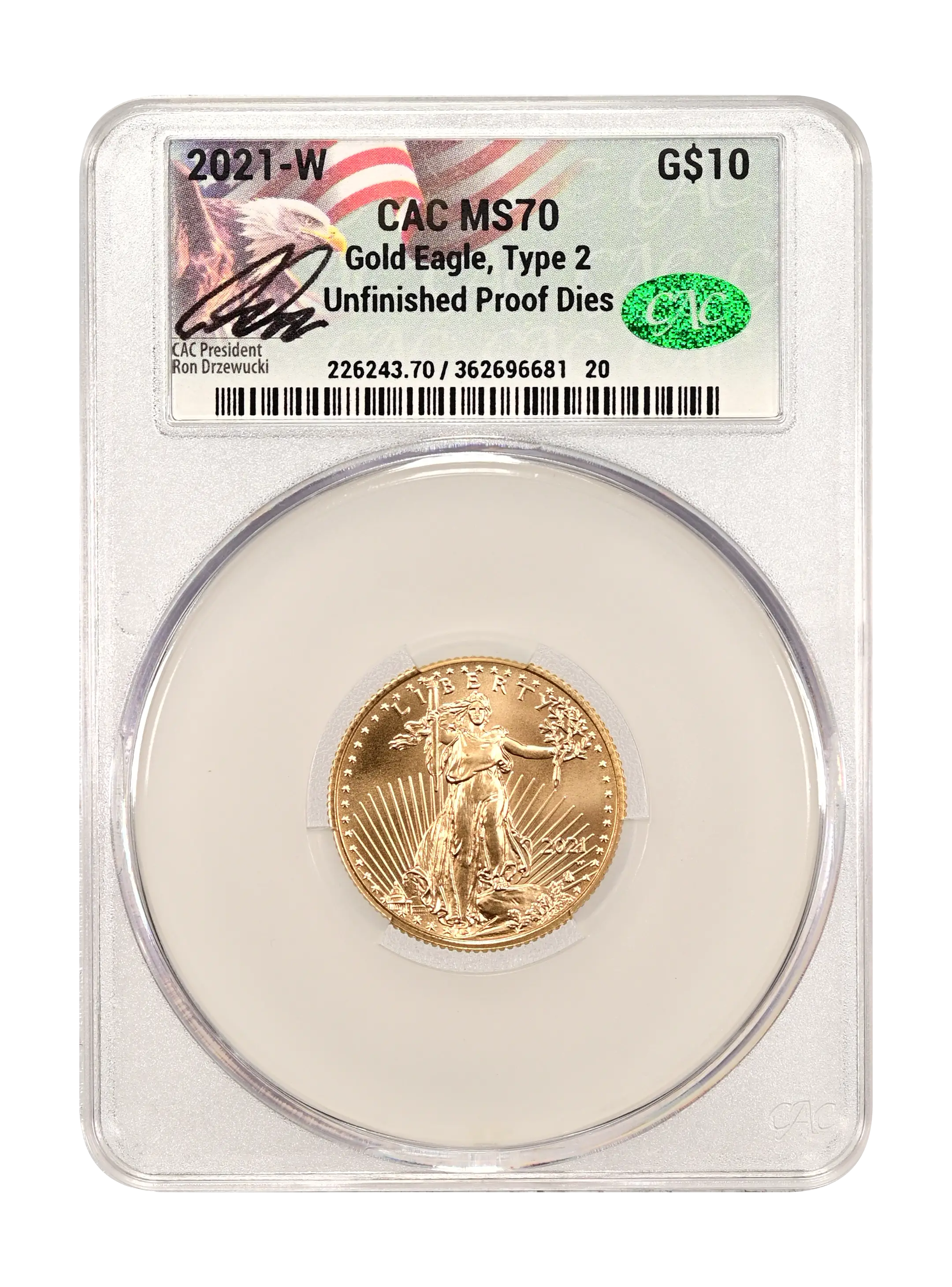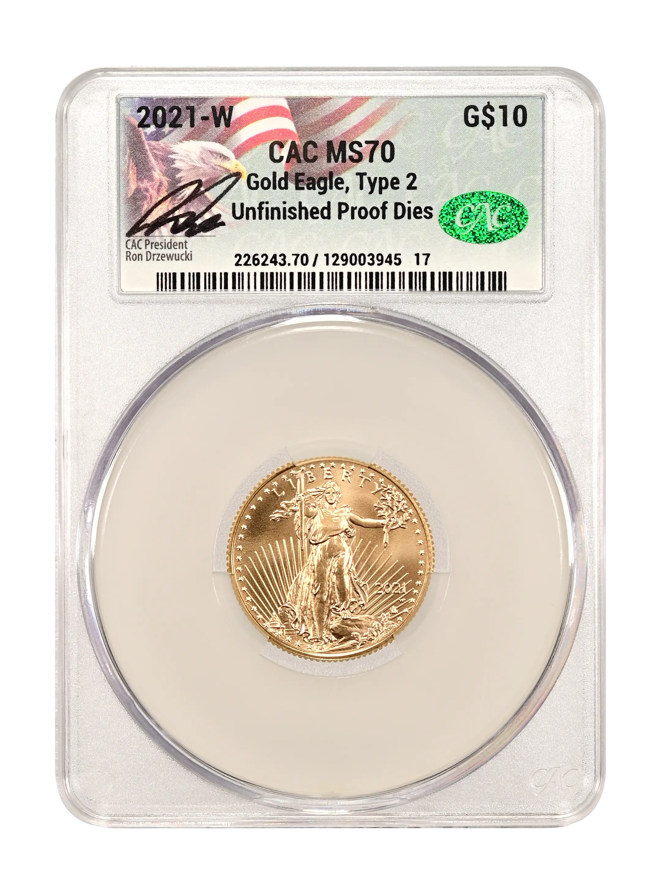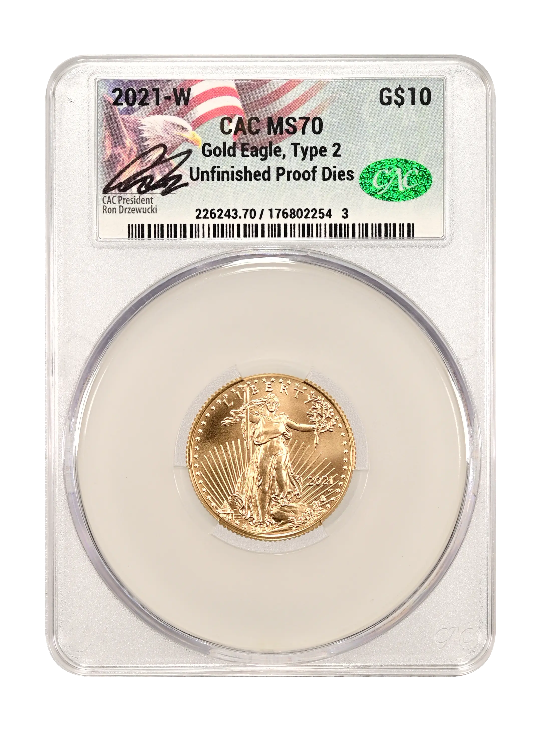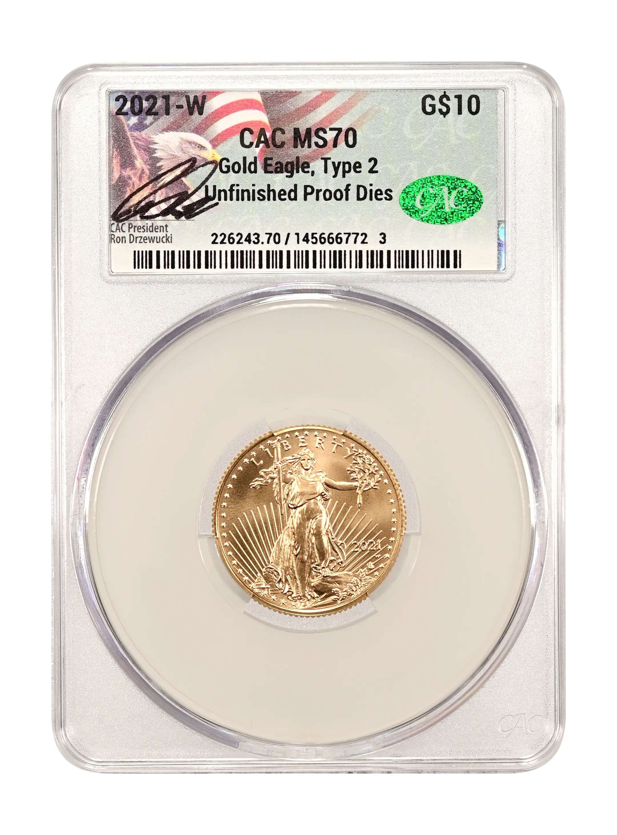 2021-W Gold Eagle, Type 2 G$10 Unfinished Proof Dies CAC MS70