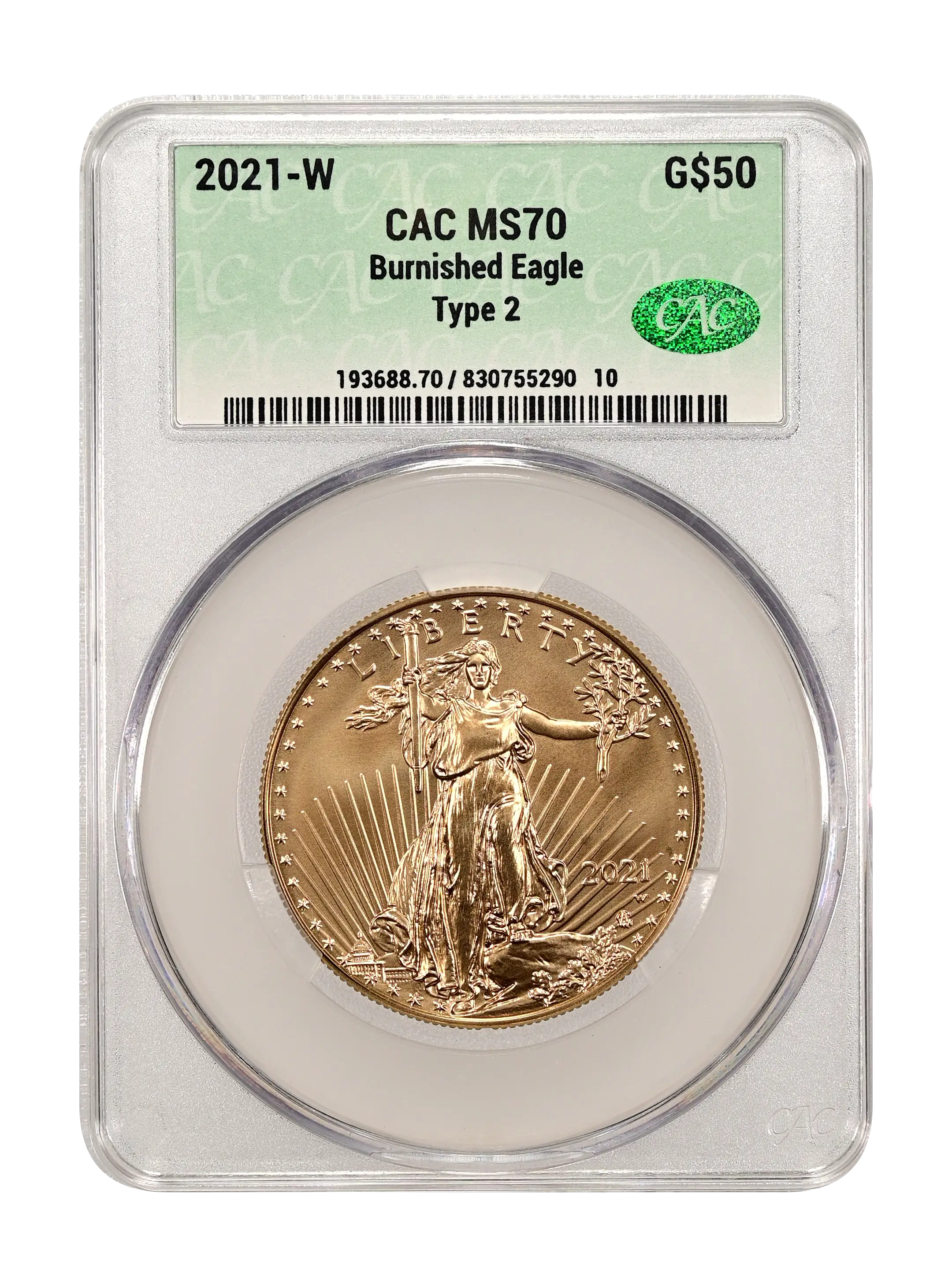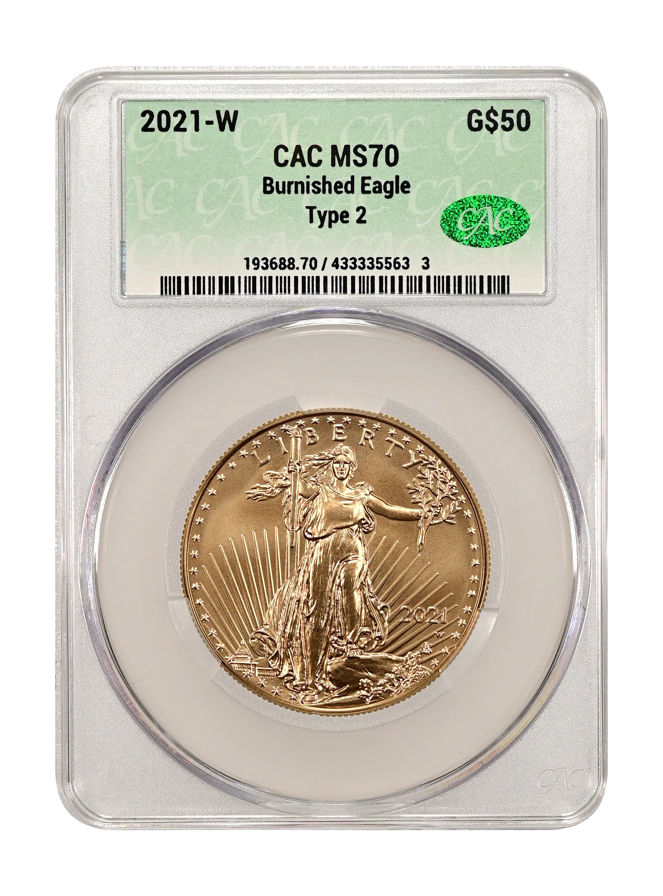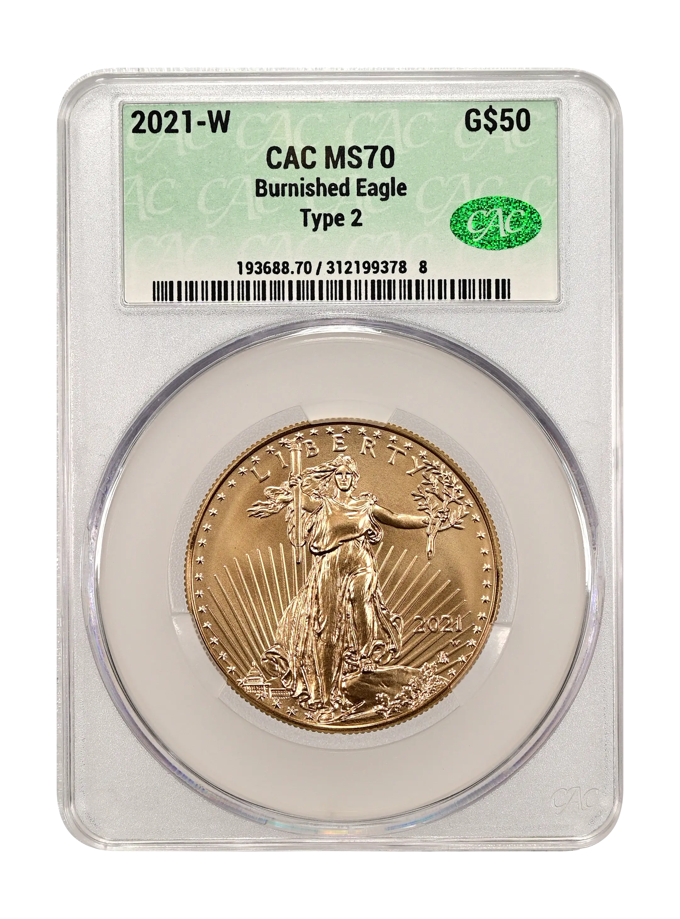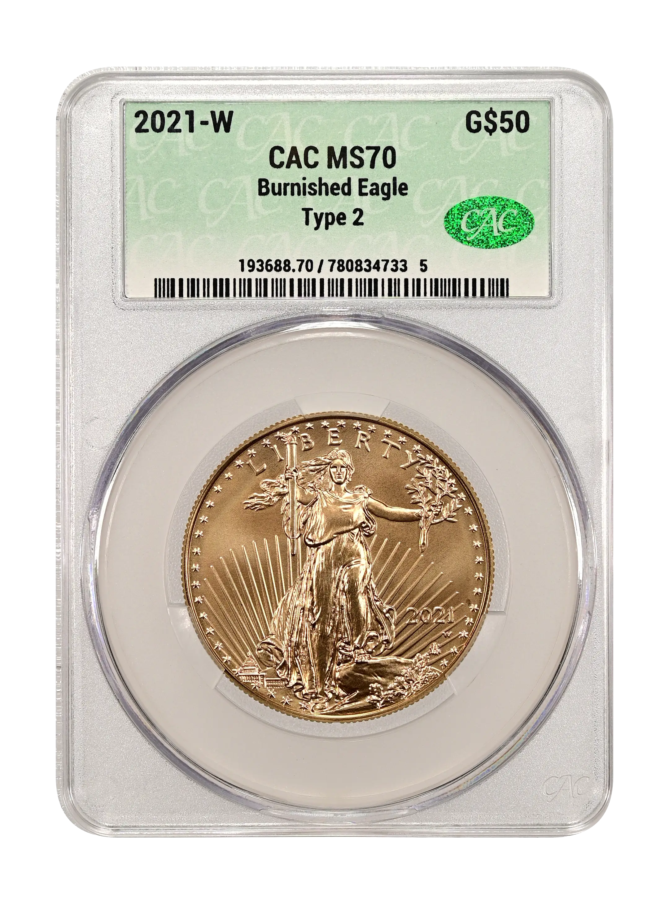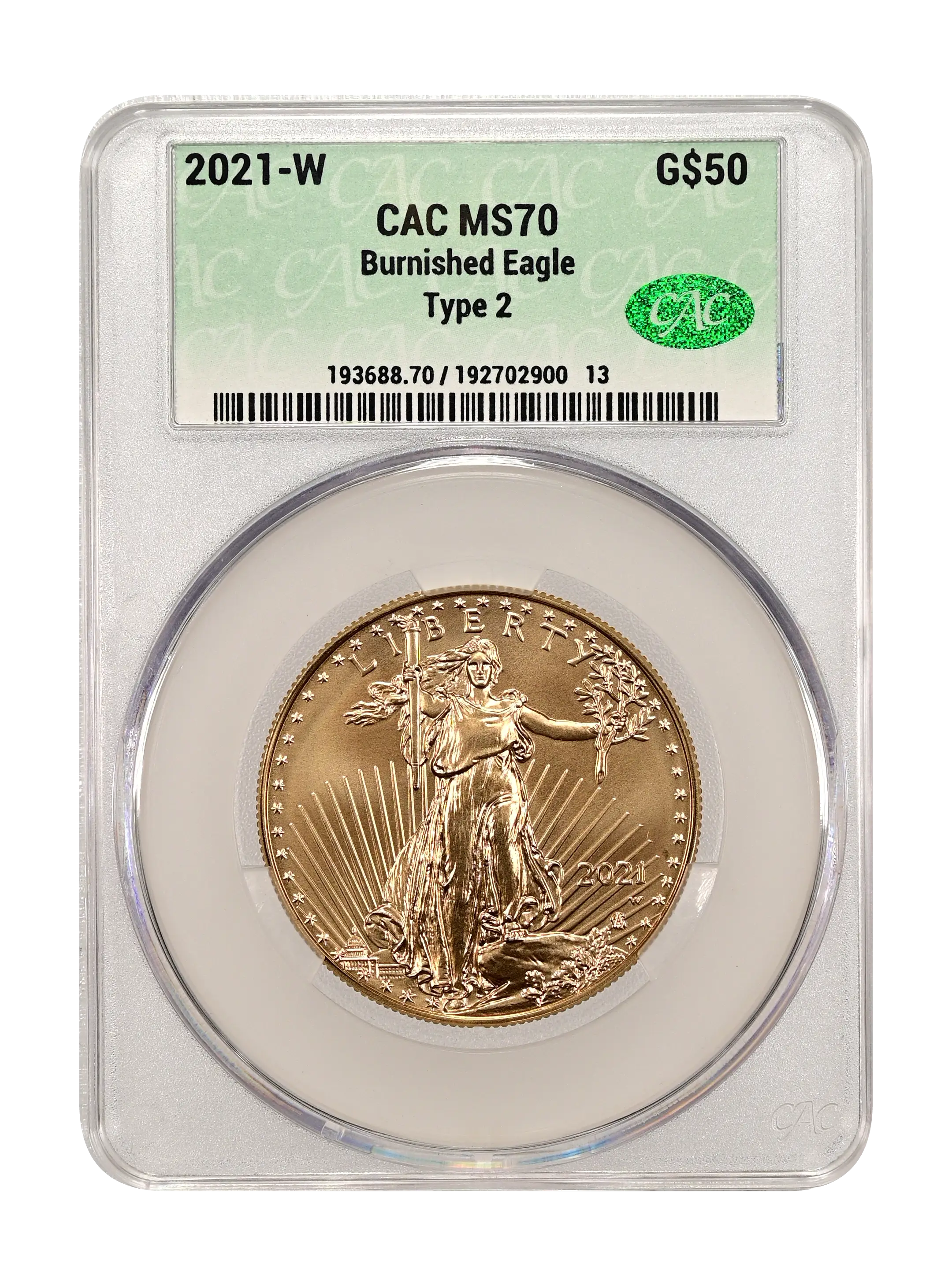 2021-W Burnished Gold Eagle G$50 Type 2 CAC MS70