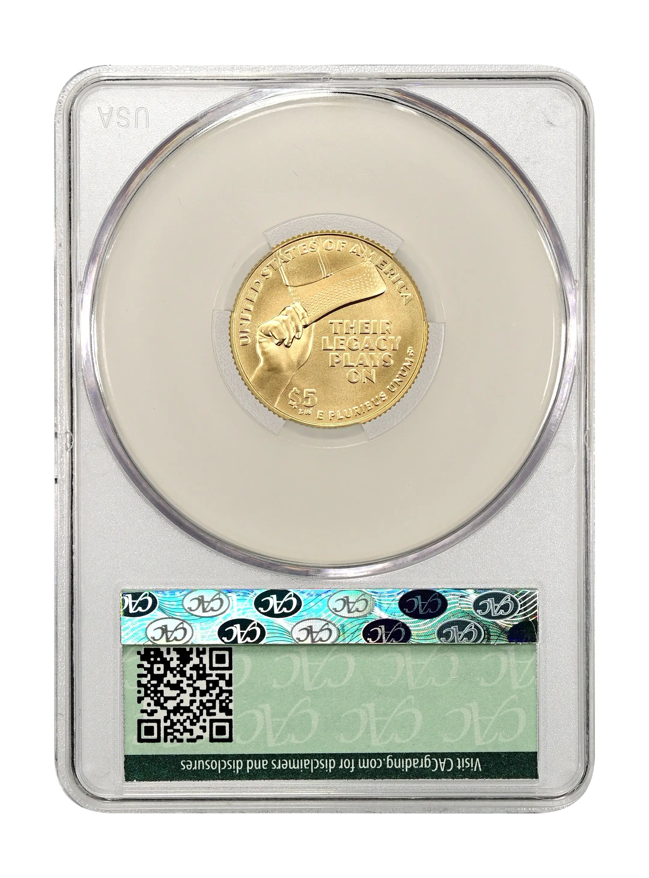 Reverse: Depicts the gesture of tipping one's cap, an important sign of respect for players. Inscriptions are "UNITED STATES OF AMERICA," "THEIR LEGACY PLAYS ON," "$5," and "E PLURIBUS UNUM."