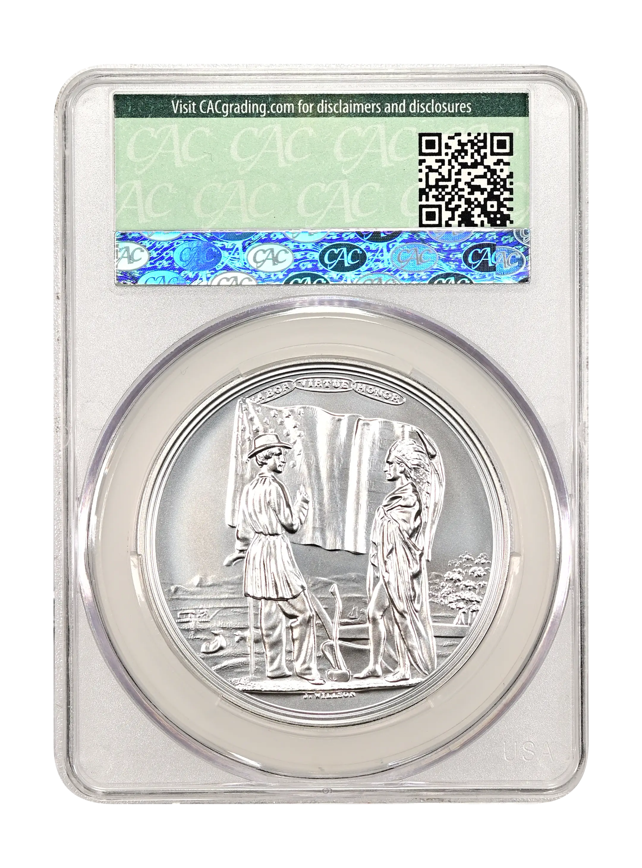 Reverse: The reverse (tails) depicts a farmer, leaning on a plow and conversing with an Indian Chief, an American flag in the background, with “LABOR,” “VIRTUE,” “HONOR,” inscribed above the flag.