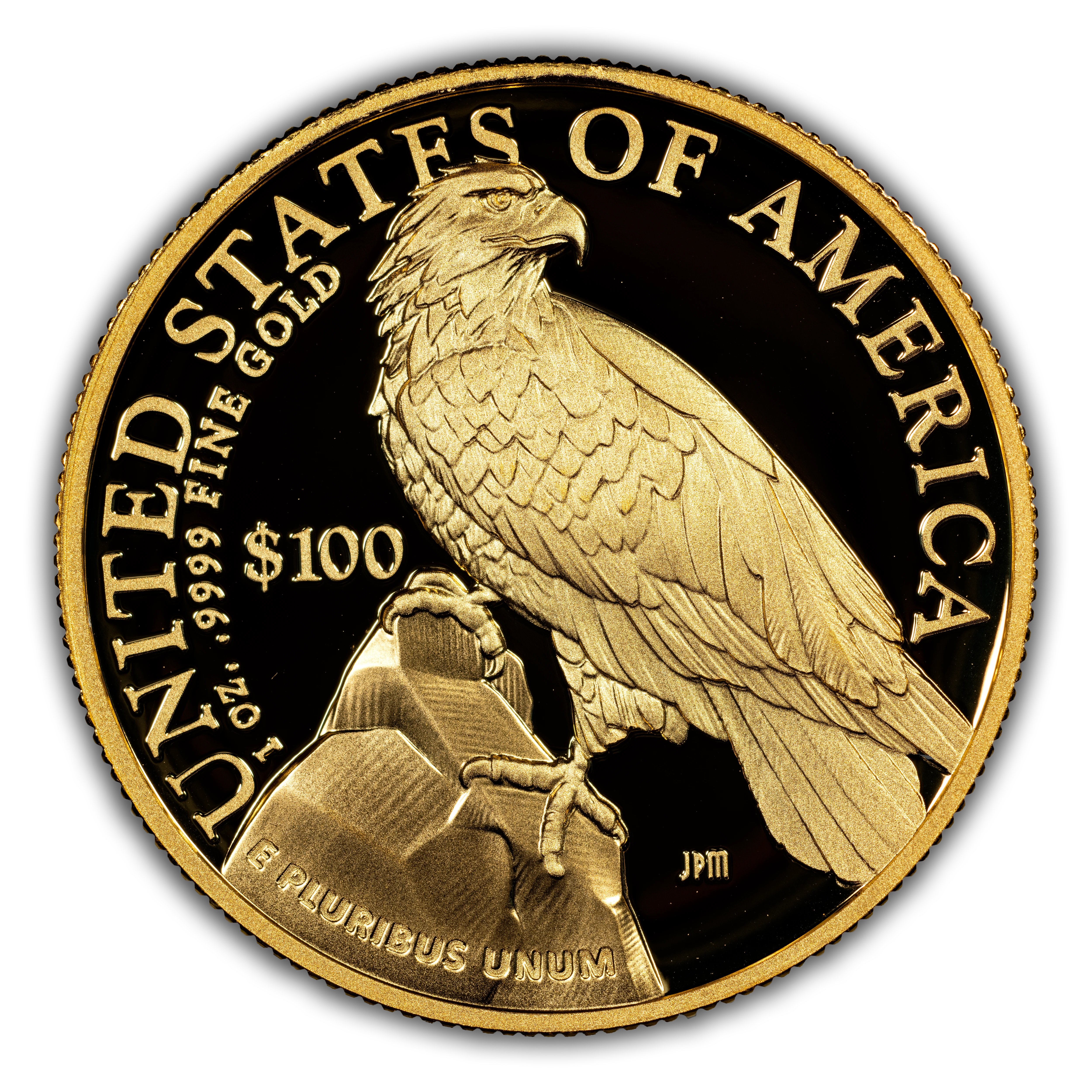 Reverse: The reverse (tails) design depicts a young bald eagle standing on a rocky outcropping moments before it takes flight. Inscriptions are "UNITED STATES OF AMERICA," “1 OZ.," ".9999 FINE GOLD," "$100," and "E PLURIBUS UNUM."