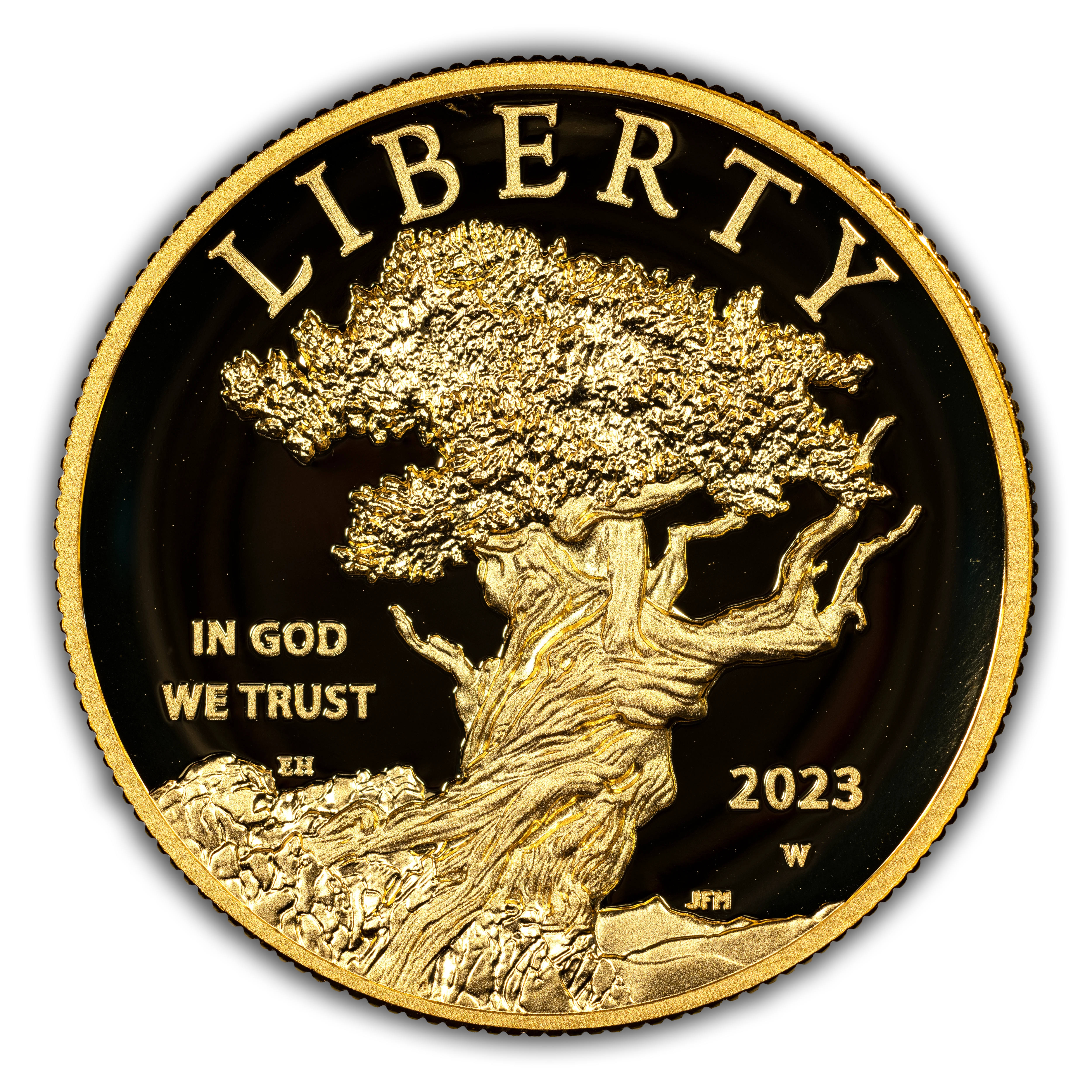 Obverse: The obverse (heads) design features a bristlecone pine, a species native to California, Nevada, and Utah, thought to be the oldest living organisms on Earth, living up to 5,000 years. Bristlecone pines grow in places where other plants cannot and are often the species first to repopulate the land after cataclysmic changes, such as a lava run or glacial runoff. Inscriptions are "LIBERTY," "IN GOD WE TRUST," and "2023."