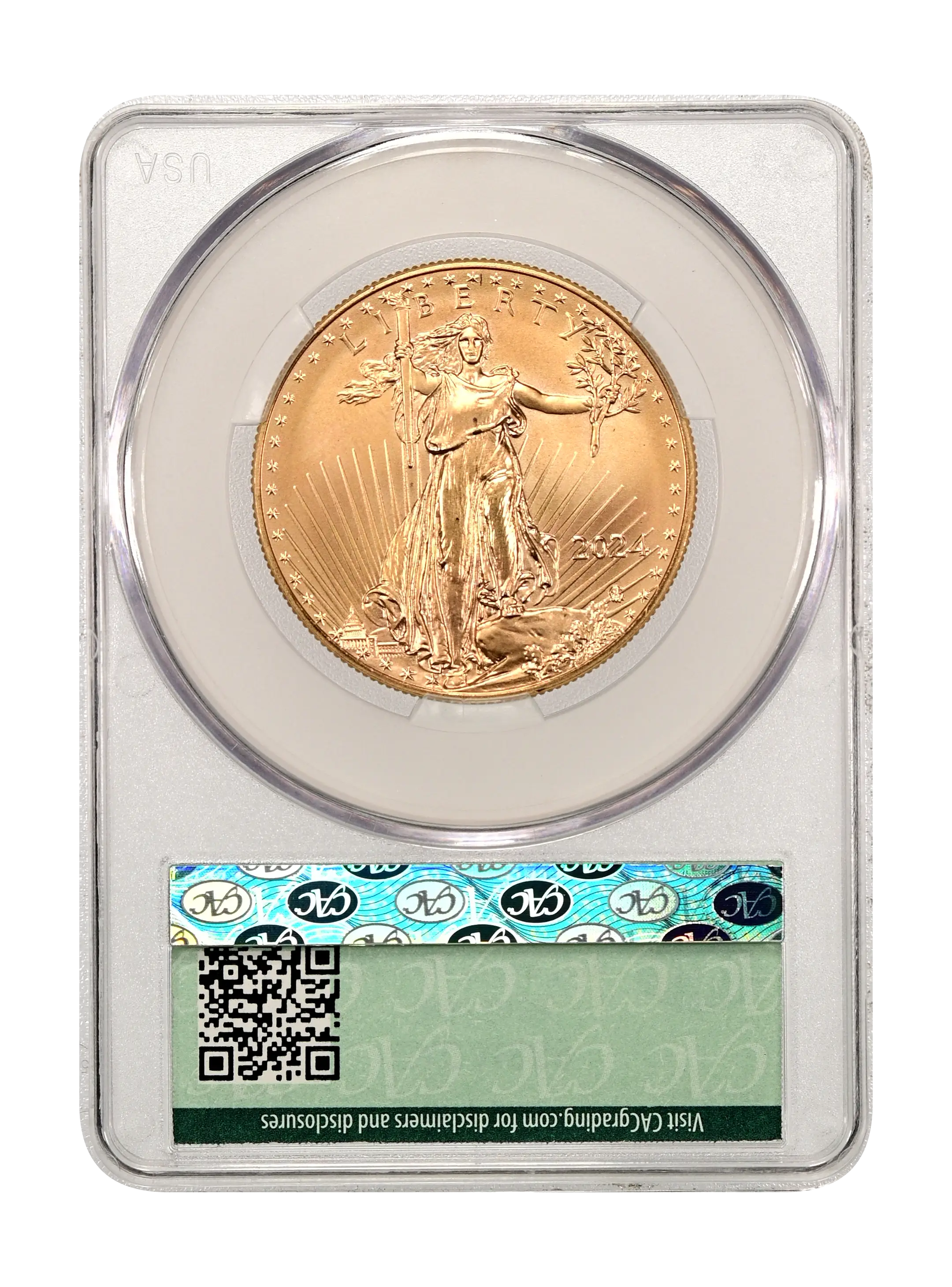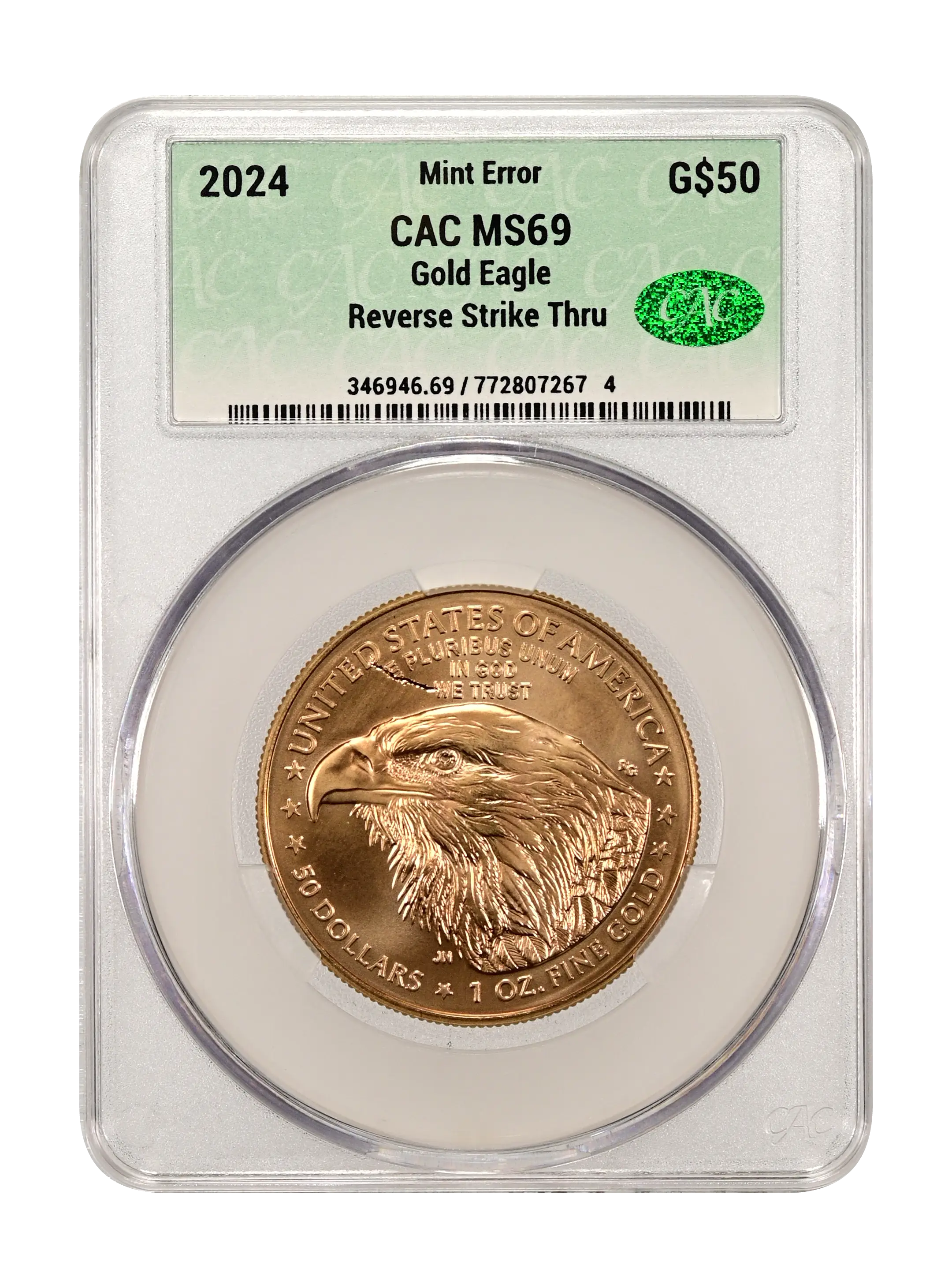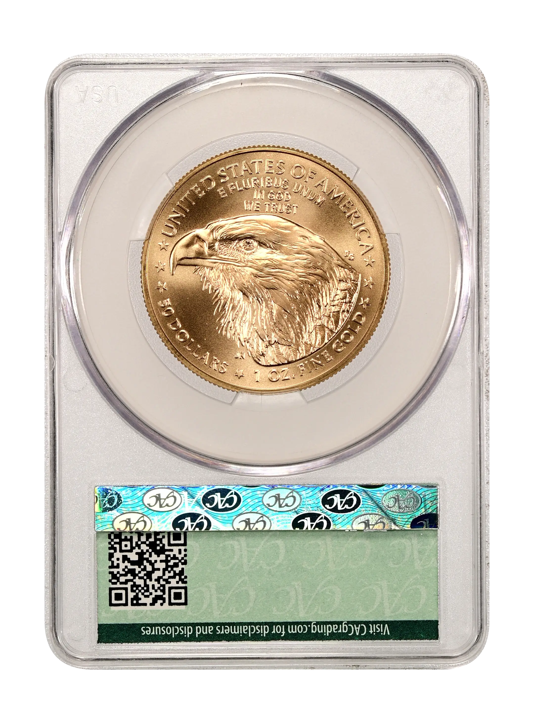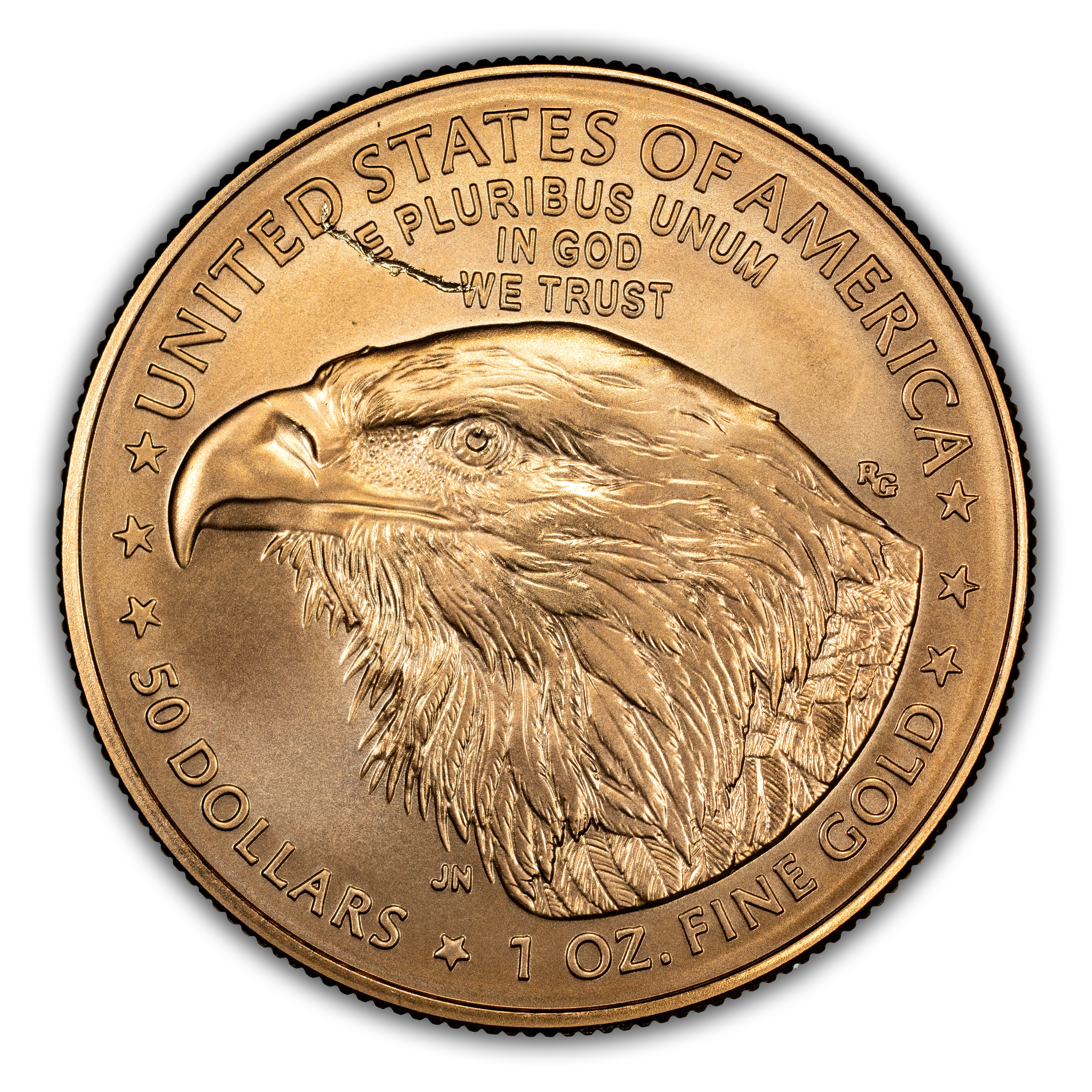 Reverse: A large head of an eagle is accompanied by the words UNITED STATES OF AMERICA, E PLURIBUS UNUM, IN GOD WE TRUST, 50 DOLLARS , 1 OZ. GOLD, as well as the designers' initials of RG and JN.