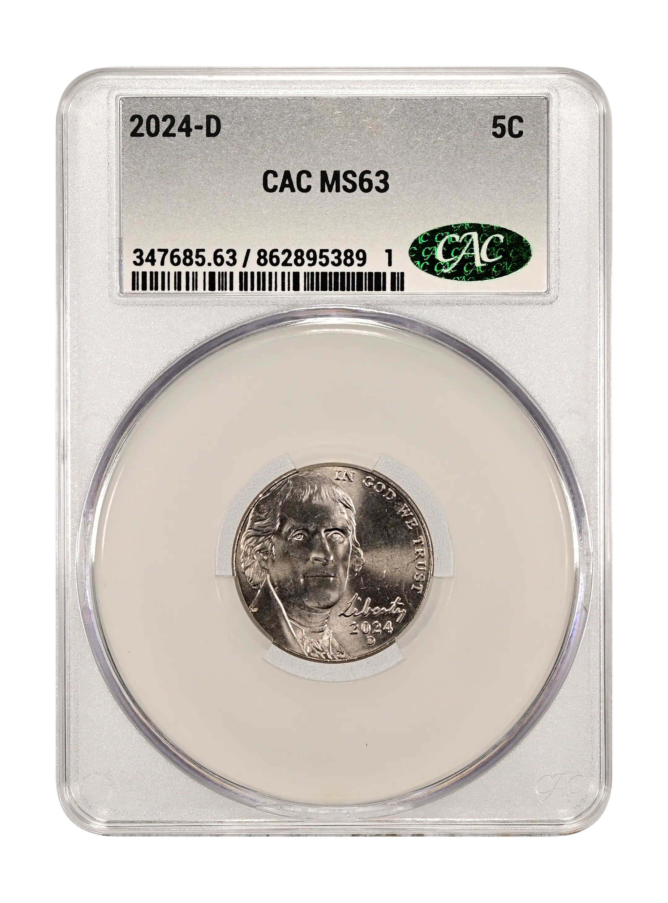 Reverse: The Jefferson home is prominently centered with the name MONTICELLO captioned below. The denomination FIVE CENTS is spelled out in half circle underneath and the words E PLURIBUS UNUM and UNITED STATES OF AMERICA appear at the top and bottom periphery. Designer's initial (FS) appear at the right base of the building.