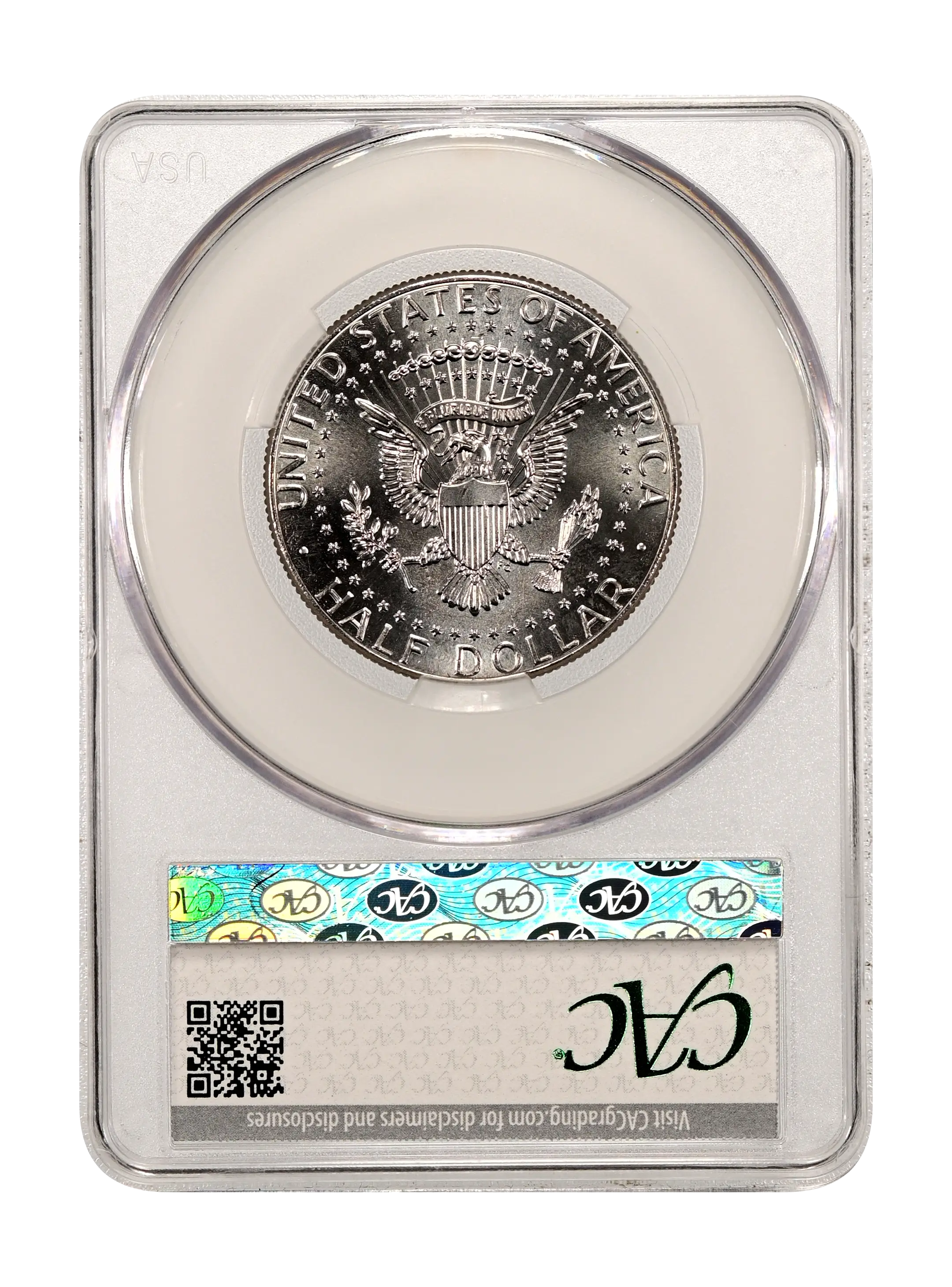 Reverse: The heraldic eagle holding arrows and branch of olive leaves with a full circle of stars around it. UNITED STATES OF AMERICA * HALF DOLLAR surround the periphery.