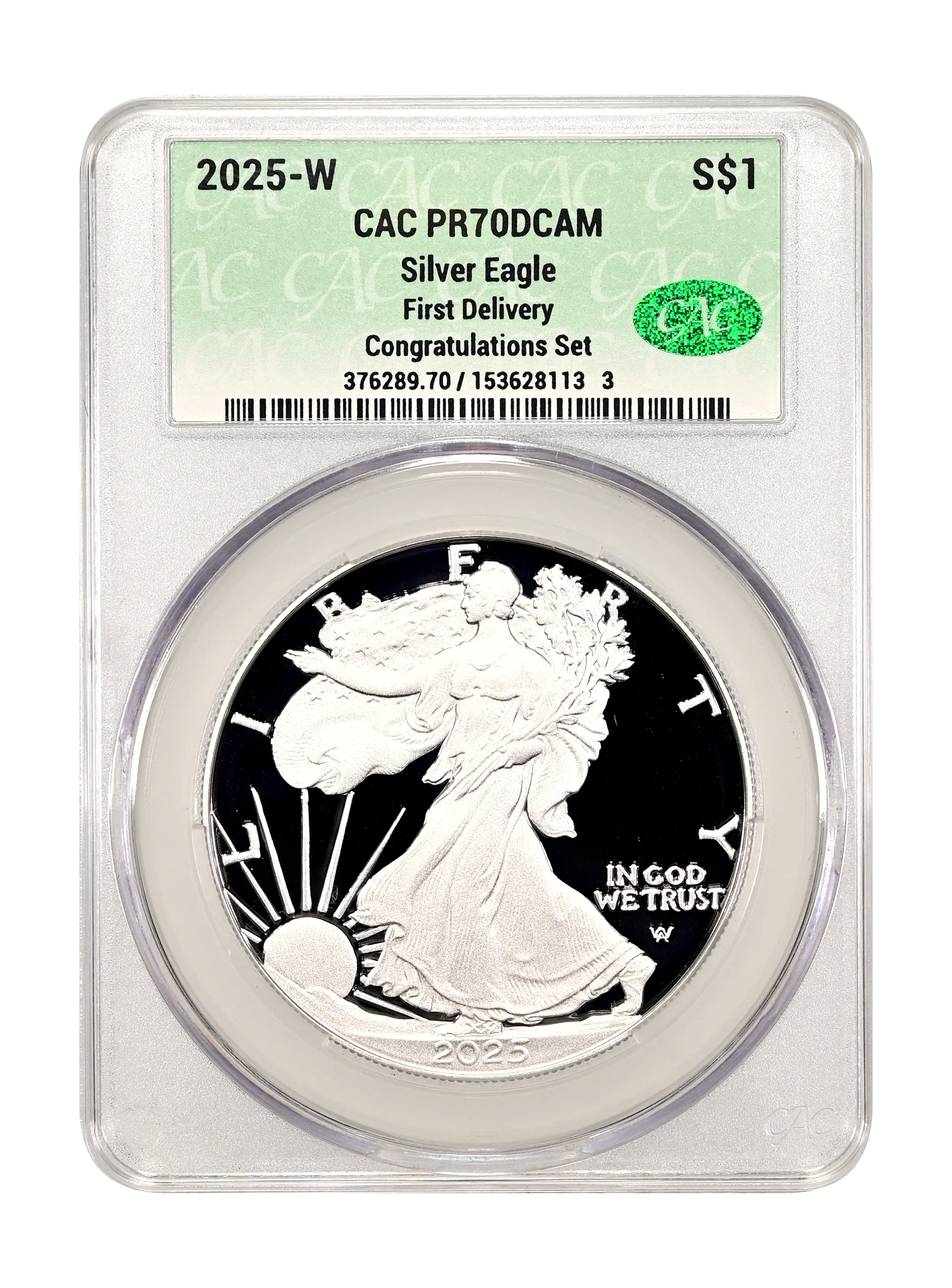 Greysheet Catalog Details (GSID: 376289) Introduced in 1986, the popular and now-iconic United States Mint American Eagle Silver Proof Coins are collector versions of the investment-grade American Eagle Silver Bullion Coins. These popular silver collectibles are struck at the United States Mint at West Point and have the “W” mint mark. The classic “Walking Liberty” design by Adolph A. Weinman featured on the coin’s obverse (heads) has long been a collector favorite. It depicts Liberty in full stride, enveloped in folds of the flag, with her right hand extended and branches of laurel and oak in her left. The United States Mint returned to its original historical assets to render a closer reflection of Weinman’s original version and detail that includes the addition of his traditional artist mark. Inscriptions are “LIBERTY,” “IN GOD WE TRUST,” and “2025.” A completely new reverse (tails) design was introduced in 2021. It features an eagle as it approaches a landing, carrying an oak branch as if to add it to a nest. Inscriptions are “UNITED STATES OF AMERICA,” “E PLURIBUS UNUM,” “1 OZ. FINE SILVER,” and “ONE DOLLAR.” Every coin includes a reeded edge variation for enhanced security and bears the “W” mint mark, reflecting its striking at the United States Mint at West Point. Each coin is placed in a black velvet, satin-lined presentation case and accompanied by a certificate of authenticity. The box is adorned with the official United States Mint seal; the outer sleeve incorporates an image of the obverse coin design. Whether starting a new collection or expanding your existing one, don’t miss the chance to own the stunning 2025 American Eagle One Ounce Silver Proof Coin (W).
