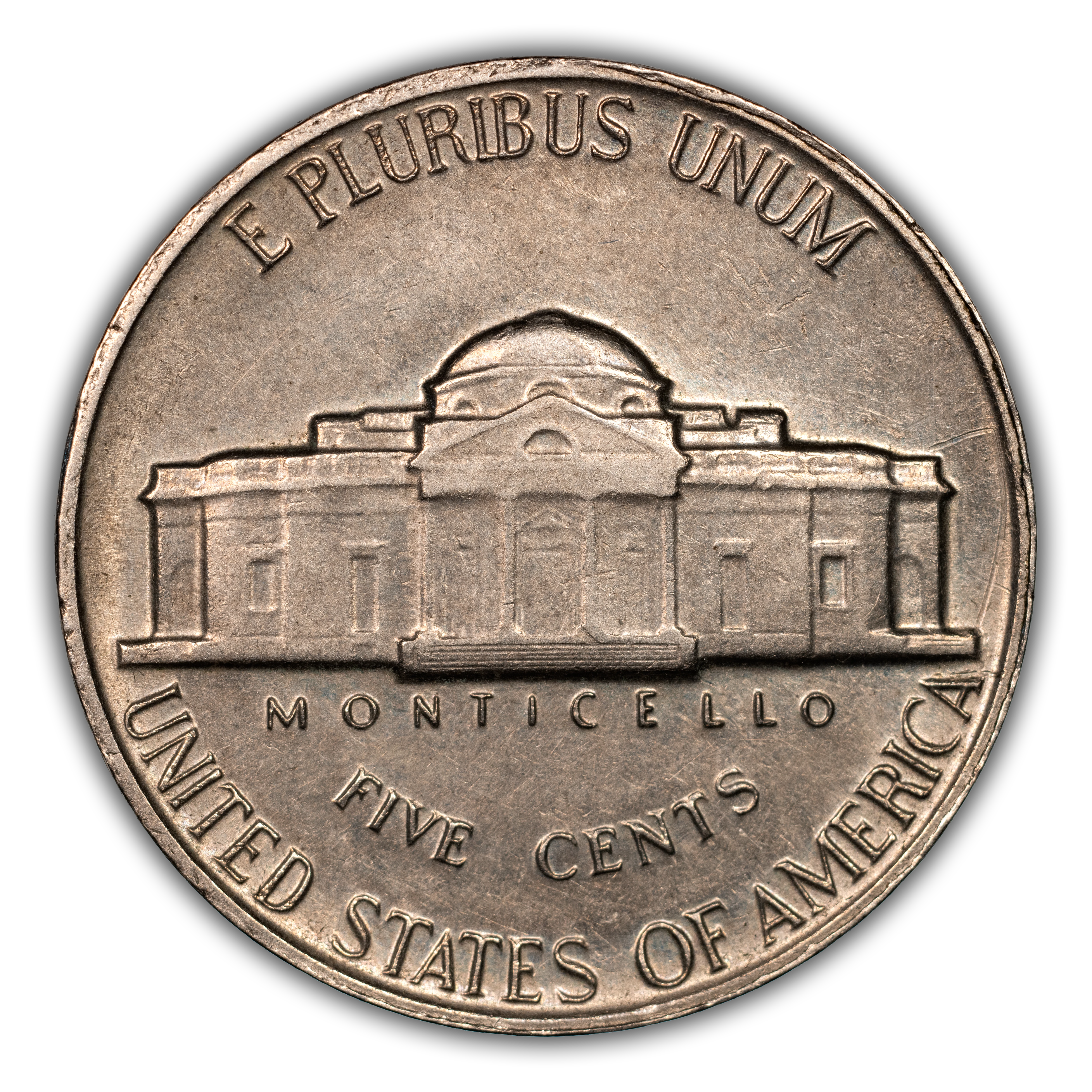 Reverse: The Jefferson home is prominently centered with the name MONTICELLO captioned below. The denomination FIVE CENTS is spelled out in half circle underneath and the words E PLURIBUS UNUM and UNITED STATES OF AMERICA appear at the top and bottom periphery. For the coins minted during WWII, the mintmark appears with a large letter above Monticello, to better designate these coins for their silver content.
