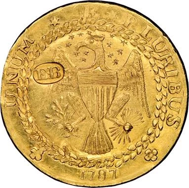 An original design was used on the 1787 Brasher doubloon with an eagle on one side and the arms of New York on the other. In addition to his impressed hallmark, Brasher's name appears in small letters on each of his coins. The unique 1787 gold half doubloon is struck from doubloon dies on an undersized planchet that weighs half as much as the larger coins.