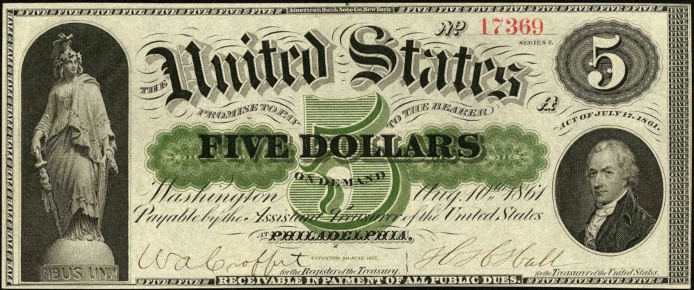 Demand notes are the only large-size United States notes to not display the Treasury Seal or names of the Treasurer and Register of the Treasury, and they bear just one serial number. They were issued with the following obligation: "The United States promise to pay to the bearer [X] dollars on demand Payable to the Assistant Treasurer of the United States at [New York, Philadelphia, Boston, Cincinnati, or St. Louis]. Receivable in payment of all public dues."