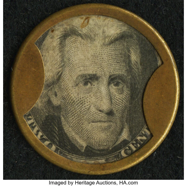 Postage stamps encased in a brassy-metal housing were invented by A.M. Gault in 1861 to alleviate a severe shortage of coinage. They were issued only in 1861 by a handful of private businesses. A piece of mica (clear plastic) was used to protect the stamp in its frame. A small number of these fascinating paper money-token crossover items survive today and very few in top quality condition. This is a collectible worthy of greater attention as values have not been well defined for items of superior condition.