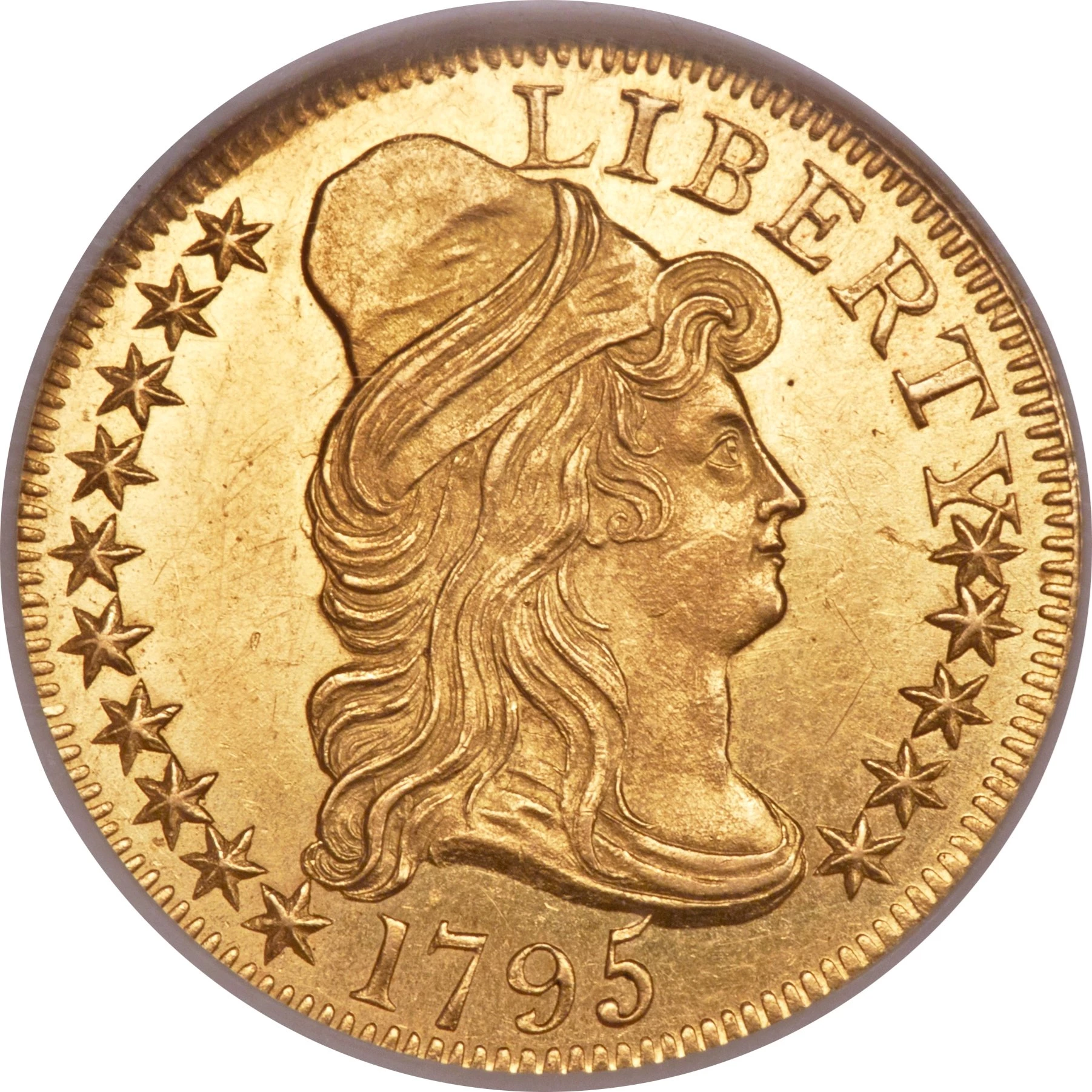 The earliest designs feature Liberty facing right with a draped bust motif. The obverses of the draped bust designs remained the same from 1795 to 1807. There are two significant reverse designs: small and large (heraldic) eagle. The small eagle has wings spread and bears an olive wreath in its beak and was issued from 1795-1798. In the years of 1795-1807 the large (heraldic) eagle with shield, was also issued.