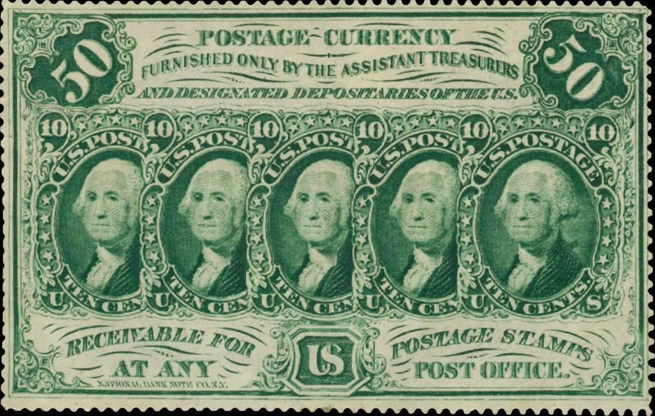 Five separate issues of fractional currency were printed, with the First Issue spanning from August 21, 1862 through May 27, 1863. These notes are called "postage currency" and included pieces printed in 5-cent, 10-cent, 25-cent, and 50-cent denominations.
