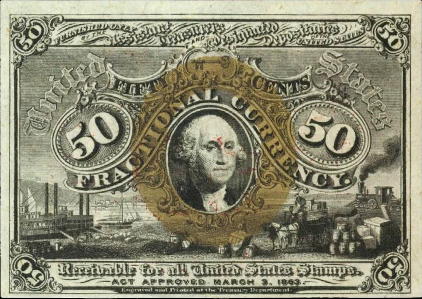 The Second Issue was printed from October 10, 1863 through February 23, 1867 in denominations consisting of 5 cents, 10 cents, 25 cents, and 50 cents. All of these notes have an obverse design of George Washington located within a bronze oval frame. The reverse of each denomination is printed in a distinct color.
