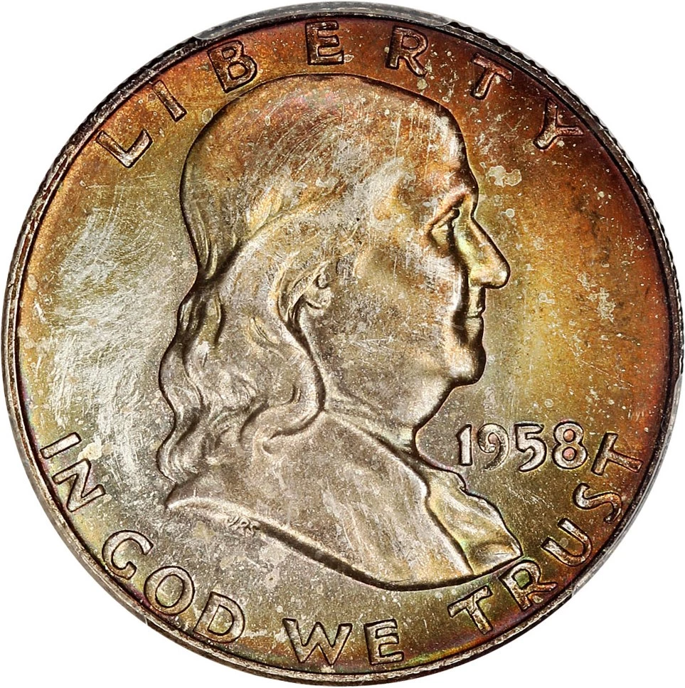 Starting in 2023, we have created separate pricing categories for Franklin half dollars that are toned (colored surfaces) vs. pure white surfaces. Unless a coin has spectacular toning, there is usually a significant premium for coins that are pure white, due to collector preference.