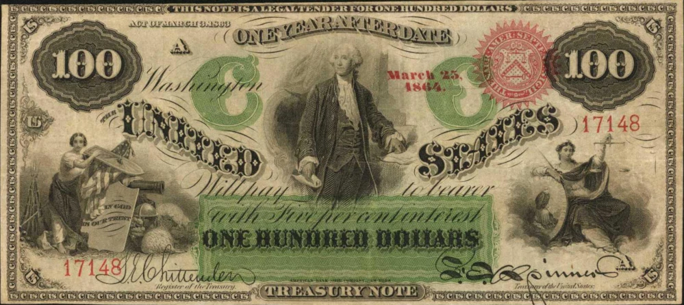 There are three kinds of interest bearing notes, including one-year notes, two-year notes, and three-year notes. One-year notes bore 5 percent interest and were issued in denominations ranging from $10 to $5,000. Two-year notes also bore 5 percent interest and were issued in denominations spanning from $50 to $1,000. Three-year notes carried 7-3/10 percent interest and were issued in denominations from $50 to $5,000.