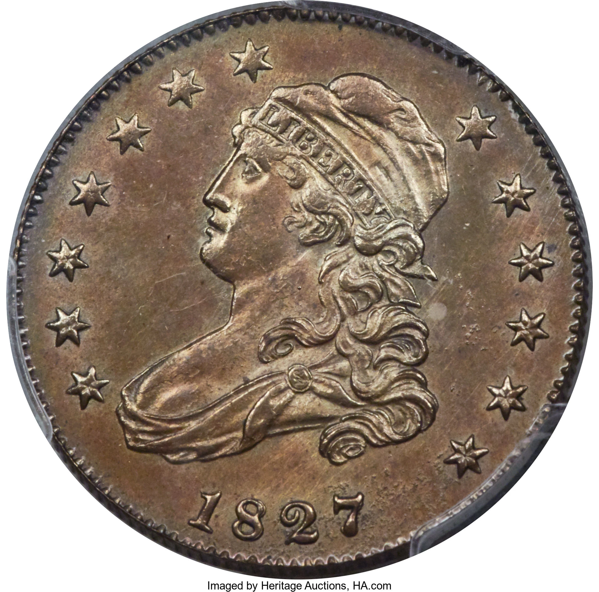 If any patterns were produced at the Philadelphia Mint in 1827, no record of them exists today. However, there is a copper version of the 1827 restrike quarter dollar from mismatched dies. Silver restrikes have been added as J-48a, these being very early restrikes from polished dies, with an appearance quite unlike the rusted-die restrikes normally seen.